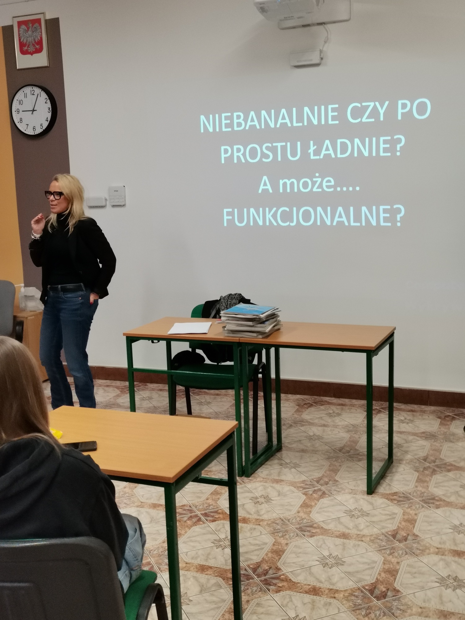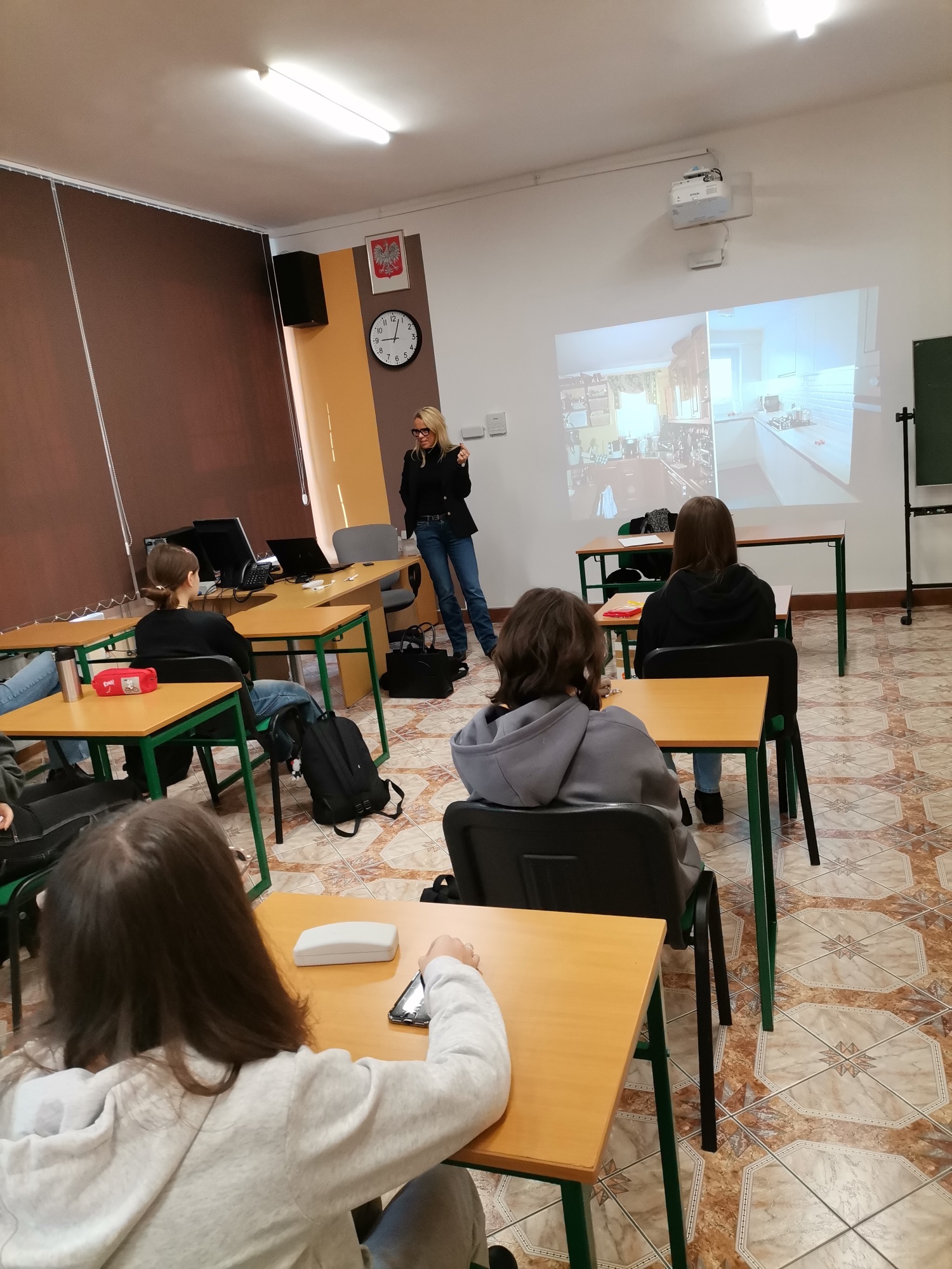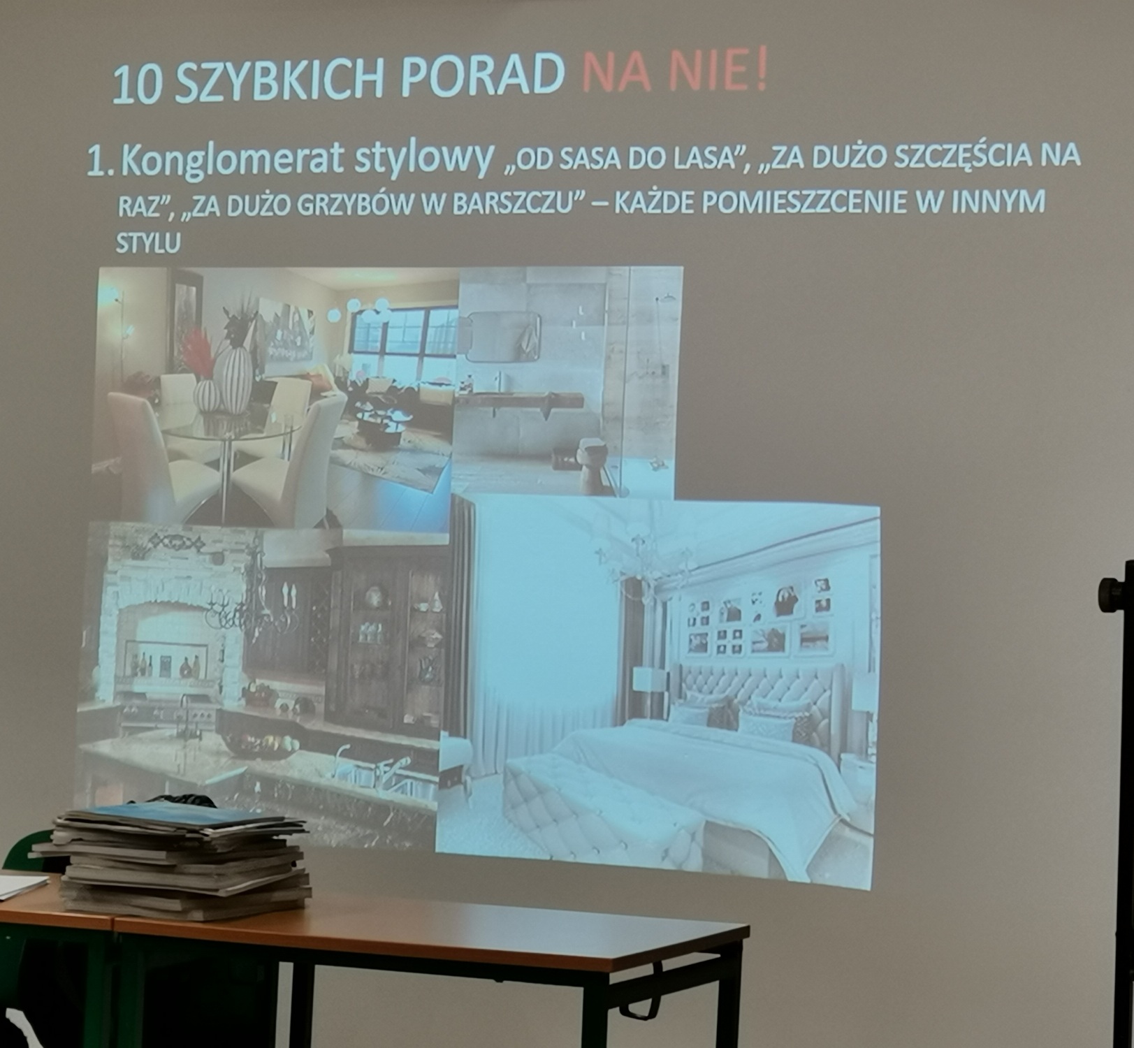 27 listopada 2023 r. uczennice i uczniowie z klas 1 E i 1 F z kierunku – Technik aranżacji wnętrz uczestniczyli w warsztatach prowadzonych przez wykładowcę Akademii Śląskiej panią doktor Barbarę Uherek- Bradecką. Temat warsztatów to: „Niebanalny dom - niebanalne wnętrze”. Na początku zajęć było wprowadzenie - co to jest w ogóle architektura wnętrz i na czym należy się skupić projektując. Hasło przewodnie architekta wnętrz to: nie szkodzić, nie kopiuj (z katalogu), nie ściemniaj (raczej jasne barwy), nie zasłaniaj (bez firan, zasłon), nie wystawiaj (wszystkich swoich pamiątek z podróży). Pokazane zostały błędy w aranżacji wnętrz na różnych przykładach, w różnych stylach mieszkania a także możliwości zastosowań różnych materiałów. W drugiej części warsztatów młodzież sama projektowała pokój naklejając na kartkę wycięte z katalogów elementy wyposażenia wnętrza. Można zauważyć dużą różnorodność w podejściu do tematu na załączonych zdjęciach. Zajęcia możemy uznać za bardzo udane. Na zakończenie warsztatów pani doktor zaprosiła młodzież do uczestnictwa w 4 DESIGN DAYS, w terminie 25 - 28.01.2024 r. w Międzynarodowym Centrum Kongresowym w Katowicach.
