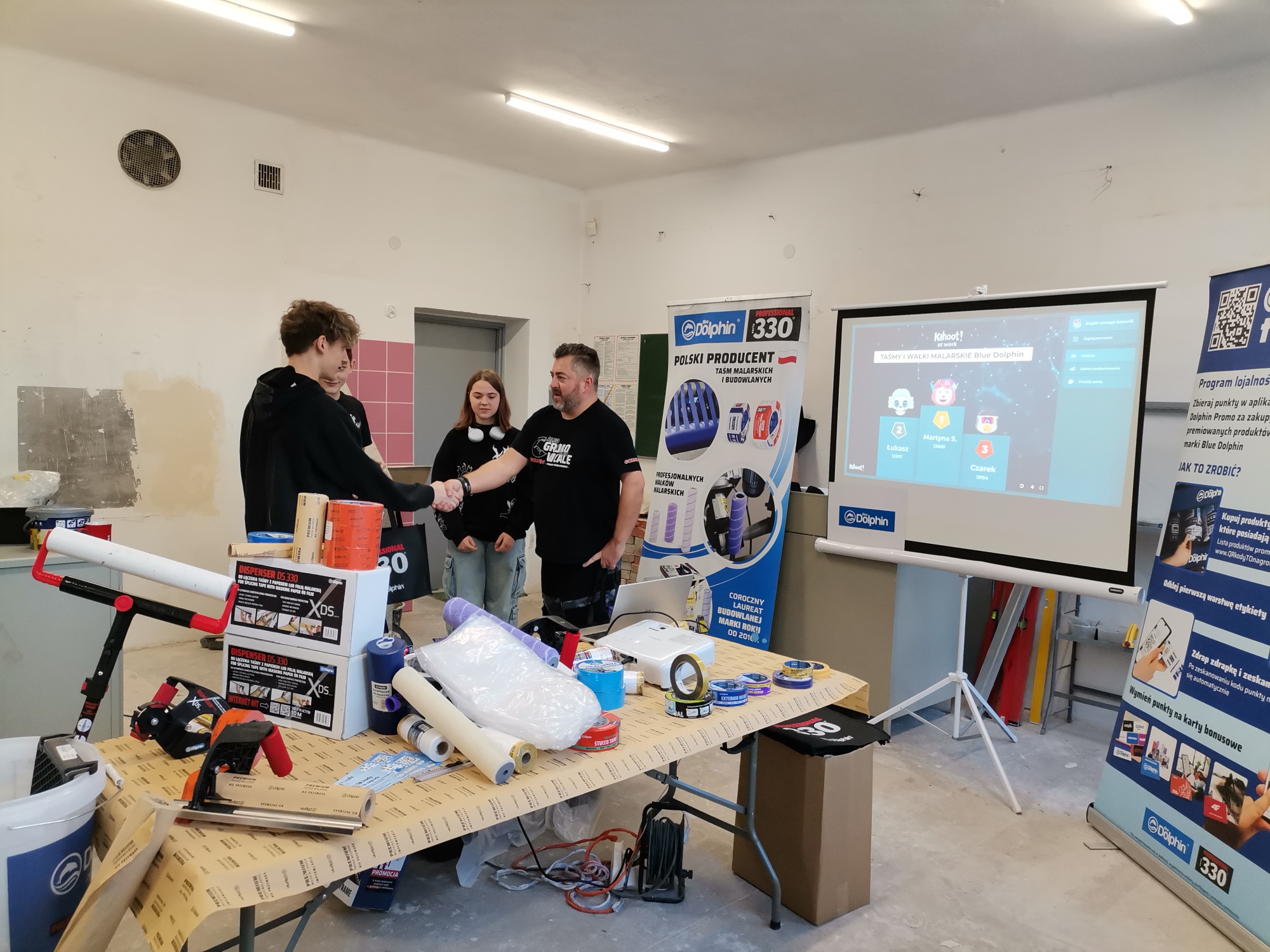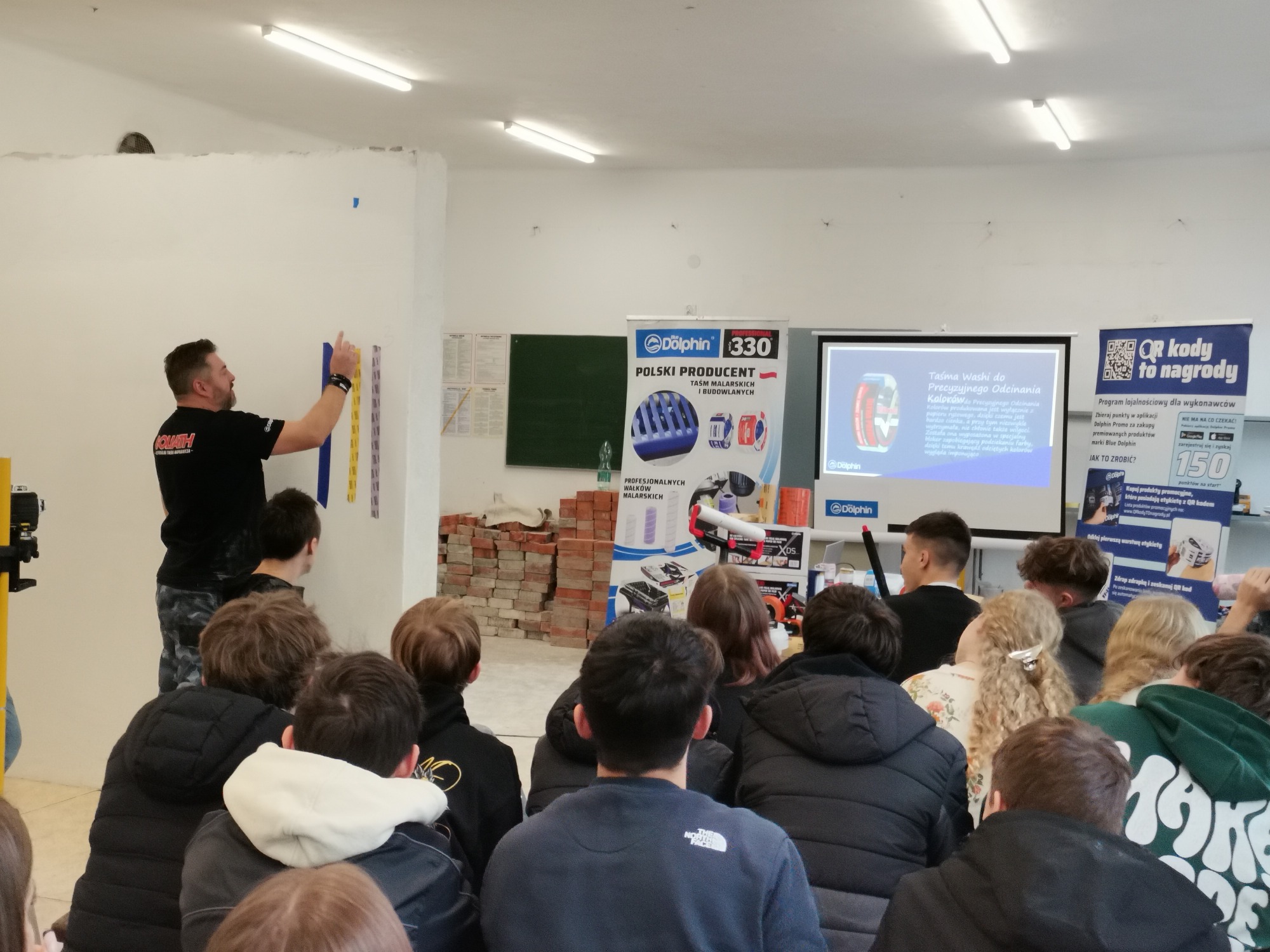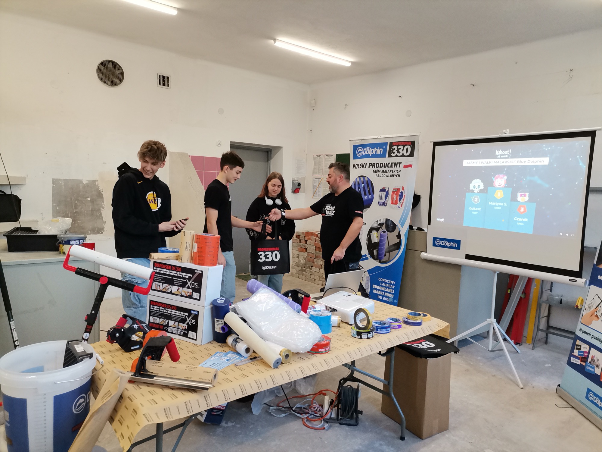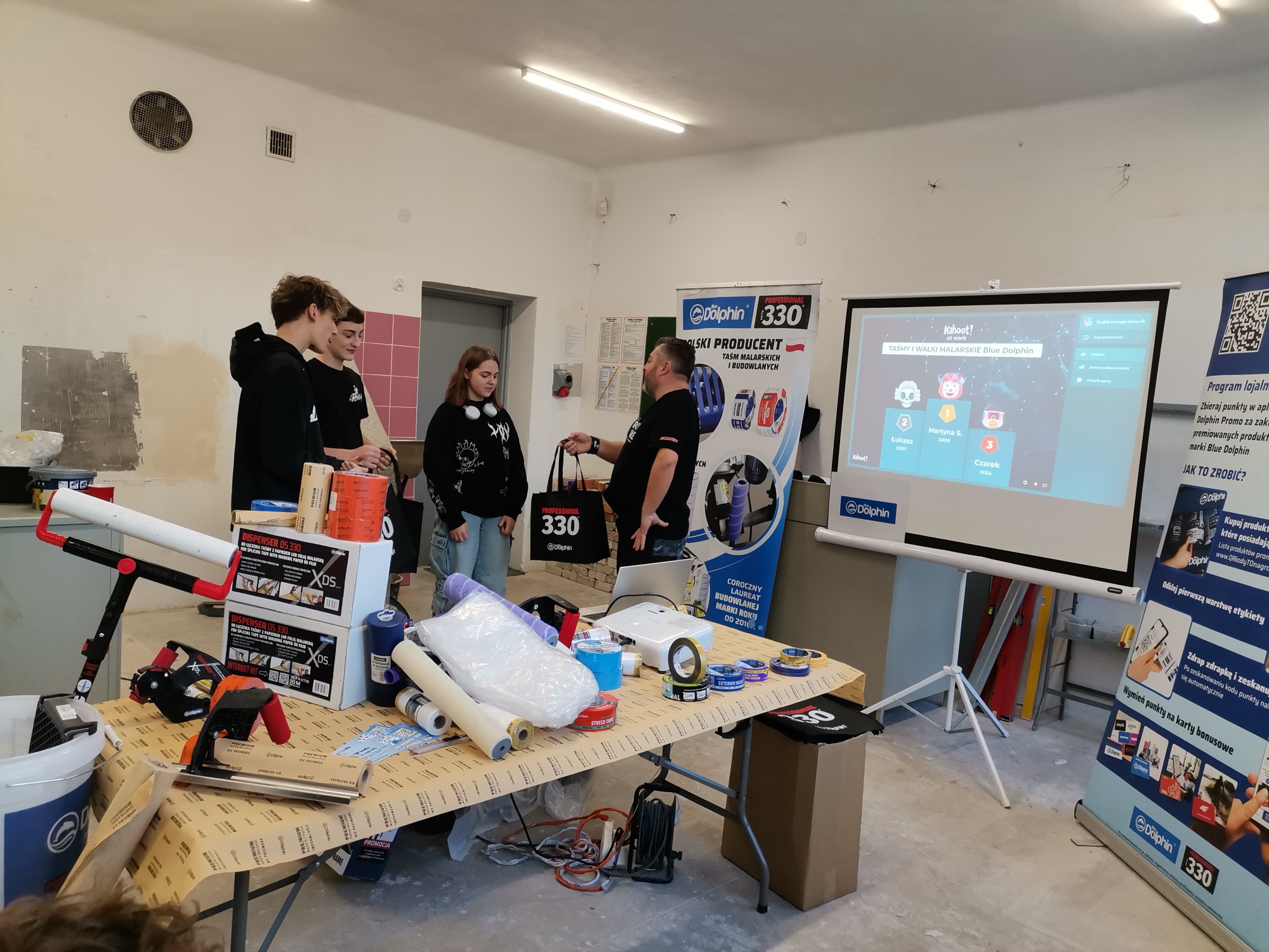 18 grudnia 2024 r. gościliśmy na warsztatach pana Sebastiana B. z firmy Blue Dolphin, który przybliżył uczniom produkty marki Blue Dolphin. Podczas szkolenia zostały przedstawione zagadnienia z zakresu: rodzaju taśm, wałków, pędzli i narzędzi malarskich z uwzględnieniem ich zastosowania; zabezpieczania powierzchni papierem malarskim oraz maskerami; zastosowania w praktyce systemu do 2 x szybszego malowania.Czyli były: część teoretyczna, quizy, nagrody jak również część praktyczna. Efekty wykonanych zadań możemy podziwiać. Było to bardzo konkretne i motywujące spotkanie. Czekamy na kolejne warsztaty dla innych klas.