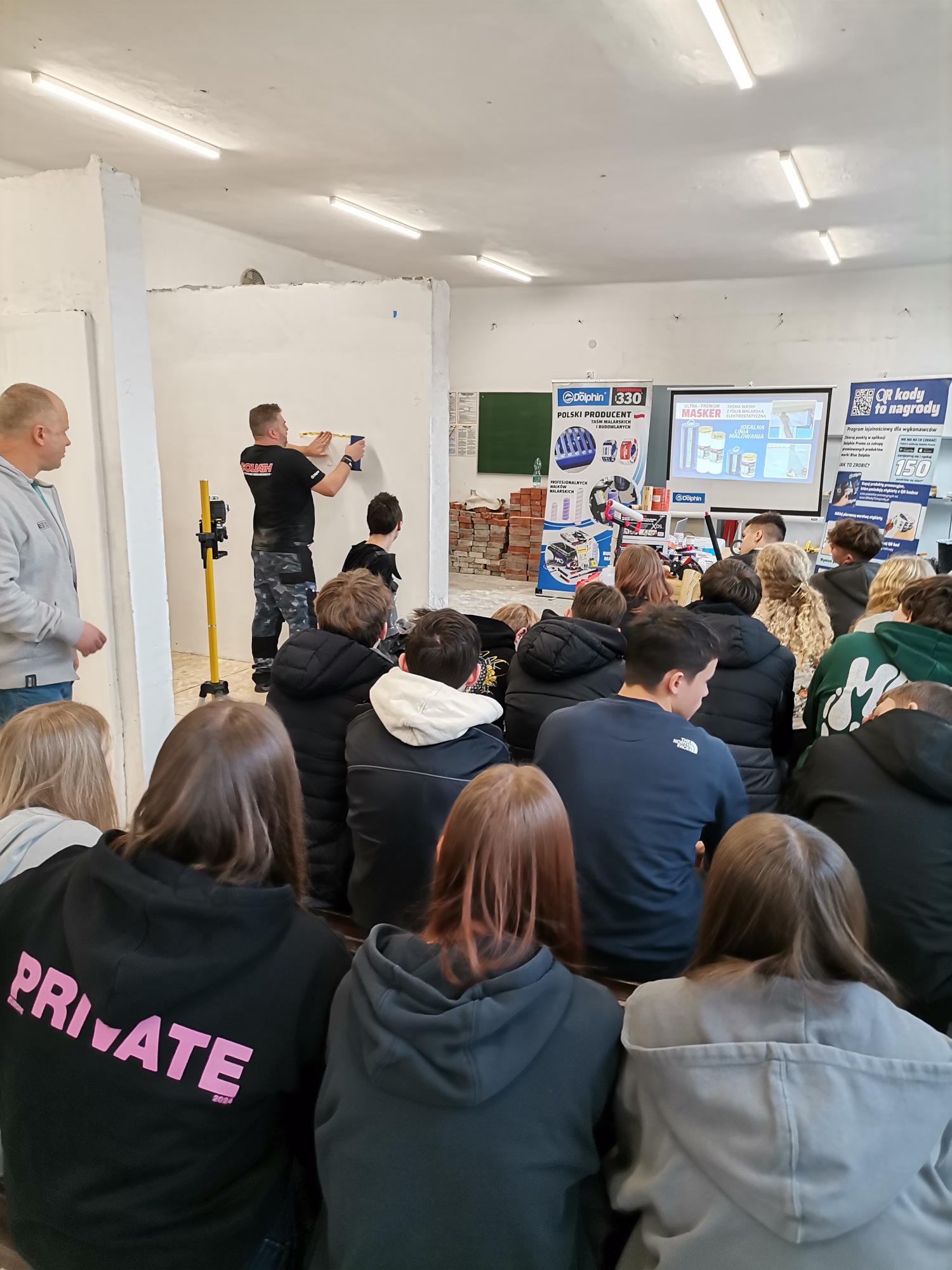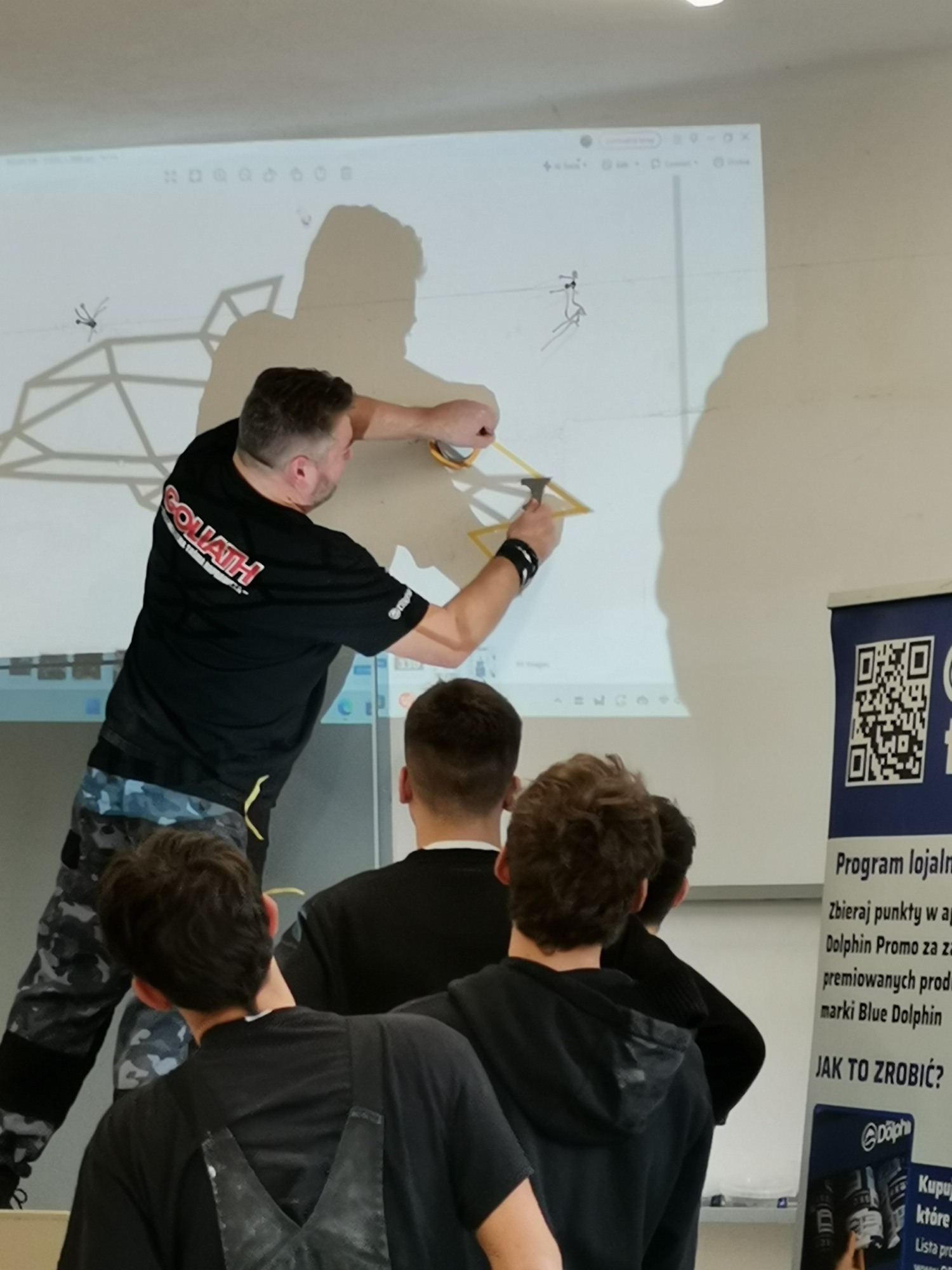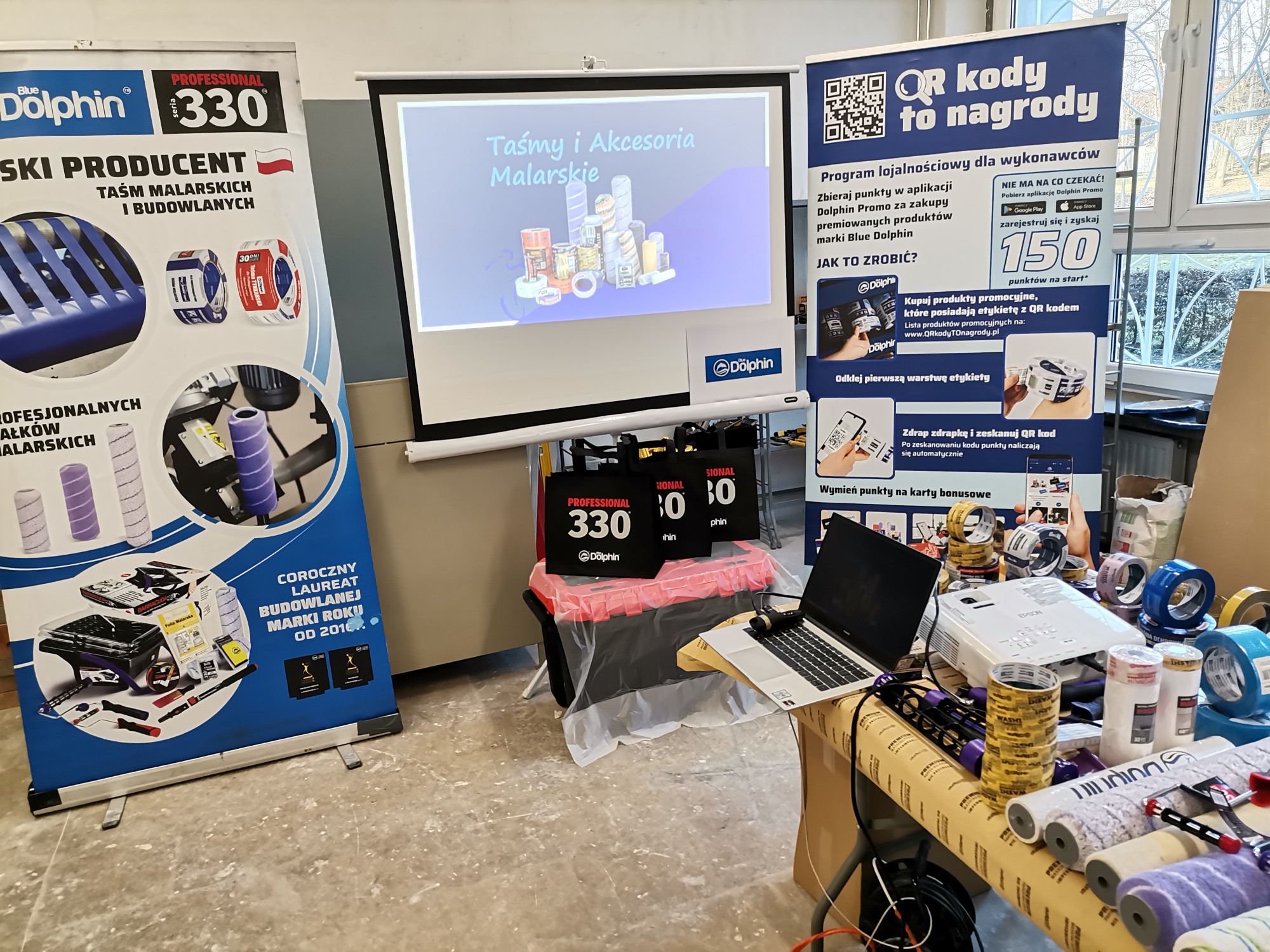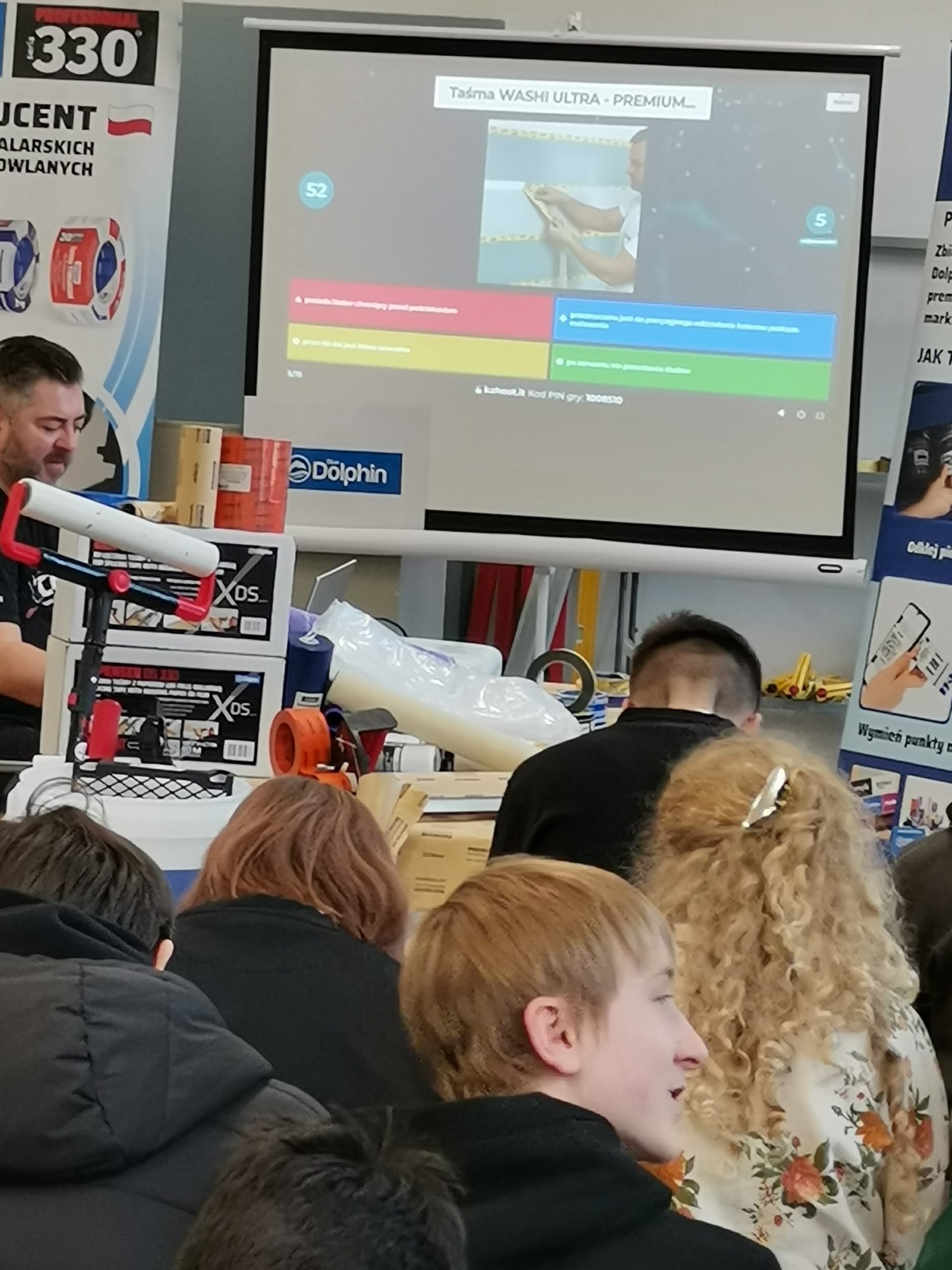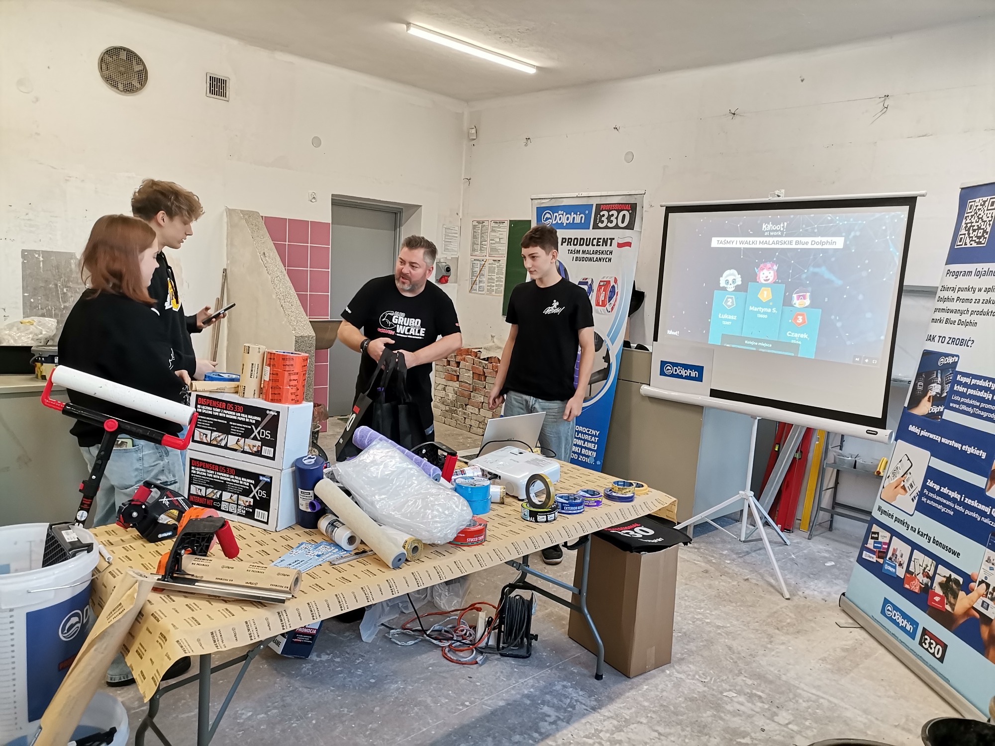 18 grudnia 2024 r. gościliśmy na warsztatach pana Sebastiana B. z firmy Blue Dolphin, który przybliżył uczniom produkty marki Blue Dolphin. Podczas szkolenia zostały przedstawione zagadnienia z zakresu: rodzaju taśm, wałków, pędzli i narzędzi malarskich z uwzględnieniem ich zastosowania; zabezpieczania powierzchni papierem malarskim oraz maskerami; zastosowania w praktyce systemu do 2 x szybszego malowania.Czyli były: część teoretyczna, quizy, nagrody jak również część praktyczna. Efekty wykonanych zadań możemy podziwiać. Było to bardzo konkretne i motywujące spotkanie. Czekamy na kolejne warsztaty dla innych klas.