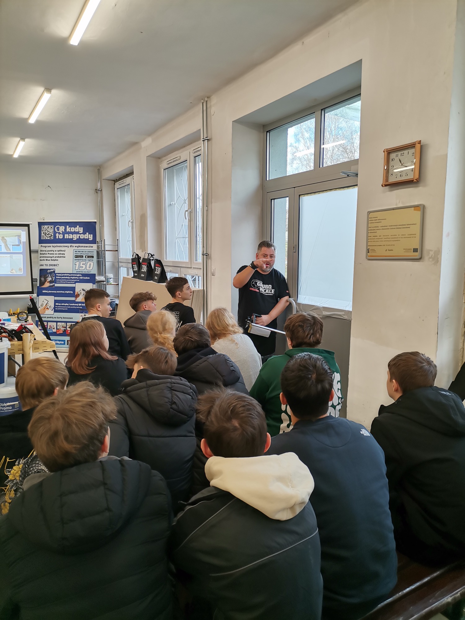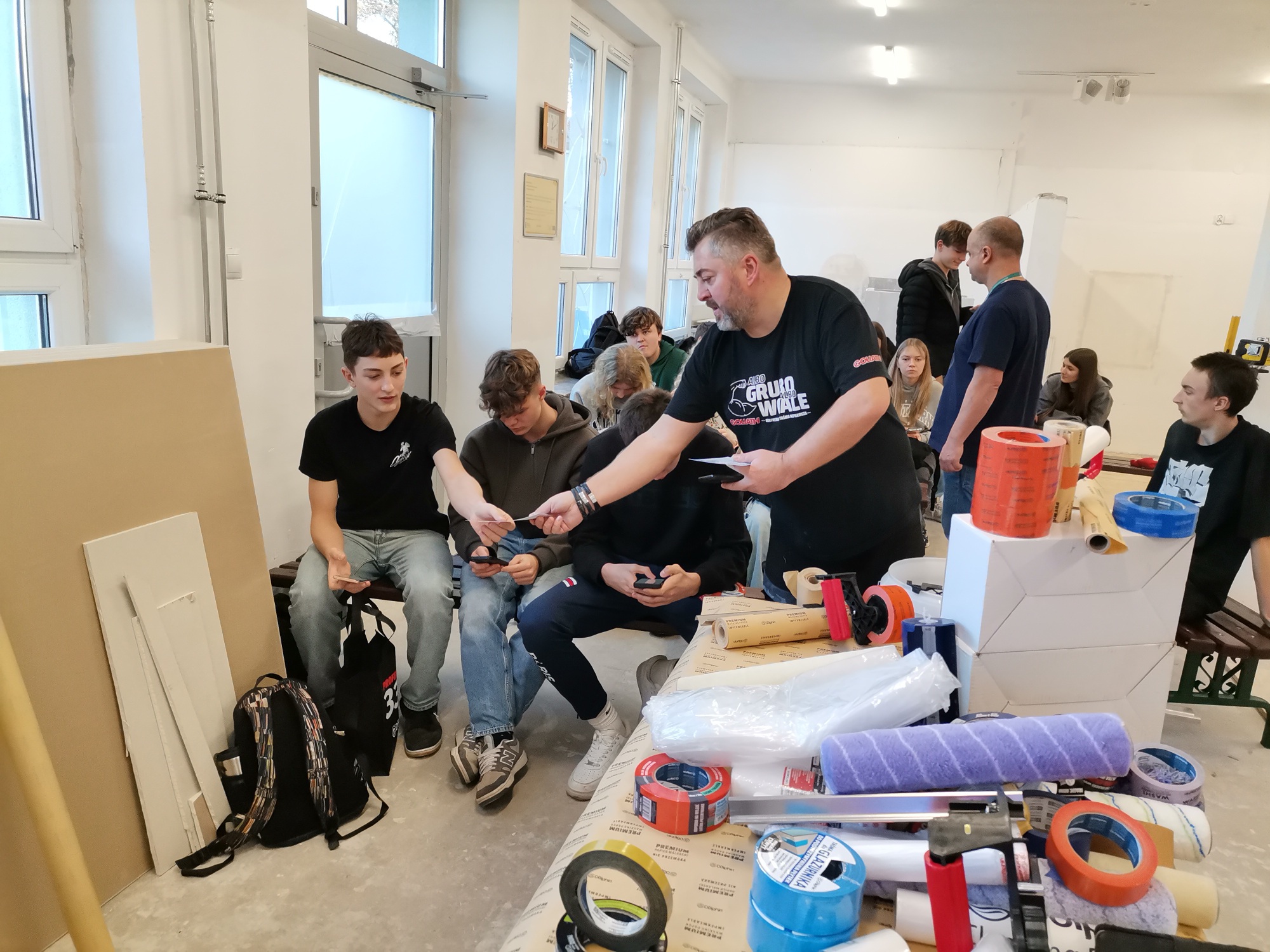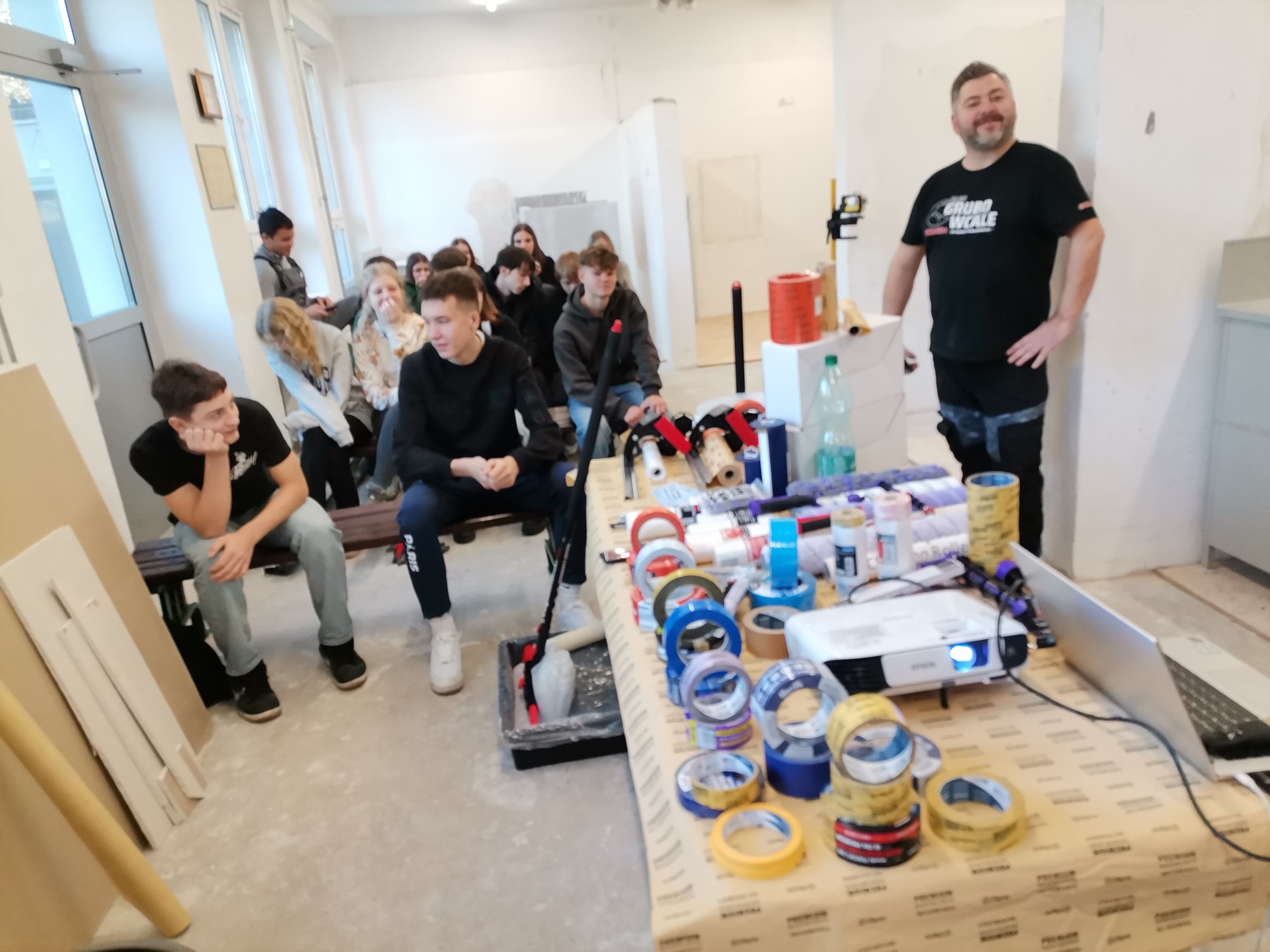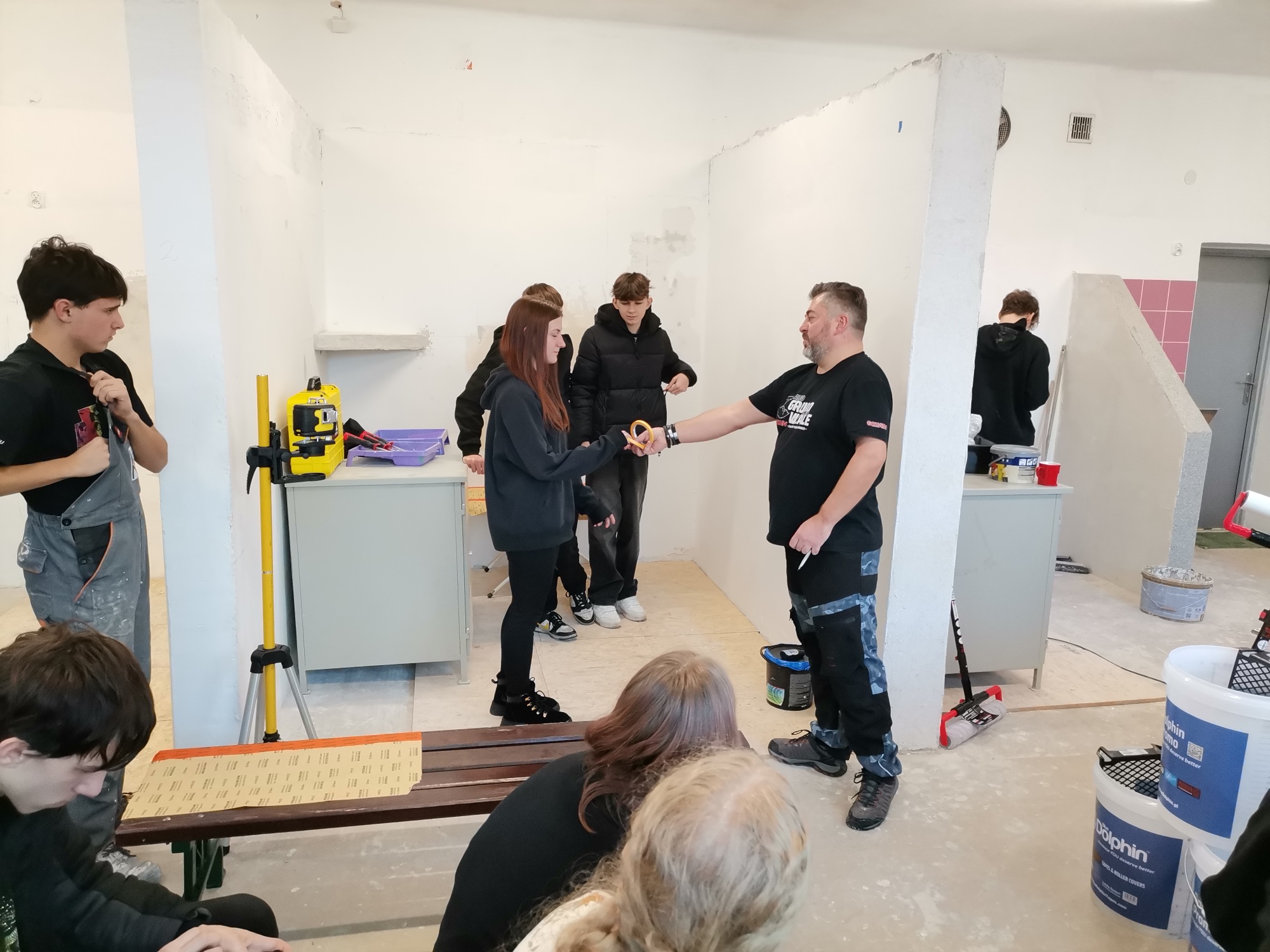 18 grudnia 2024 r. gościliśmy na warsztatach pana Sebastiana B. z firmy Blue Dolphin, który przybliżył uczniom produkty marki Blue Dolphin. Podczas szkolenia zostały przedstawione zagadnienia z zakresu: rodzaju taśm, wałków, pędzli i narzędzi malarskich z uwzględnieniem ich zastosowania; zabezpieczania powierzchni papierem malarskim oraz maskerami; zastosowania w praktyce systemu do 2 x szybszego malowania.Czyli były: część teoretyczna, quizy, nagrody jak również część praktyczna. Efekty wykonanych zadań możemy podziwiać. Było to bardzo konkretne i motywujące spotkanie. Czekamy na kolejne warsztaty dla innych klas.