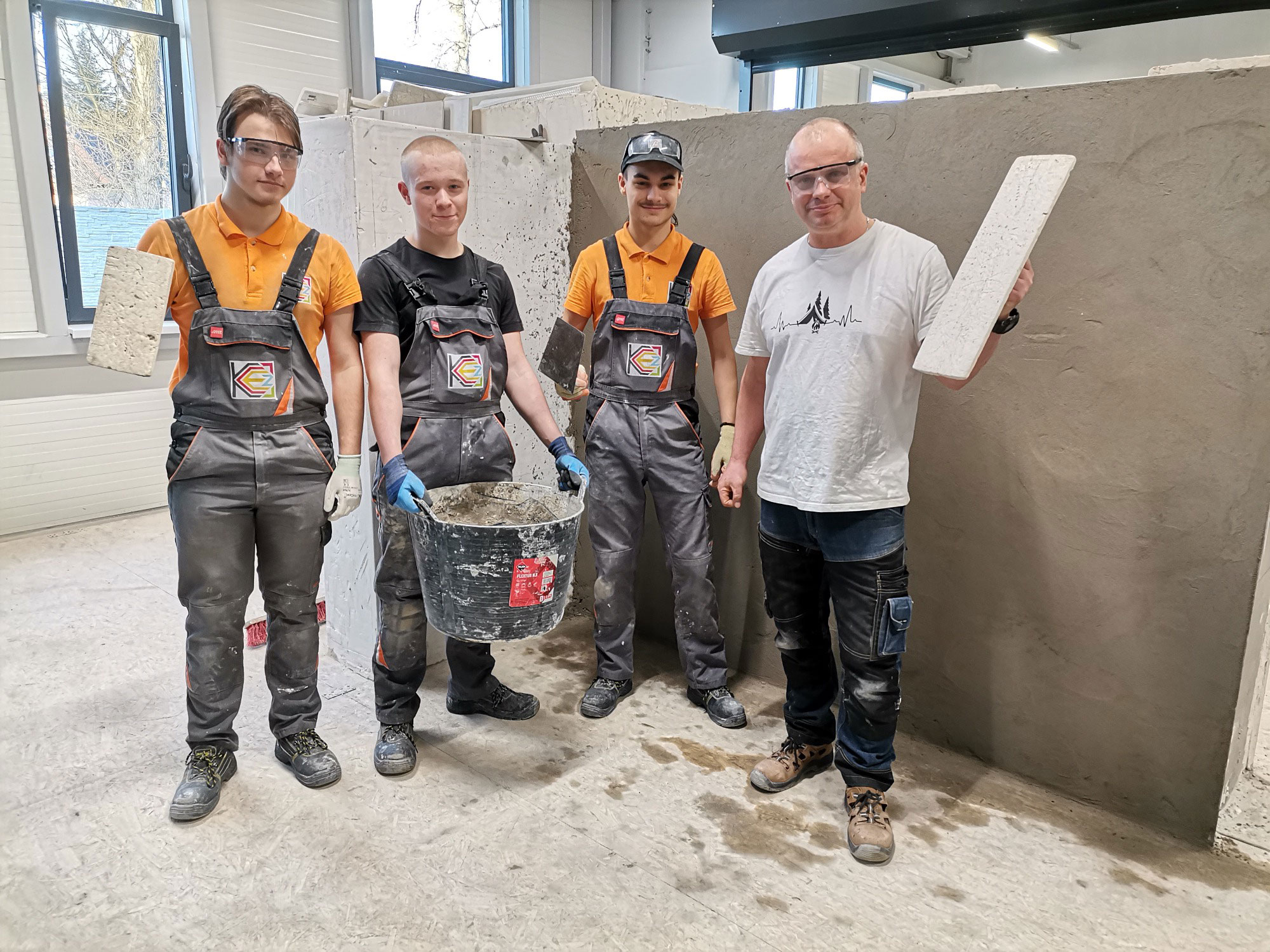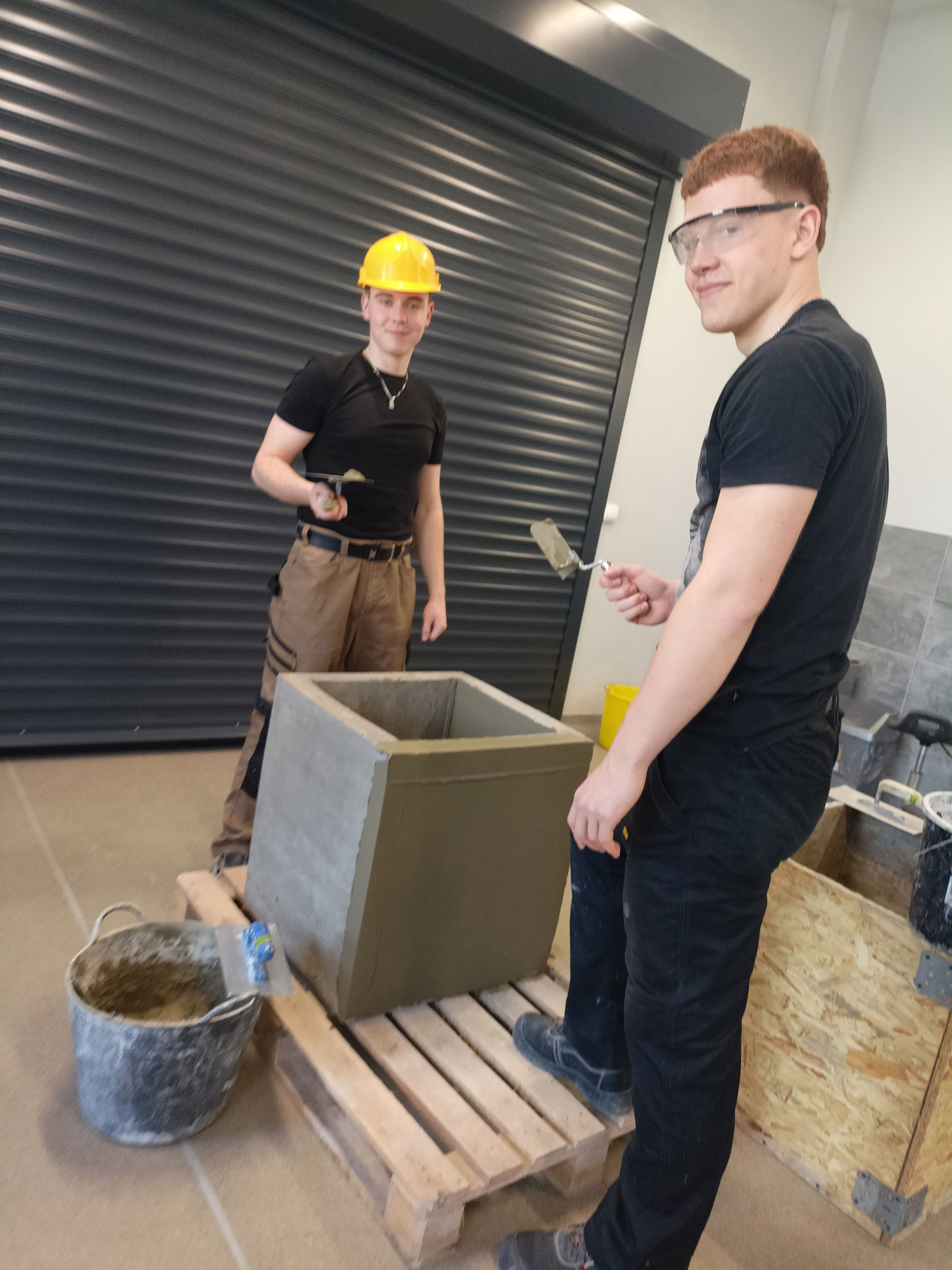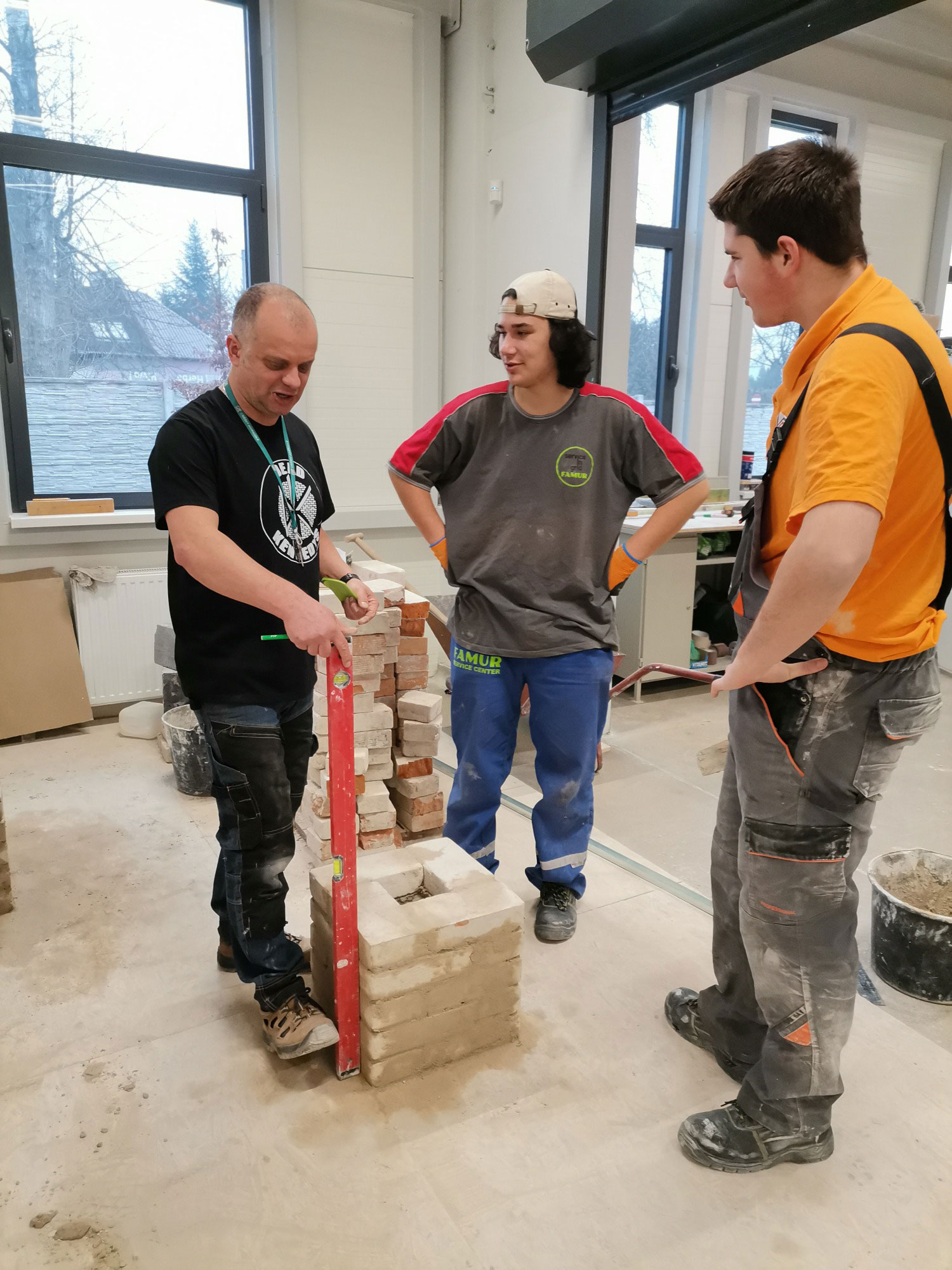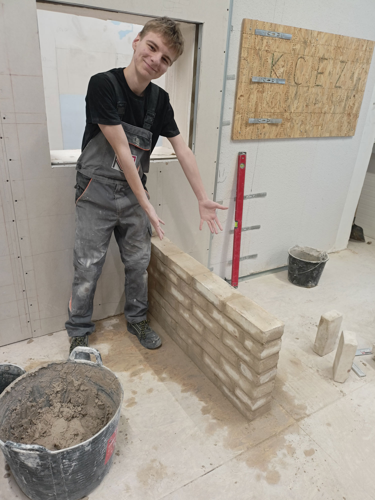 Kolejna relacja z naszej hali gdzie młodzież z klas budowlanych technikum i szkoły branżowej wytrwale doskonali swoje umiejętności w różnych odsłonach prac budowlanych. Powstaje zbrojenie do donicy i następny jej etap, kolejne rozwiązania murowanej ściany czy komina, „wygładzanie” ściany czy okładzina z płytek mineralnych. Przy pracy pamiętają o bieżącej kontroli pionów i poziomów, a efekty ich pracy są więcej niż zadowalające, a przede wszystkim widać zadowolenie z pracy.