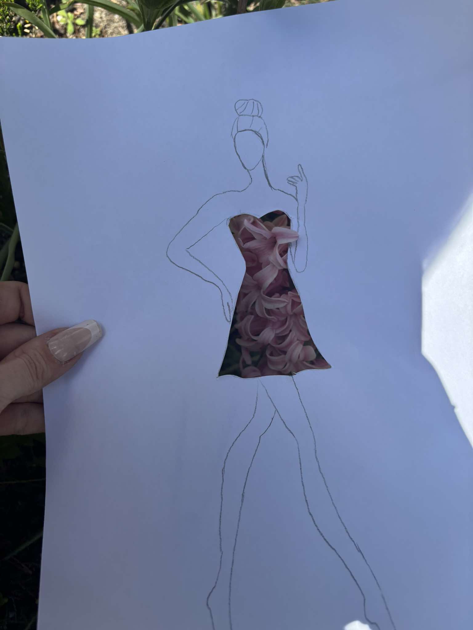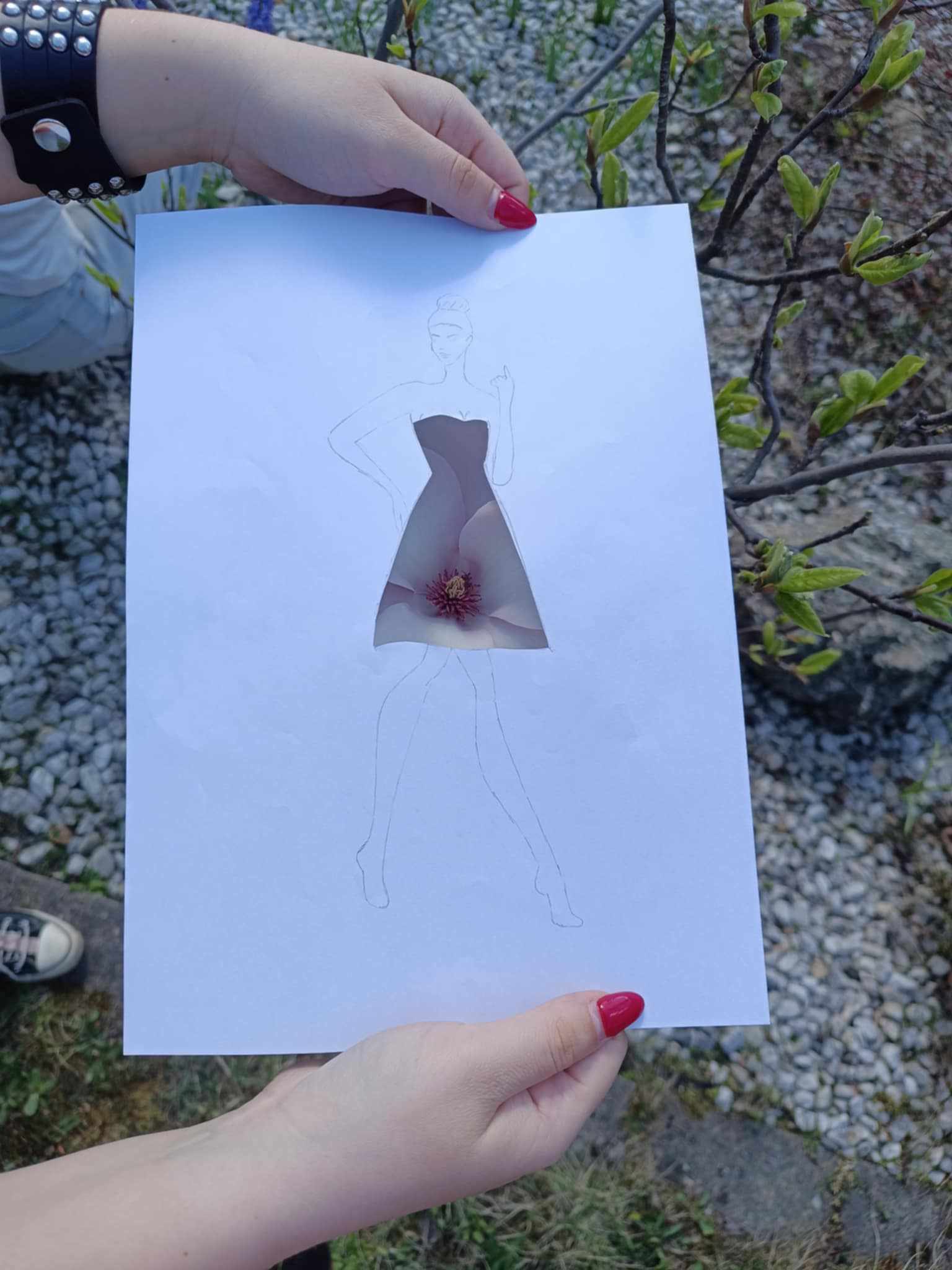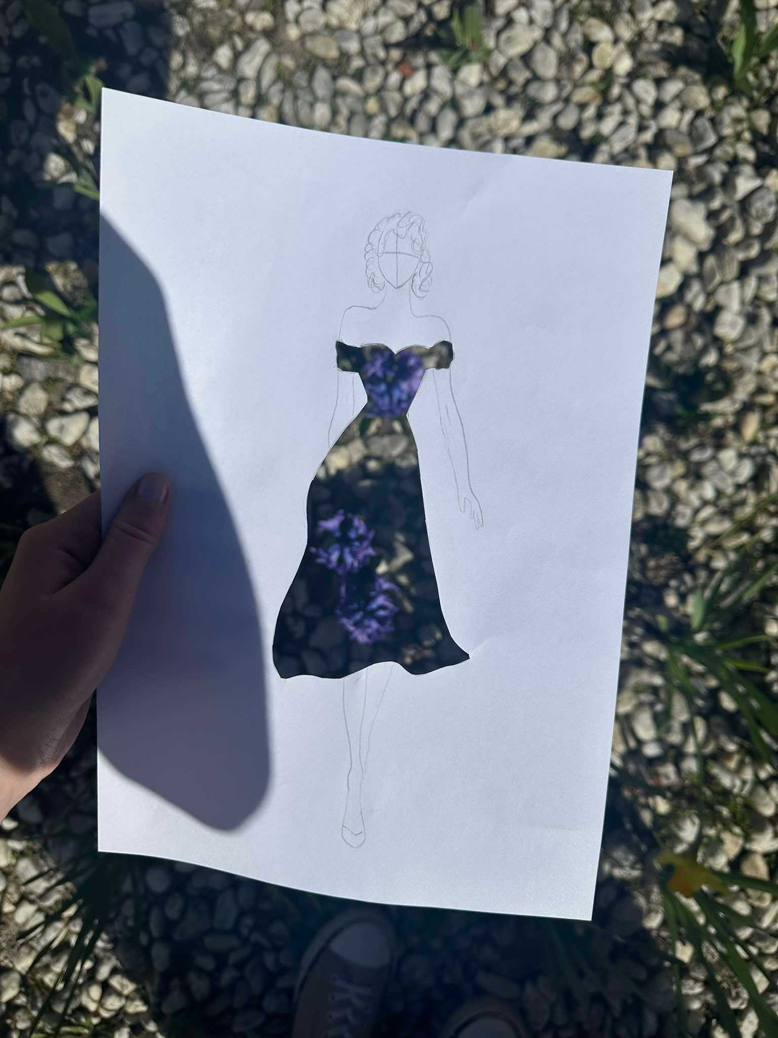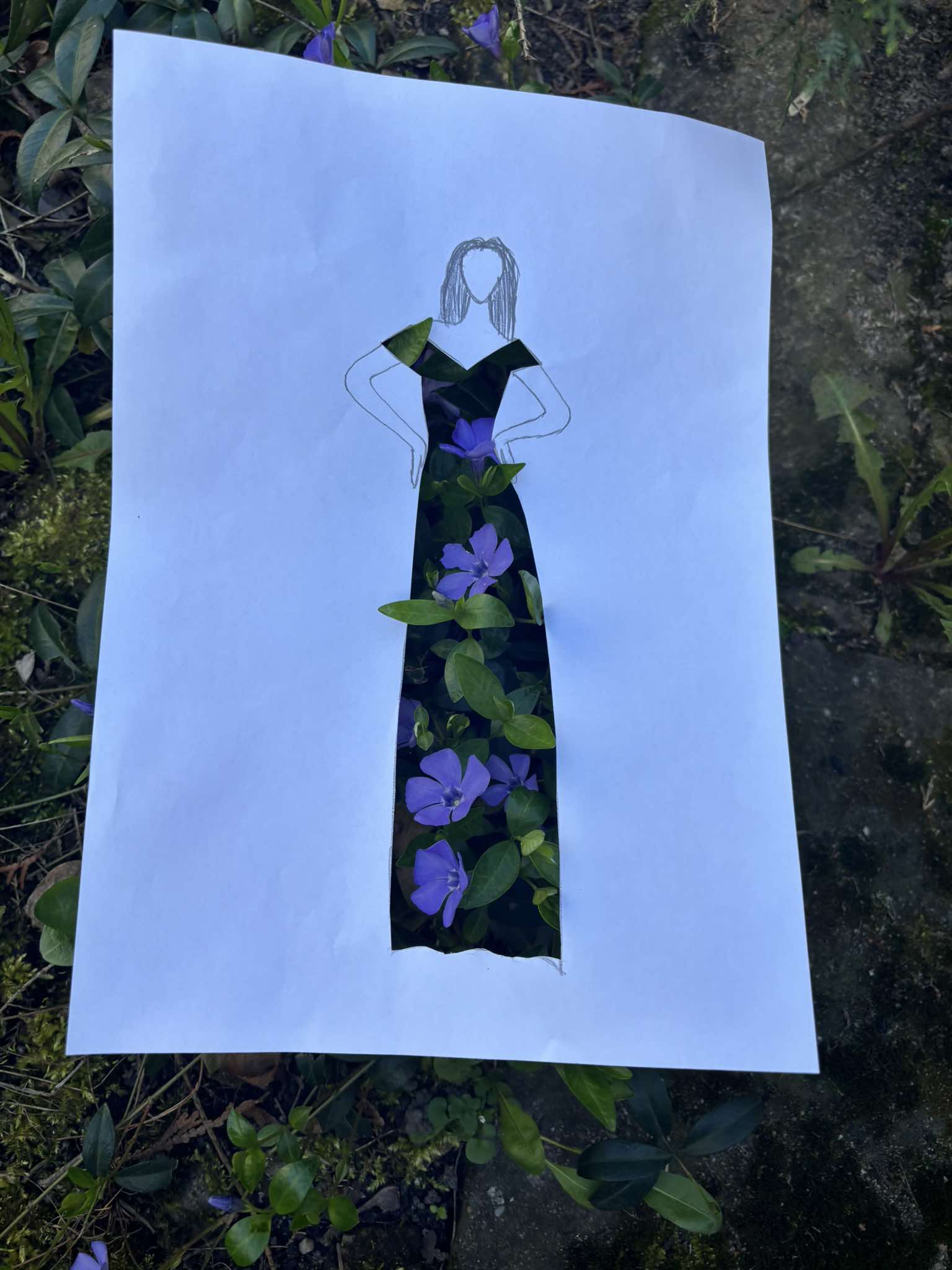 Uczniowie kierunku **technik przemysłu mody** pokazują, że moda nie zna granic! Na zdjęciu możecie zobaczyć efekt połączenia rysunku z naturą – projekt sukienki, w którym rolę materiału odgrywają... kwiaty, rośliny i inne 🌿👗
