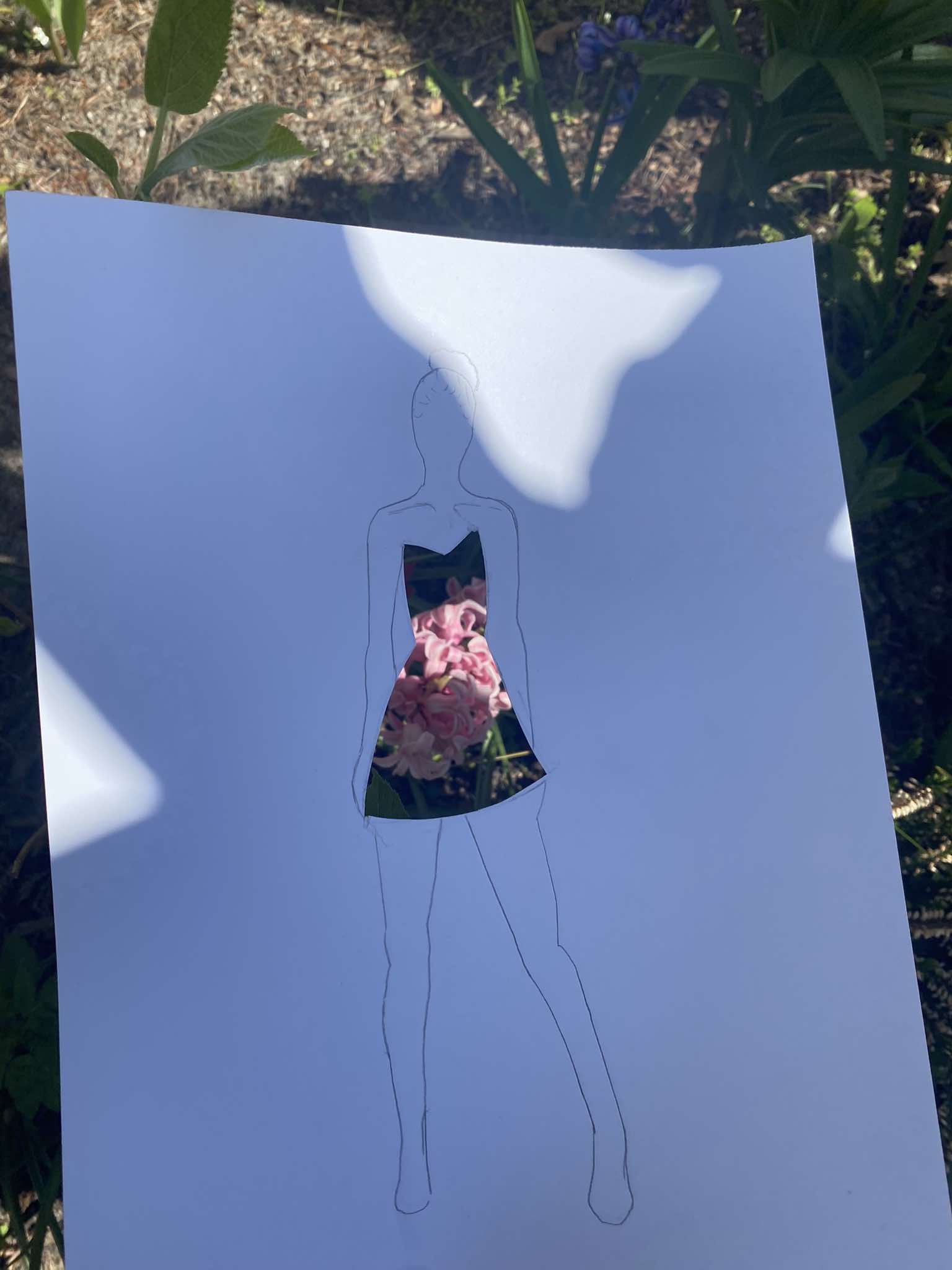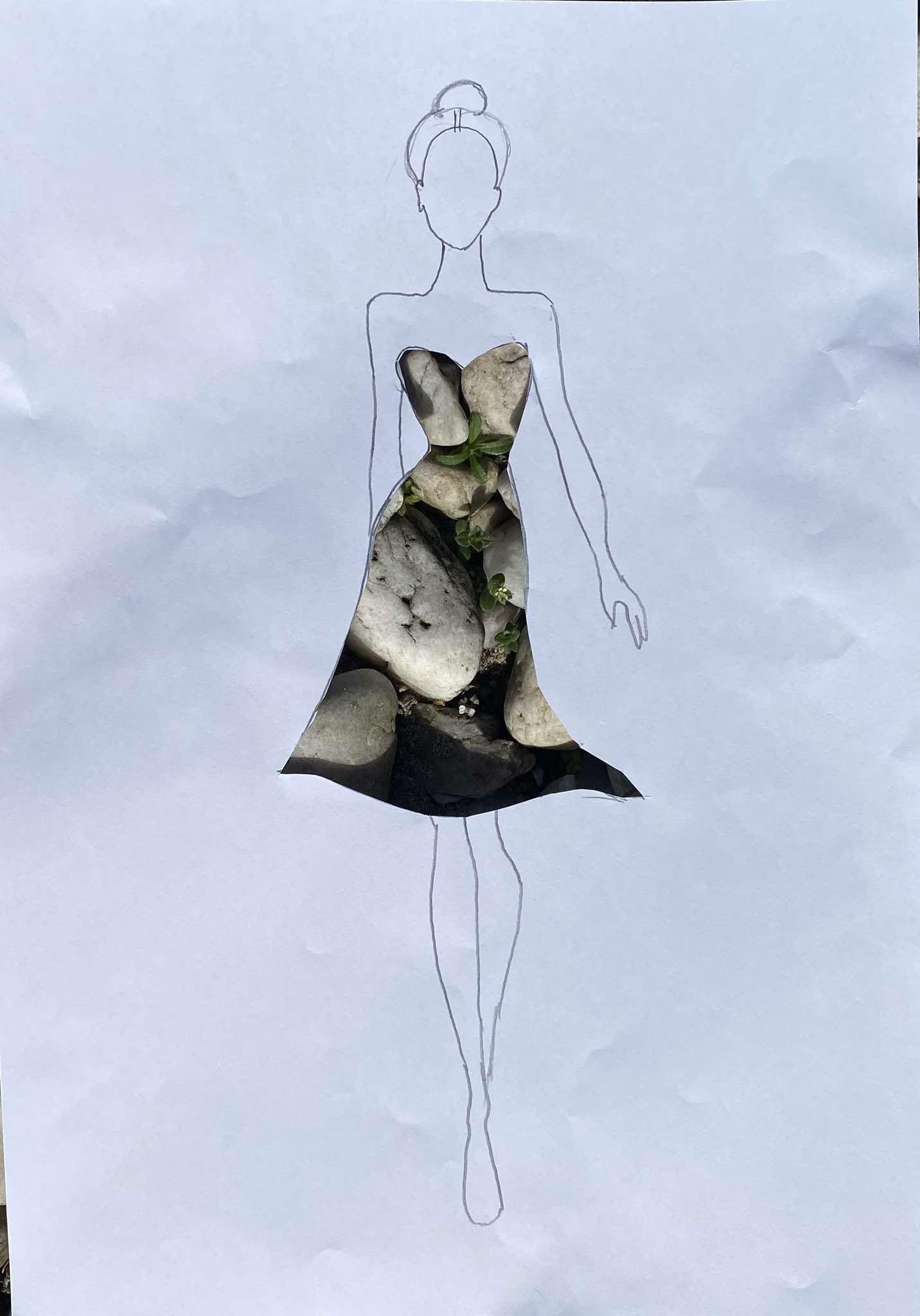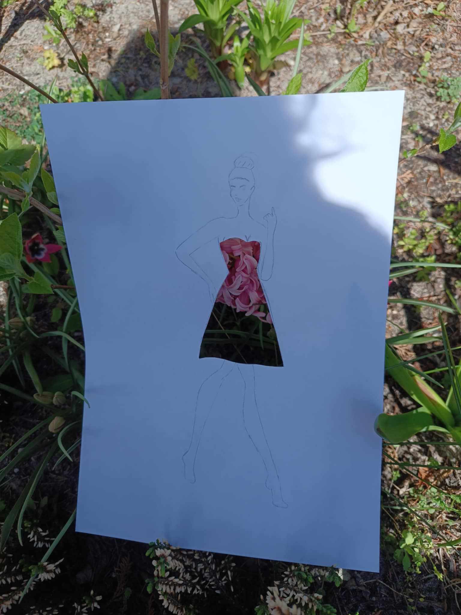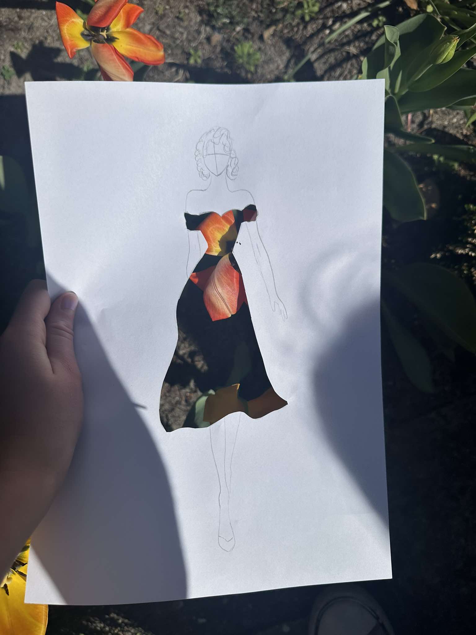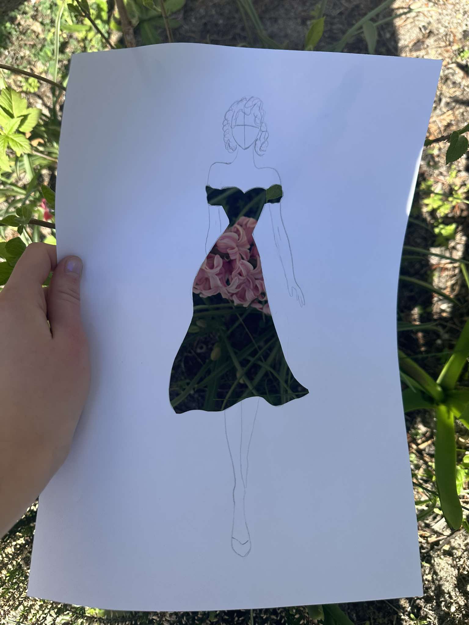 Uczniowie kierunku **technik przemysłu mody** pokazują, że moda nie zna granic! Na zdjęciu możecie zobaczyć efekt połączenia rysunku z naturą – projekt sukienki, w którym rolę materiału odgrywają... kwiaty, rośliny i inne 🌿👗