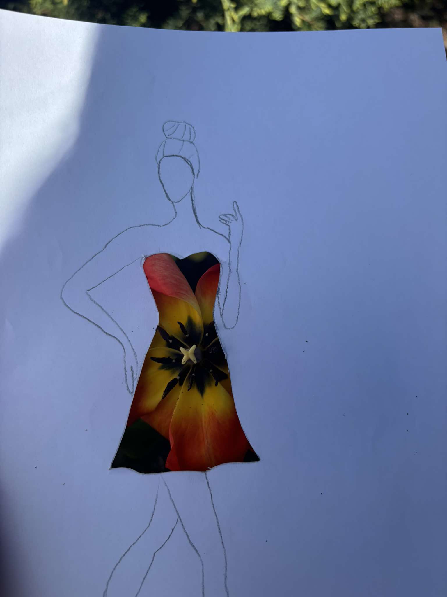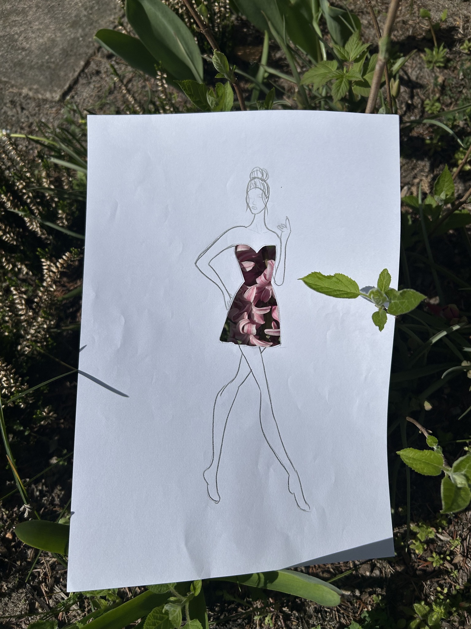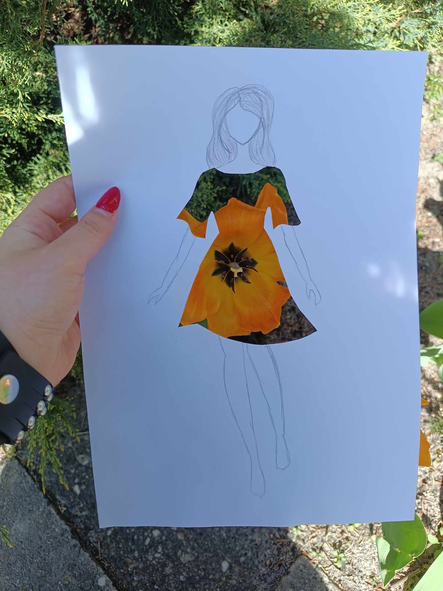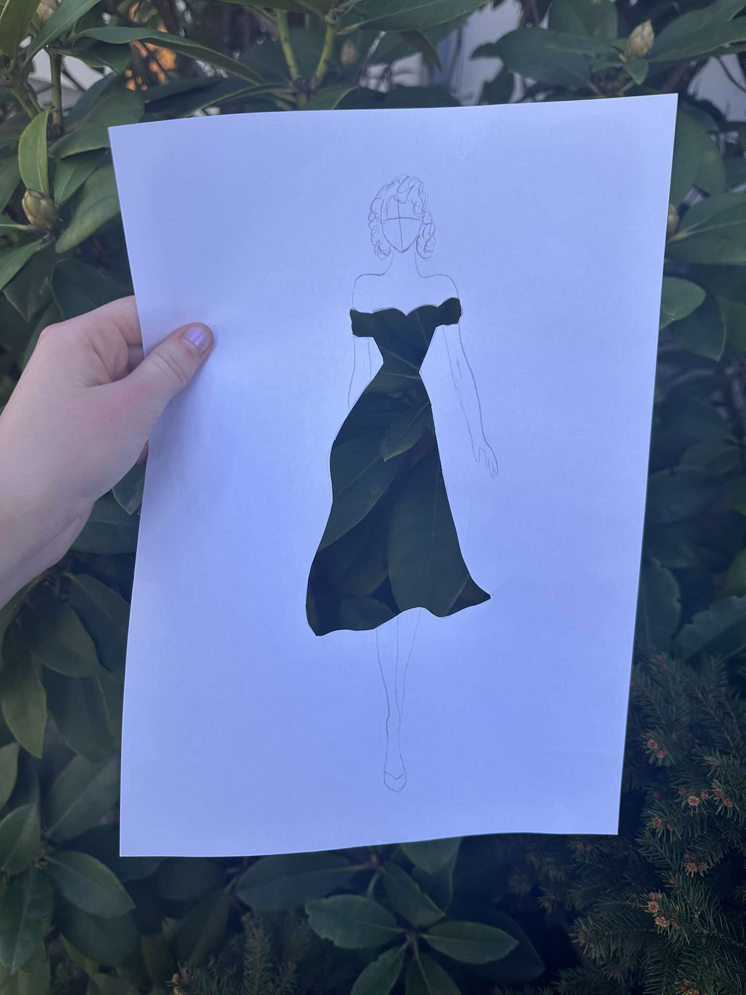 Uczniowie kierunku **technik przemysłu mody** pokazują, że moda nie zna granic! Na zdjęciu możecie zobaczyć efekt połączenia rysunku z naturą – projekt sukienki, w którym rolę materiału odgrywają... kwiaty, rośliny i inne 🌿👗