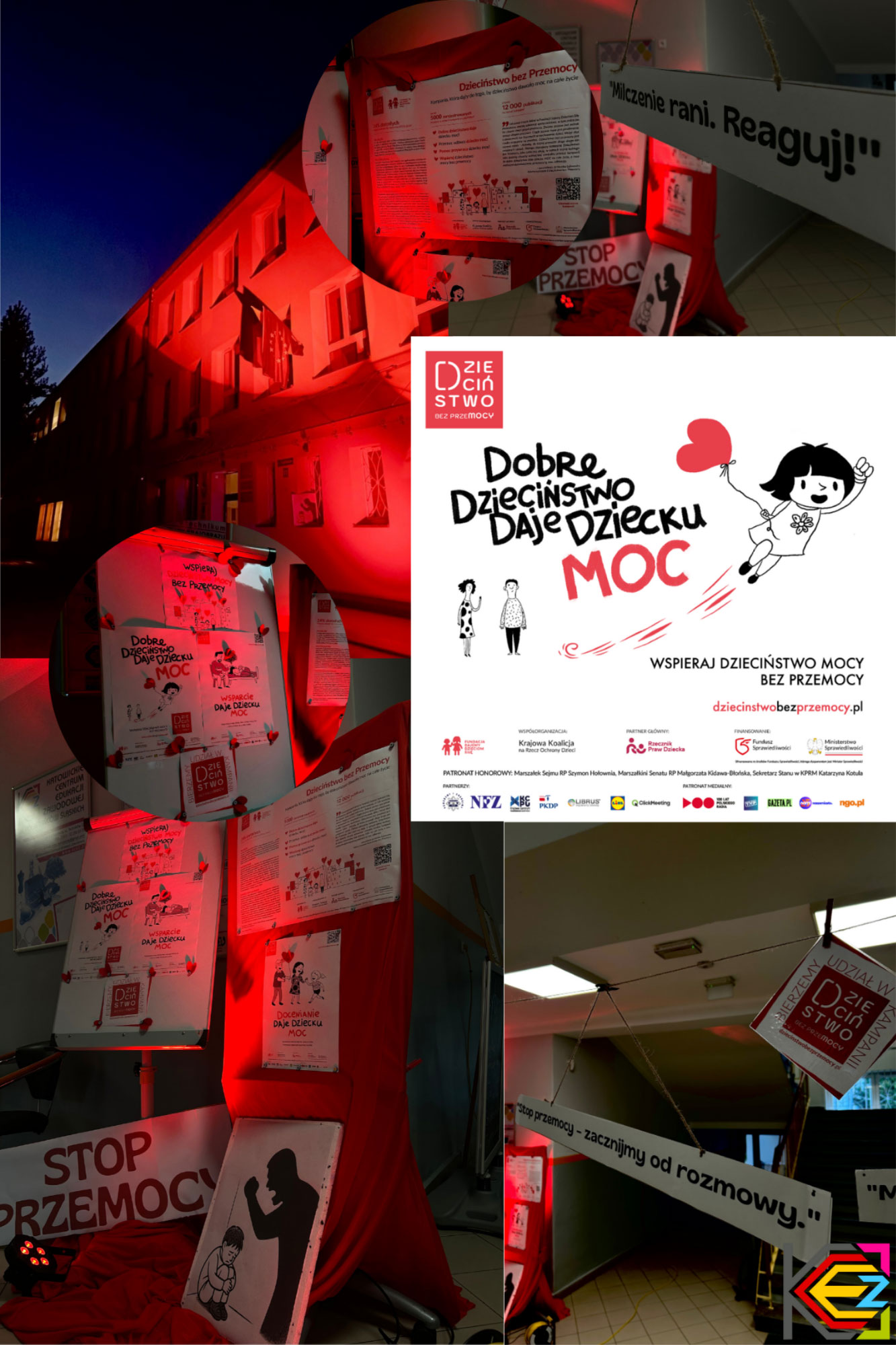 Dodatkowo w szkole podejmowane były działania edukacyjne i profilaktyczne uwrażliwiające społeczność szkolną na problem przemocy wobec dzieci. Zaangażowana w działania młodzież przygotowała gazetkę profilaktyczną, którą umieszczono na szkolnym holu. Szczególnym momentem kampanii był dzień 19 listopada – Międzynarodowy Dzień Przeciwdziałania Przemocy wobec Dzieci, kiedy to budynek naszej szkoły został podświetlony na czerwono, symbolicznie podkreślając solidarność z dziećmi doświadczającymi przemocy.