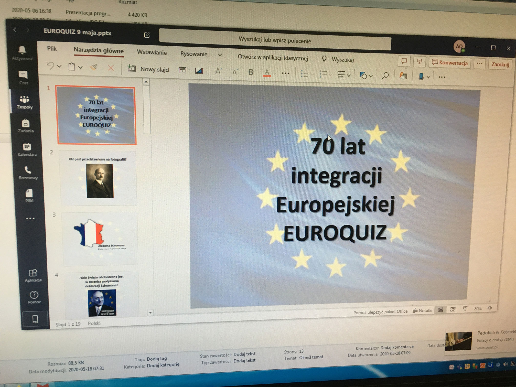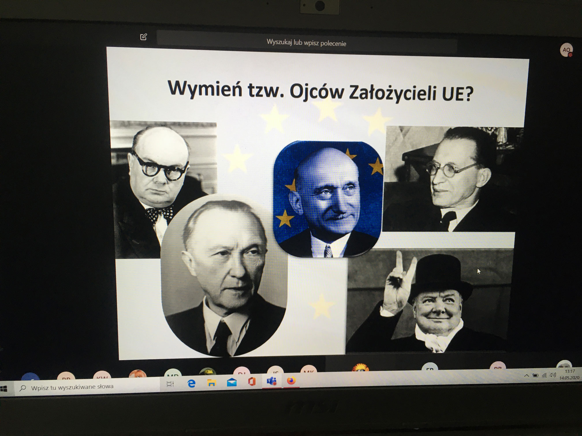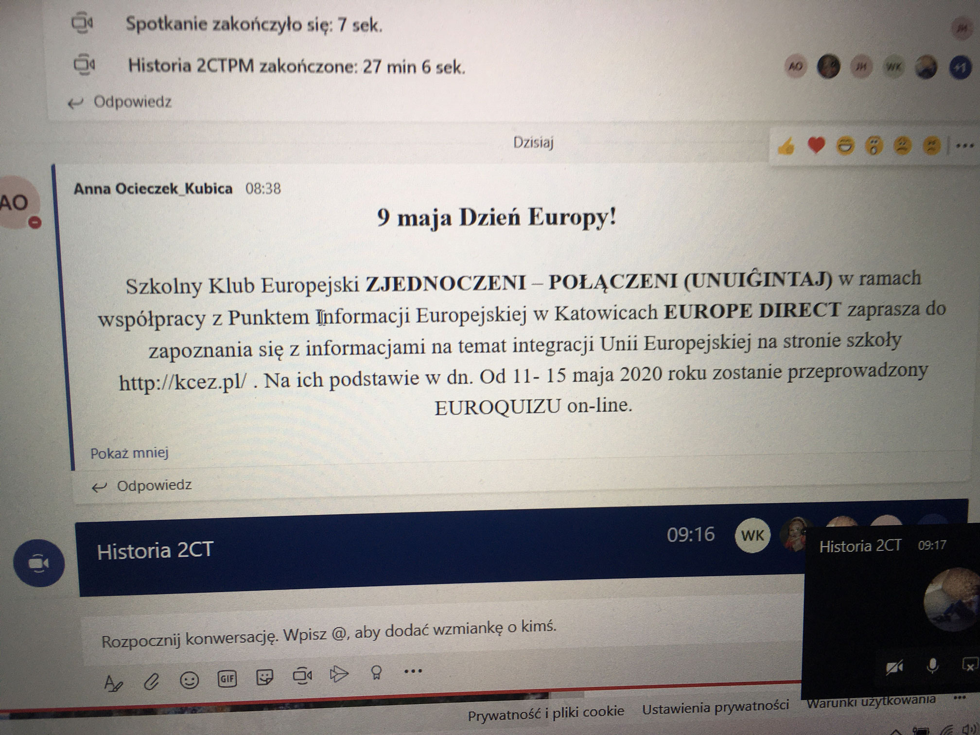 Szkolny Klub Europejski ZJEDNOCZENI – POŁĄCZENI (UNUIĜINTAJ) w ramach współpracy z Punktem Informacji Europejskiej w Katowicach EUROPE DIRECT przeprowadził w dn. 11- 15 maja 2020 roku EUROQUIZ on-line z okazji Dnia Europy pod tytułem „70 lat integracji Europejskiej”.