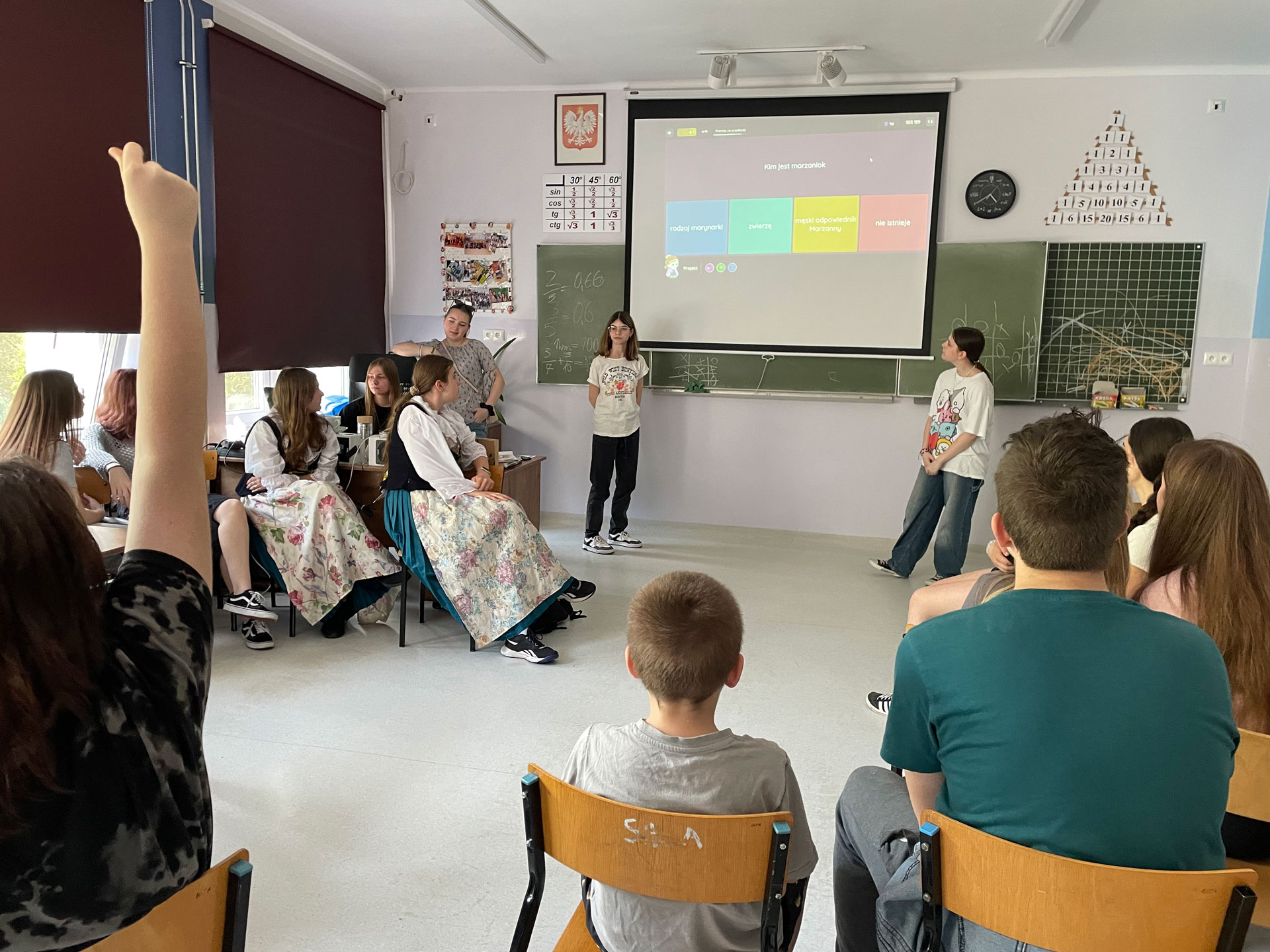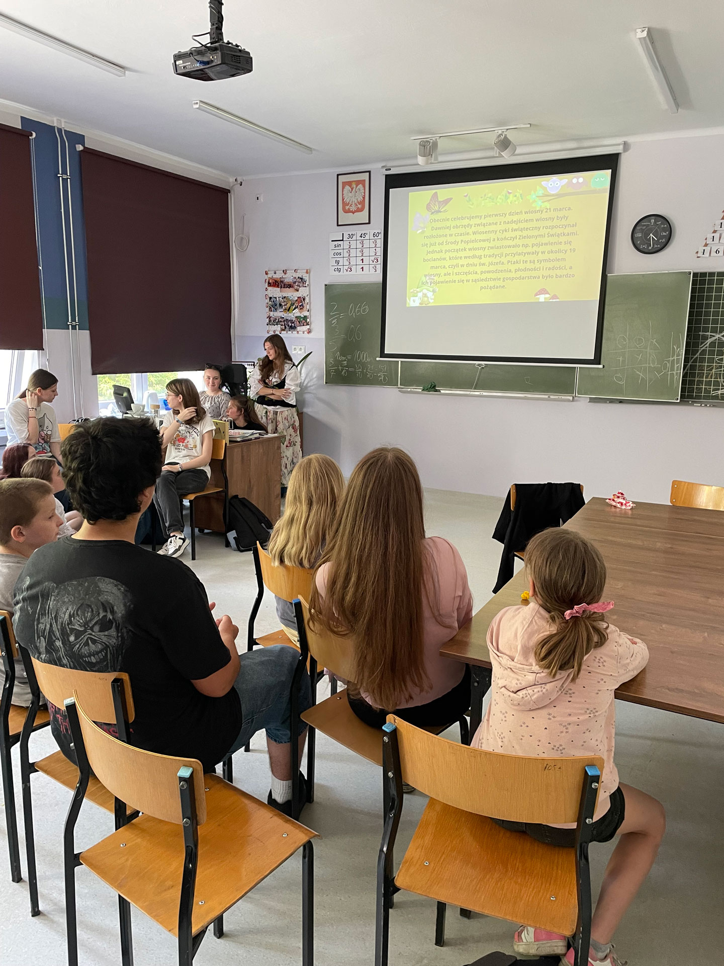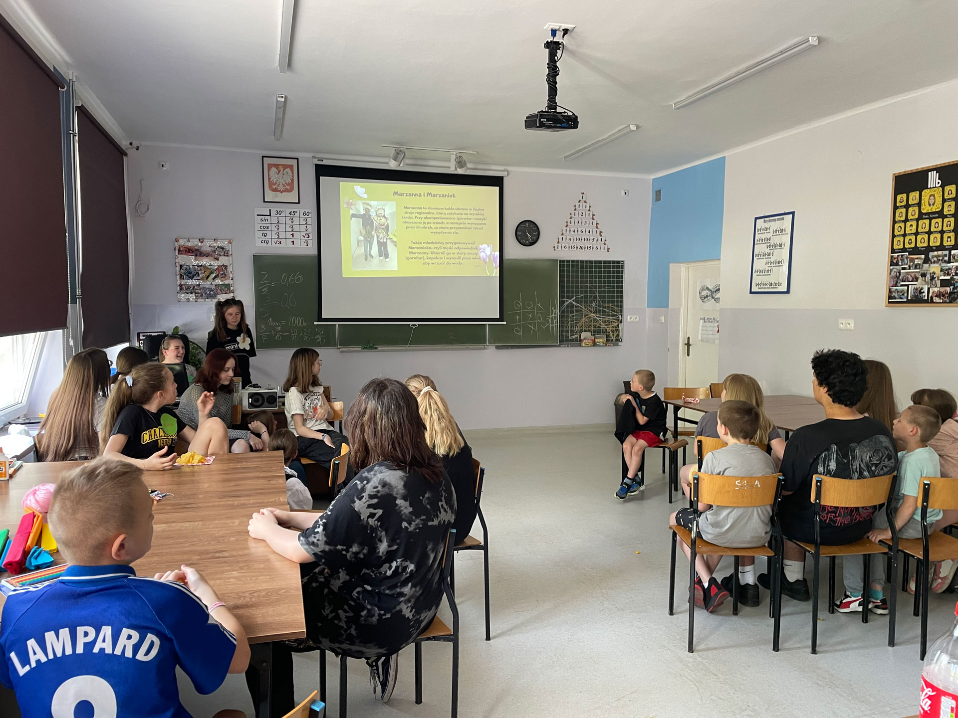 21 maja gościliśmy w naszej szkole podopiecznych Placówki Opiekuńczo-Wychowawczej w Katowicach - Dąbrówce Malej.Tym razem drużyna dziewcząt z klasy z 1Ep, 1Gp i 1Bp, realizująca pod kierunkiem p. Doroty Kubicy-Jasińskiej projekt etnograficzny, podzieliła się z dziećmi efektami swojej kilkutygodniowej pracy. Po przedstawieniu w formie prezentacji wiosennych tradycji i zwyczajów kultywowanych od pokoleń na Górnym Śląsku, a szczególnie w rejonie Katowic, przystąpiliśmy do wspólnej zabawy i gry terenowej. Dzieci rozwiązywały quiz, wykonywały wyklejanki, wykreślanki, jak również wykazywały się kreatywnością przy zabawie w kalambury. Nie zabrakło też aktywności ruchowych na sali gimnastycznej, które zakończyły się wspólnym układaniem "puzzli wiosennych", wykonanych przez p. Tomasza Lincę według autorskiego projektu Martyny z 1Bp. Na koniec z mapkami w ręku dzieci podążyły tropem Marzanny i Marzanioka. Po ich odnalezieniu czekała na nie jeszcze jedna wskazówka prowadząca do słodkiej niespodzianki. Wspólnej zabawie i grze związanej z etnografią naszego regionu towarzyszyła wiosenna aura i wiosenne przyśpiewki.