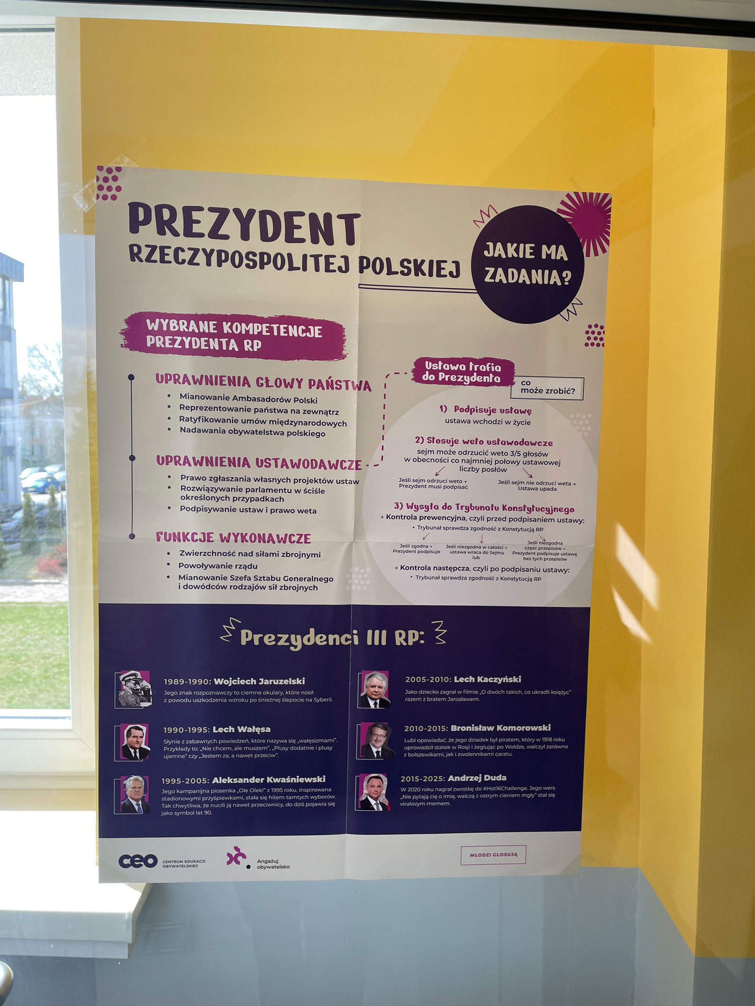 W związku ze zbliżającymi się wyborami prezydenckimi 2025 KCEZ przystąpiło po raz kolejny do projektu "Młodzi głosują", którego organizatorem od lat jest Centrum Edukacji Oywatelskiej. Głównym celem projektu jest zwiększenie uczestnictwa młodych ludzi w życiu publicznym, w tym zachęcenie ich do świadomego udziału w wyborach. "Młodzi głosują" to przykład edukacji obywatelskiej, to lekcja demokracji w praktyce. Każdy uczeń będzie miał okazję, by oddać głos na swojego kandydata startującego w wyborach, a tym samym dać znać o swoich poglądach. Na lekcjach historii, hit-u i wos młodzież dowie się również o roli i uprawnieniach prezydenta RP oraz demokratycznej procedury wyborczej. Nasz szkolny Zespół pod opieką Doroty Kubicy-Jasińskiej już od dwóch tygodni podejmuje działania przygotowujące kampanię profrekwencyjną.