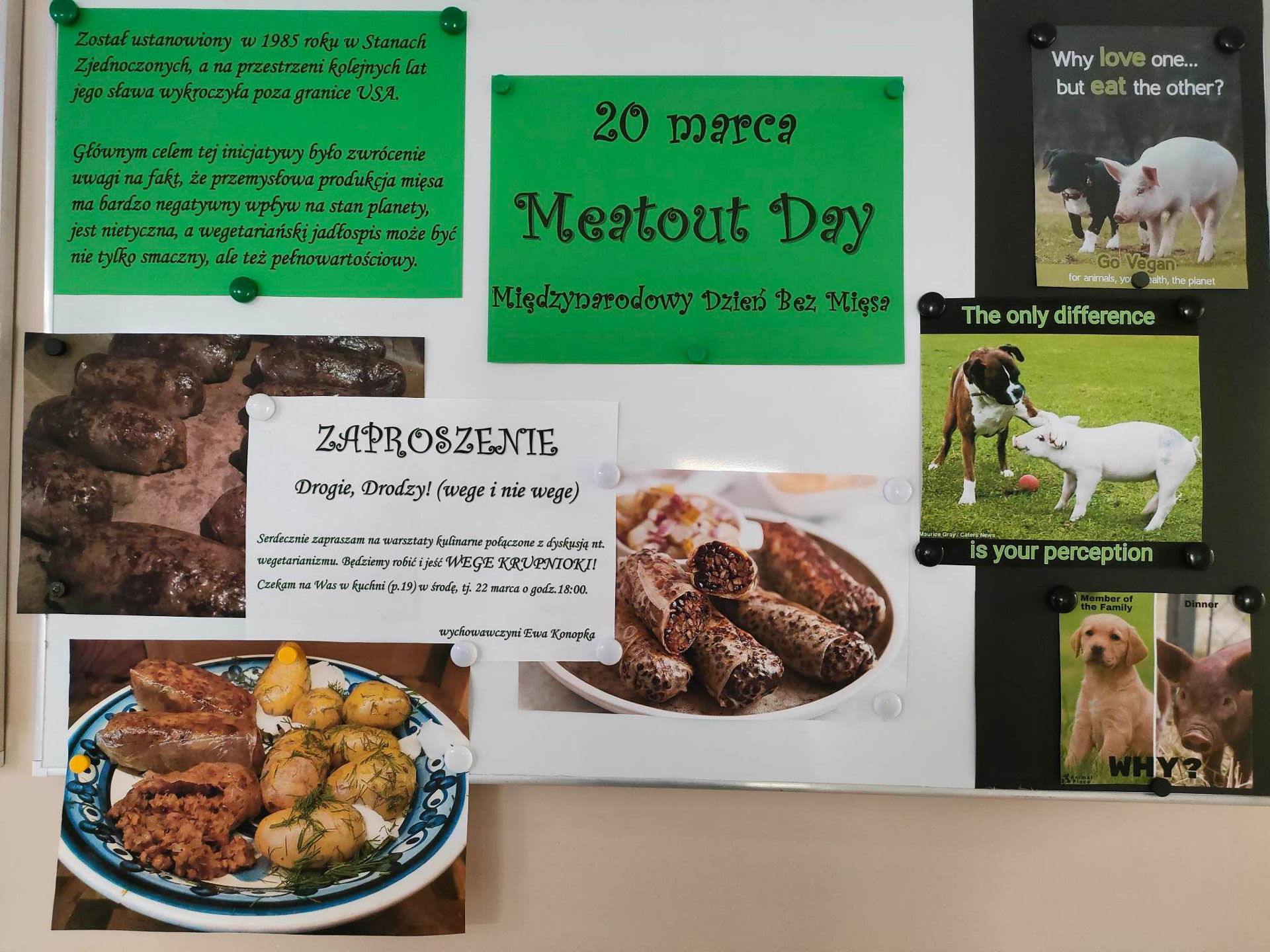 20 marca obchodziliśmy Międzynarodowy Dzień Bez Mięsa (Meatout Day). Z tej okazji w internatowej kuchni odbyły się warsztaty kulinarne połączone z dyskusją nt. wegetarianizmu. Powstały pyszne i zdrowe wege krupnioki (kaszanki). Przekonaliśmy się, że wegetariański jadłospis może być nie tylko smaczny, ale też pełnowartościowy.