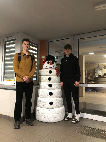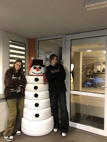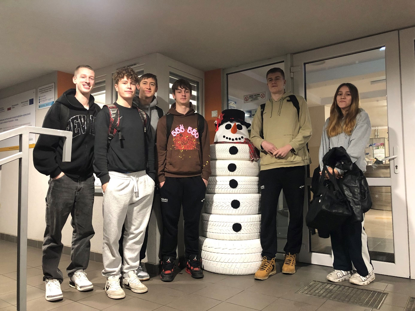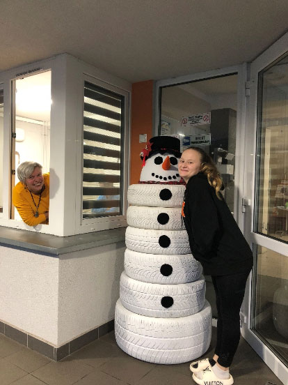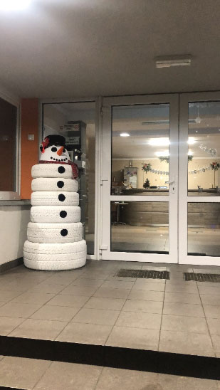 W ramach zajęć warsztatowych z recyklingu w ostatnim tygodniu przed drzwiami internatu pojawił się Eko- Bałwanek w całości wykonany z pozyskanych opon samochodowych.
