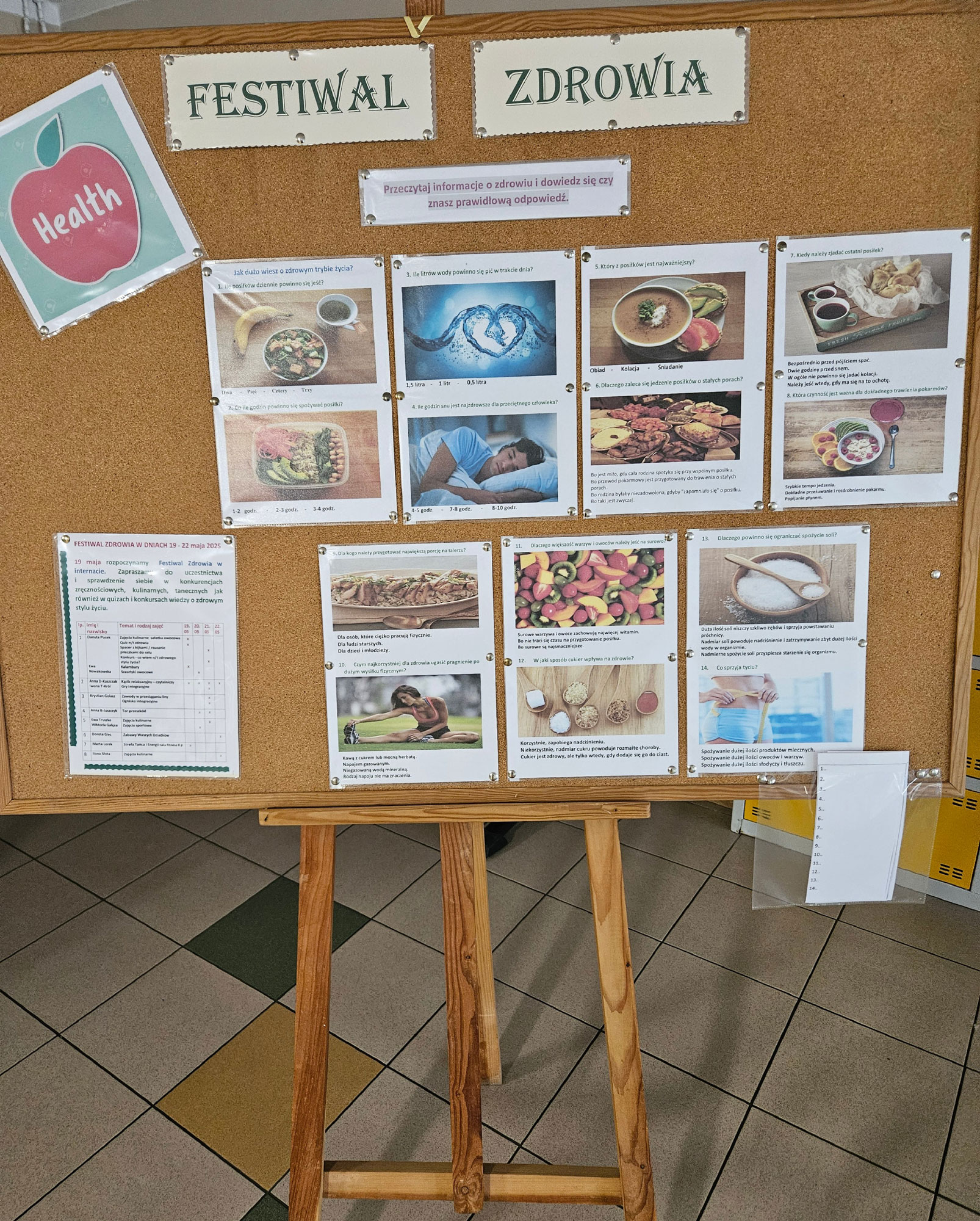 W dniach 19.05 - 22.05.2025r w internacie odbył się Festiwal Zdrowia. Program zajęć był naprawdę bogaty. To była doskonała okazja to integracji do wspólnych zajęć i zabaw. Działo się działo – quizy, konkursy i kalambury, pieczenie chleba czosnkowego, koktajle, robienie sałatek i szaszłyków owocowych. Można było w strefie tańca i energii konkurować w grze „Just Dance”, W strefie relaksu w miejscu zaciemnionym o energetycznych światełkach można było odpocząć i posłuchać muzyki a także pograć w gry planszowe. Festiwal Zdrowia to również ognisko integracyjne z grami i tańcami oraz wyjściem na spacer z kijkami.