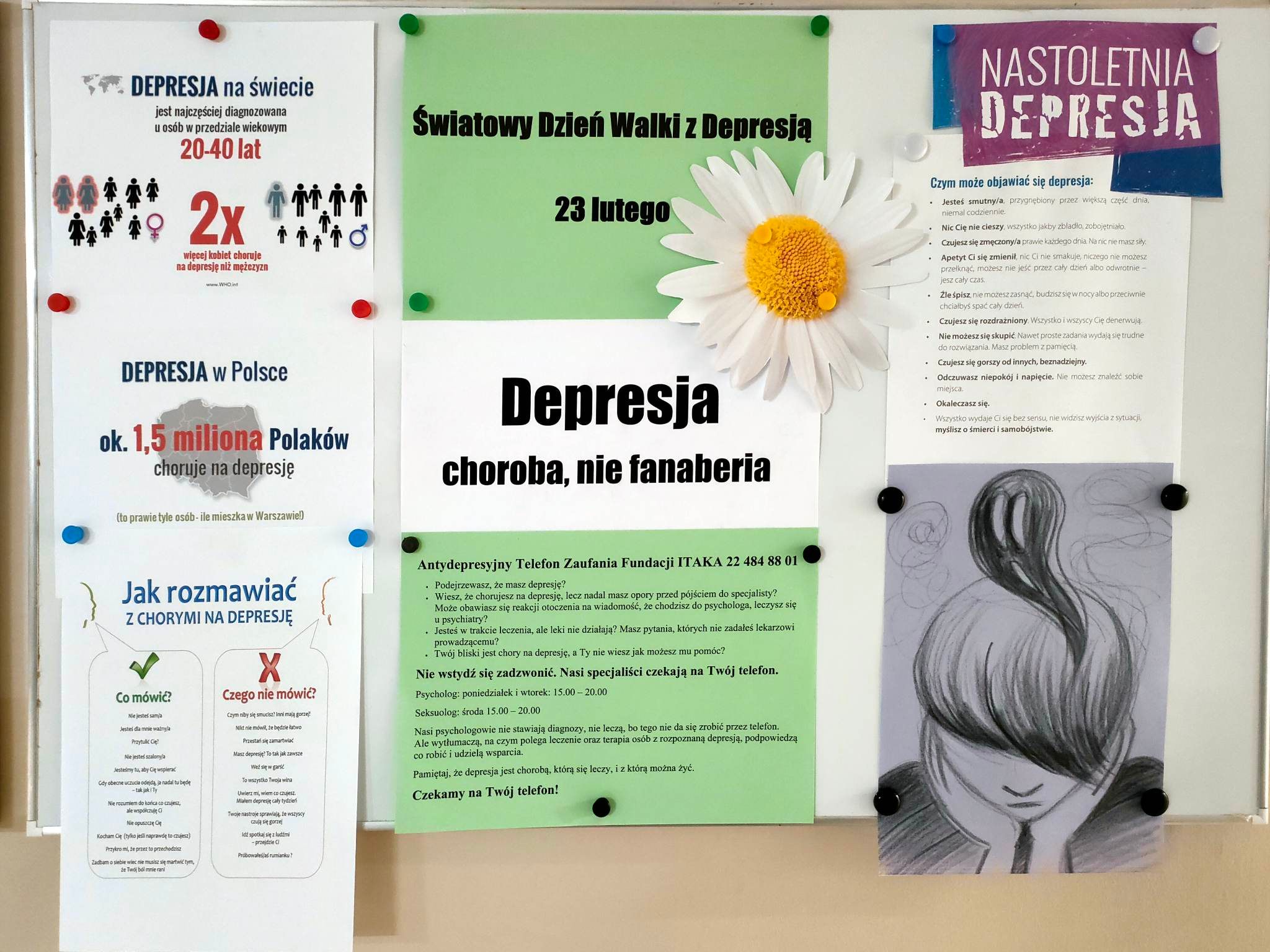 23 lutego obchodzony jest na całym świecie Światowy Dzień Walki z Depresją. WHO podaje, że depresja jest czwartą najpoważniejszą chorobą cywilizacyjną, na którą choruje aż 350 milionów ludzi na całym świecie, a w Polsce zmagają się z nią aż 4 miliony obywateli. Statystyki podają, że co czwarty nastolatek cierpi na zaburzenia depresyjne. W ramach internatowych obchodów tego dnia można było zobaczyć filmy dot. depresji,wziąć udział w dyskusji, dowiedzieć się - co mówić a czego nie mówić osobie z depresją, a także zdobyć informacje, gdzie szukać pomocy.
