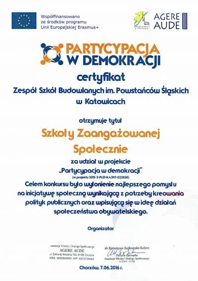 Z prawdziwą dumą informujemy, że nasza szkoła otrzymała prestiżowy tytuł SZKOŁY SPOŁECZNIE ZAANGAŻOWANEJ. Stało się to dzięki staraniom grupy młodzieży z klas 1AT, 2AT i 1a zsz, która 7 czerwca wzięła udział w I etapie projektu „Partycypacja w demokracji” realizowanego w ramach programu ERASMUS PLUS, AKCJA 3.