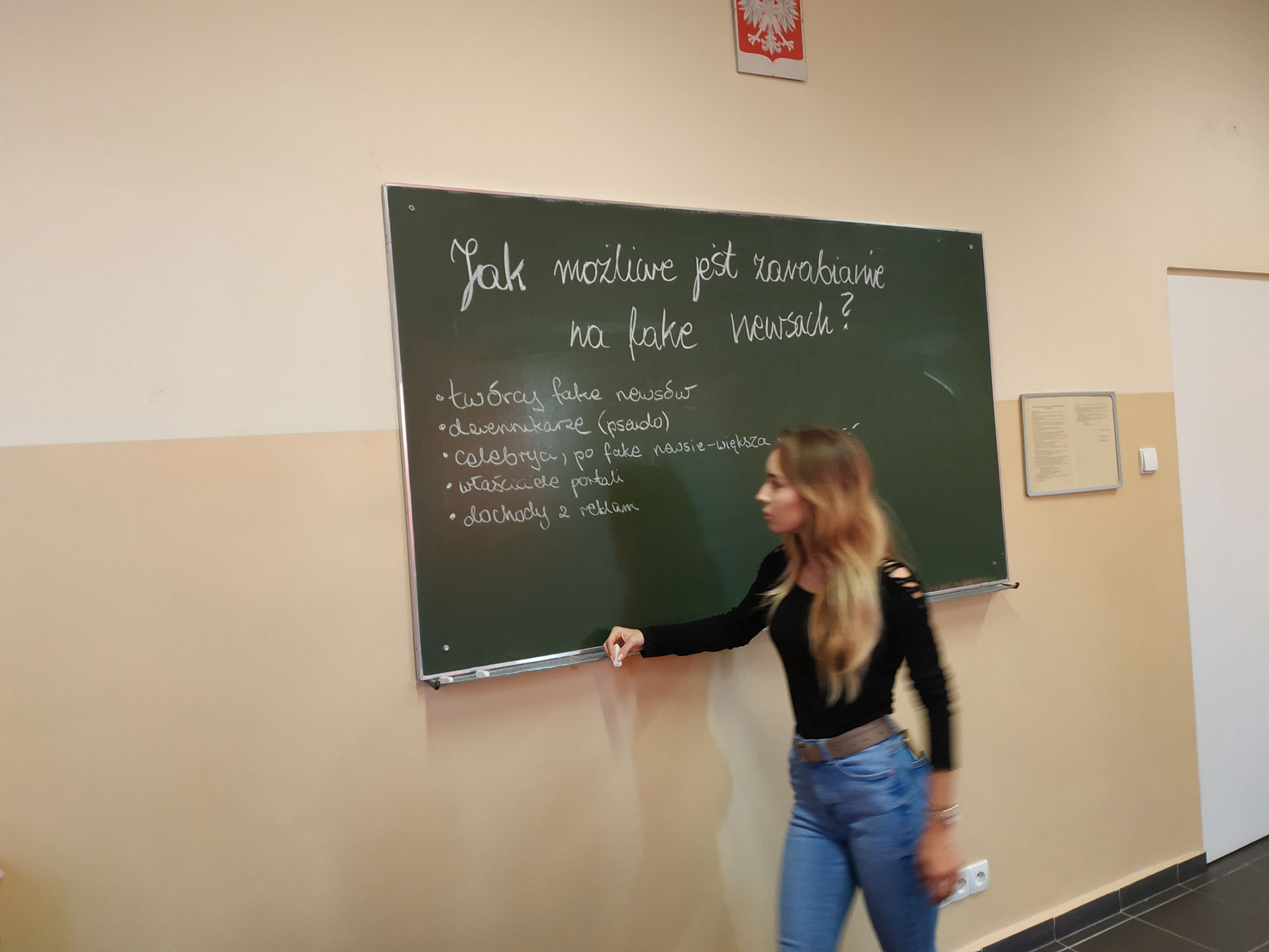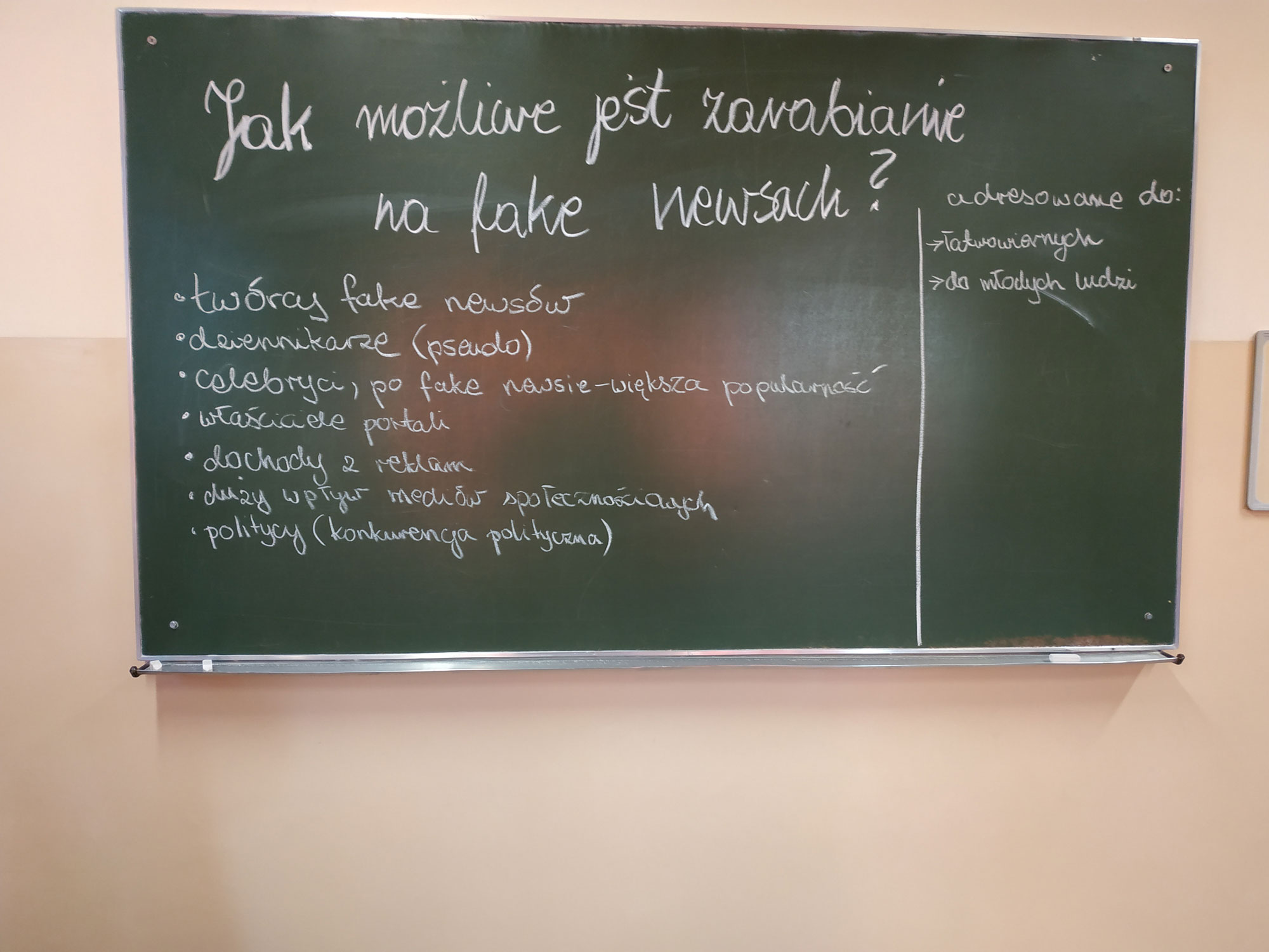 Po tak zachęcającym wprowadzeniu zaczęliśmy realizować, już samodzielnie, kolejne zadania projektowe. Odbyły się zajęcia, na których uczniowie i uczennice poznawali mechanizmy komunikacyjne charakterystyczne dla fake newsów. Uczestnicy i uczestniczki, zamiast słuchać typowych ostrzeżeń przed czającymi się w Internecie niebezpieczeństwami, wcielali się w role twórców fałszywych informacji. Dowiedzieli się, jak stworzyć doskonałą „postprawdziwą” informację i jak zapewnić jej olbrzymi zasięg, a nawet wywołać oburzenie i chaos. Pisanie fake newsów, według przepisu, to coś w rodzaju szczepionki – poznając mechanizmy manipulacji, stajemy się mniej podatni na ich działanie. Nie ma bowiem lepszego sposobu, by uodpornić się na psychologiczne sztuczki, niż zajrzeć na zaplecze, na którym powstają.