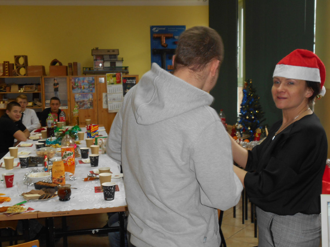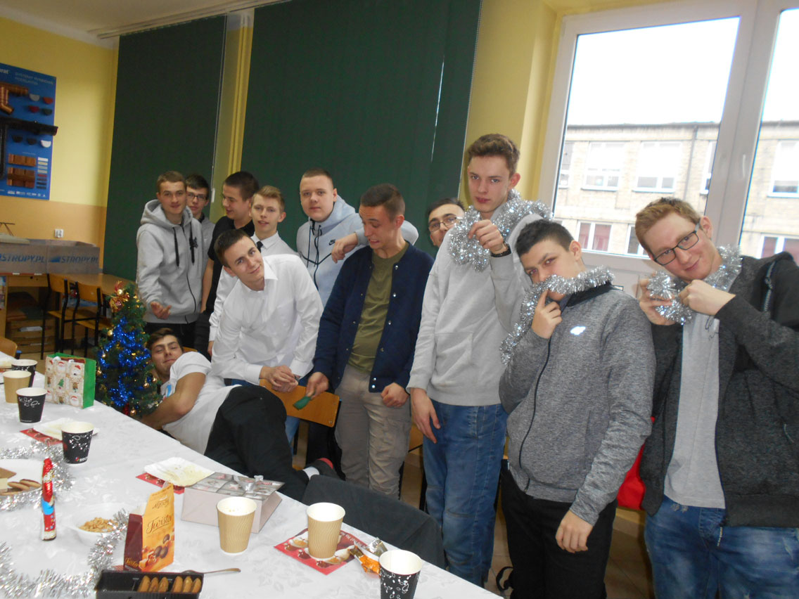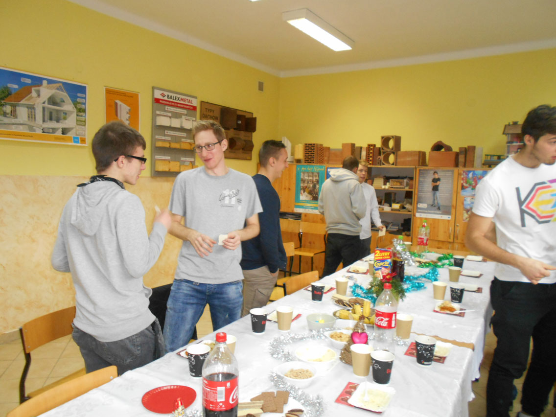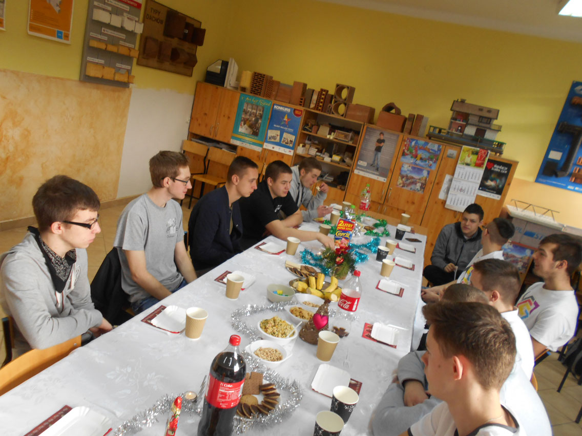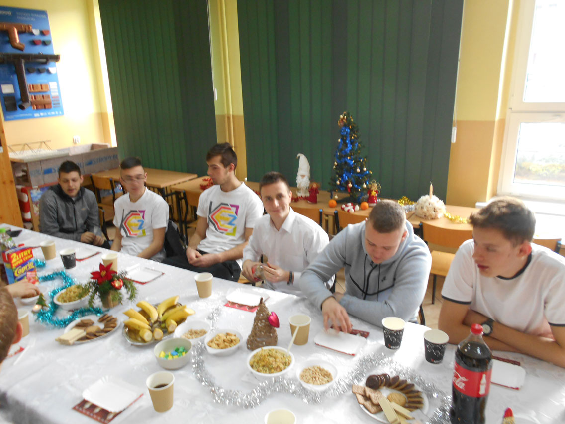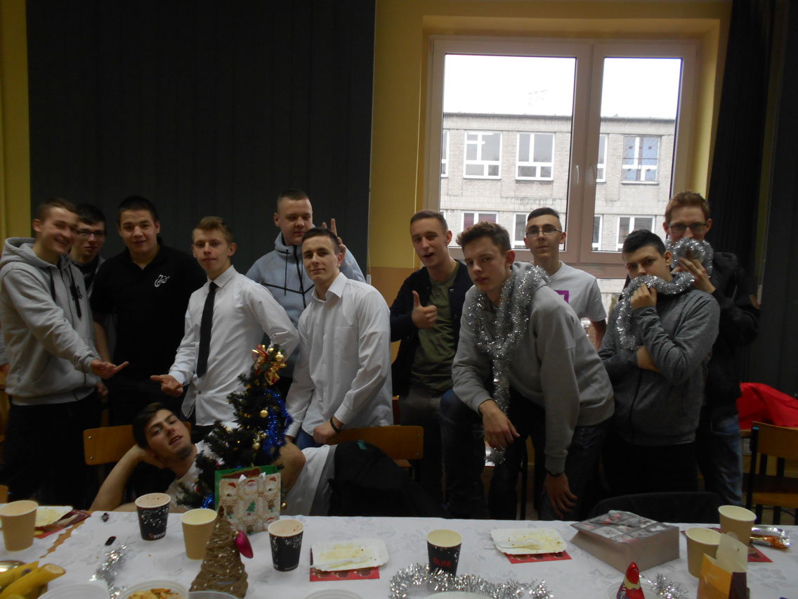 Były kolędy, dzielenie się opłatkiem, prezenty, życzenia i zaproszeni goście – pani dyrektor i nauczyciele przedmiotów zawodowych. A na stole różne smakołyki. Może nie do końca wigilijne ale bardzo smaczne – przebojem stała się sałatka przygotowana przez Daniela. I oczywiście zdjęcie z choinką!