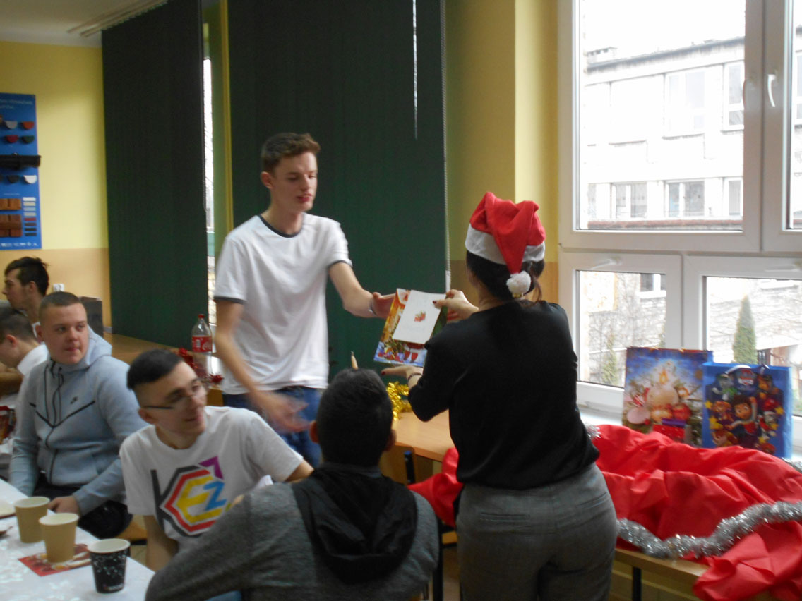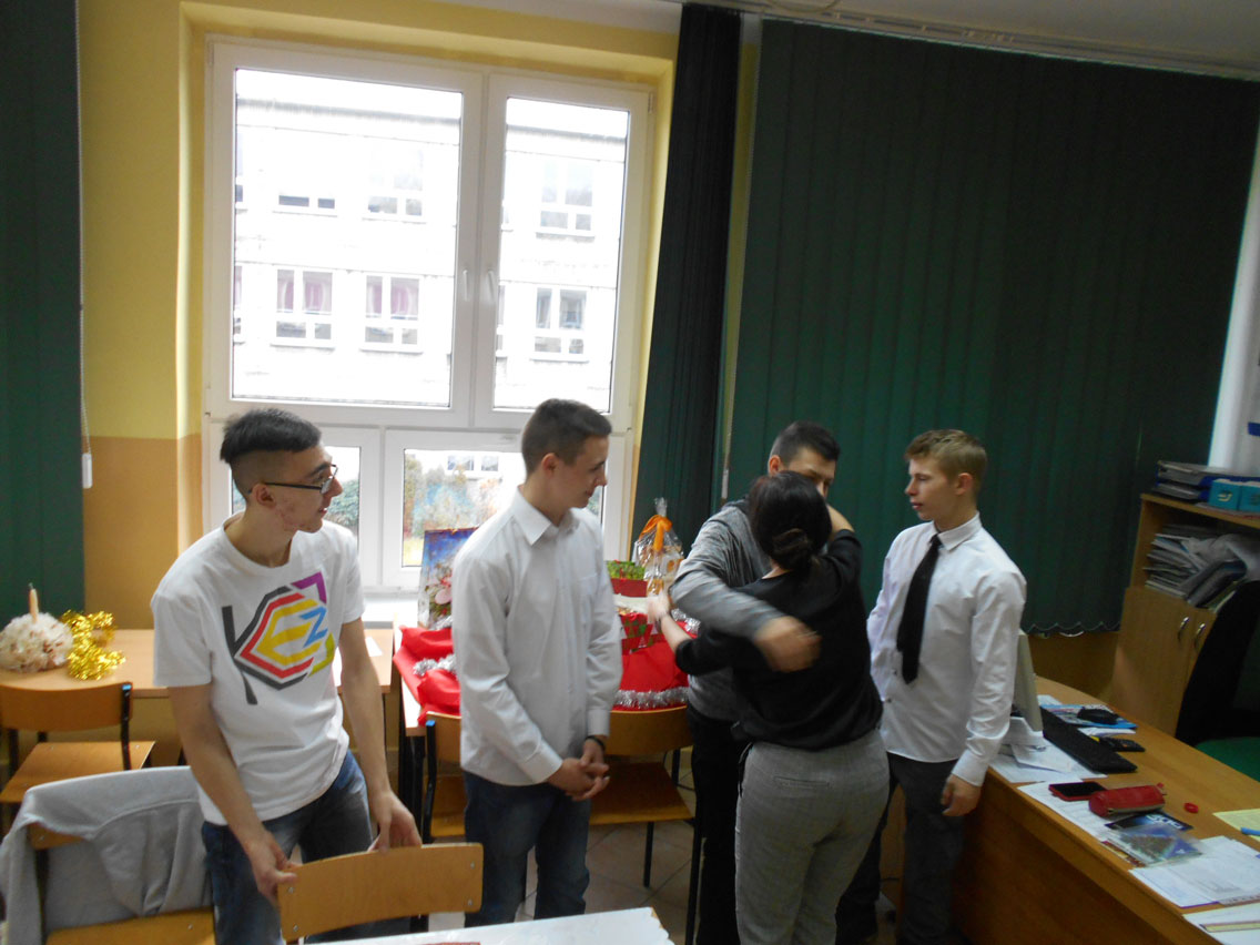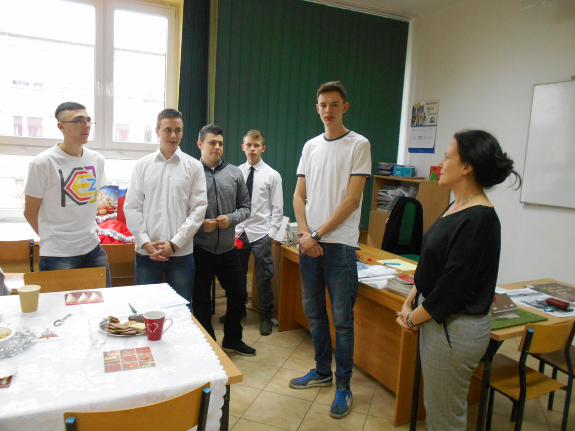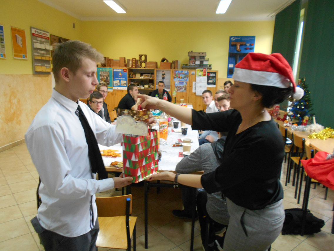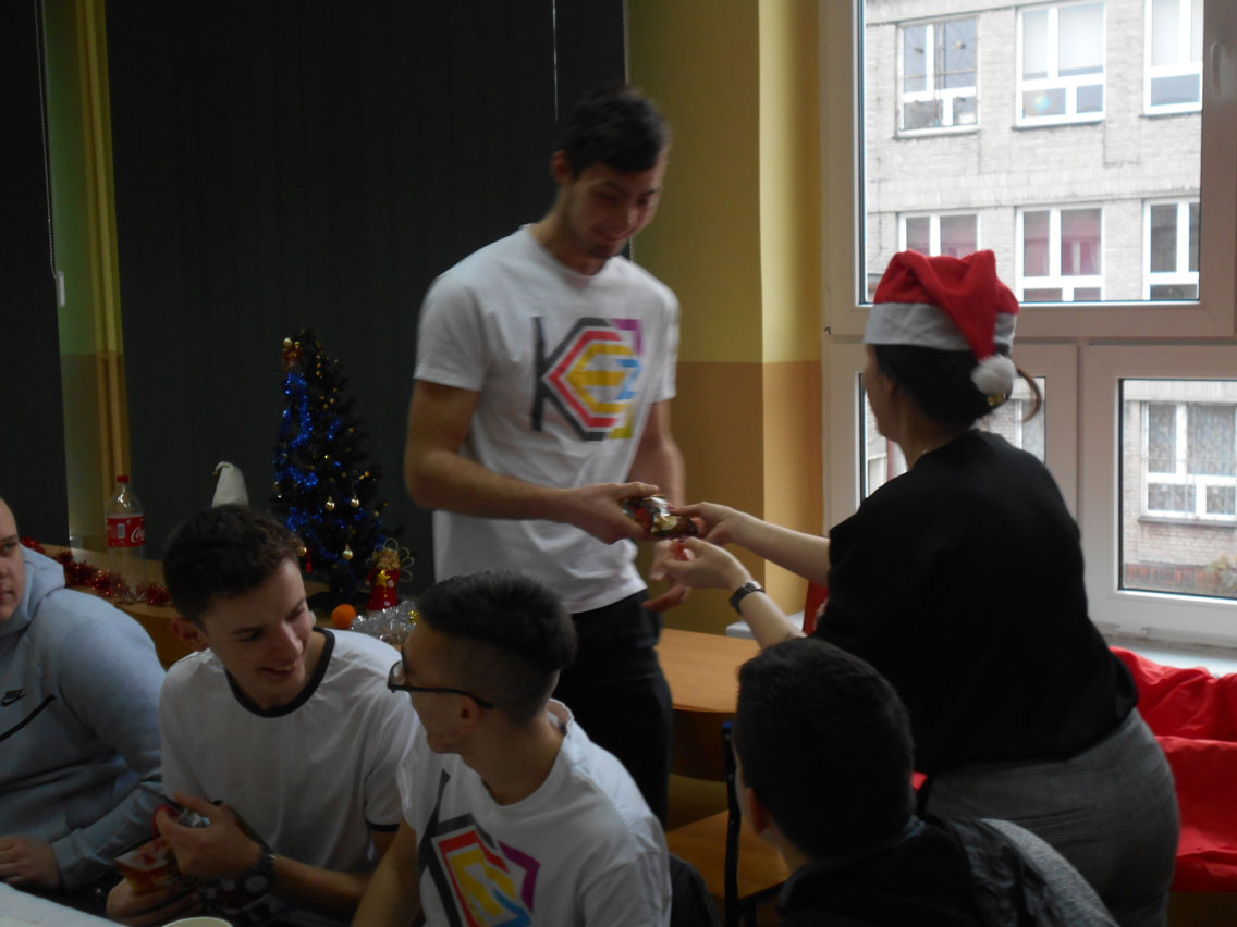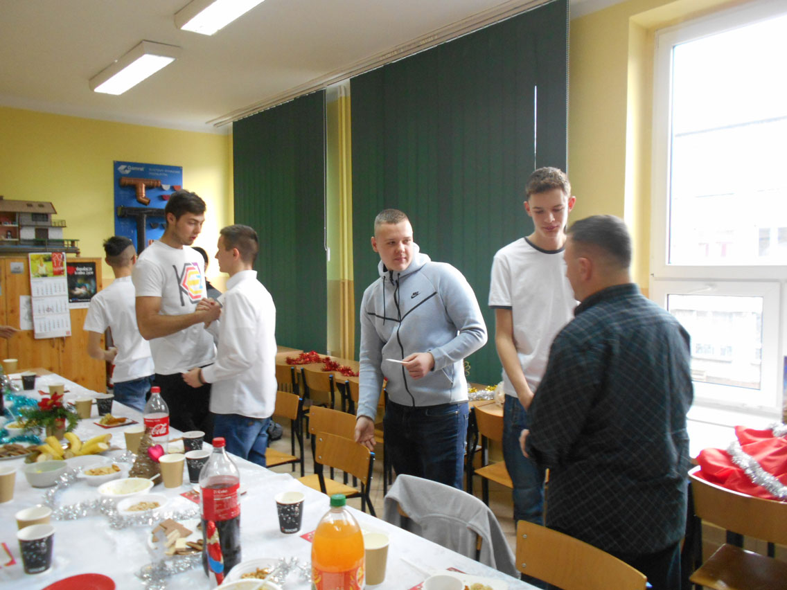 Były kolędy, dzielenie się opłatkiem, prezenty, życzenia i zaproszeni goście – pani dyrektor i nauczyciele przedmiotów zawodowych. A na stole różne smakołyki. Może nie do końca wigilijne ale bardzo smaczne – przebojem stała się sałatka przygotowana przez Daniela. I oczywiście zdjęcie z choinką!