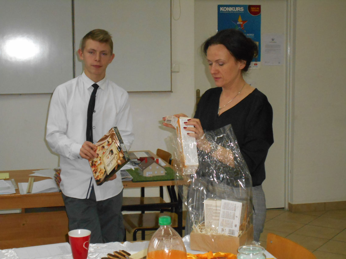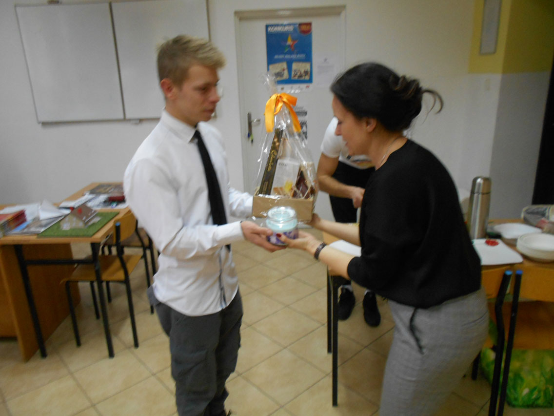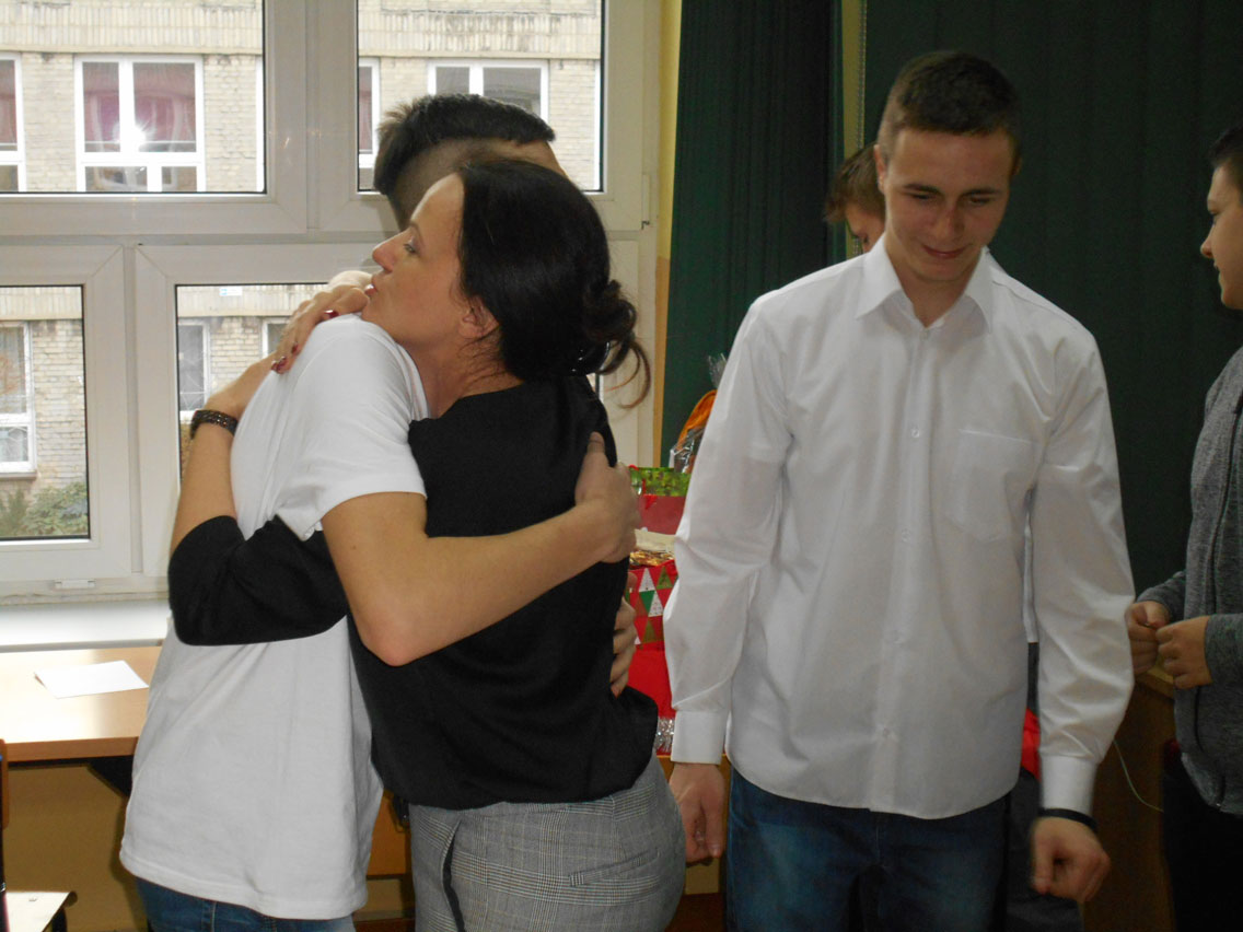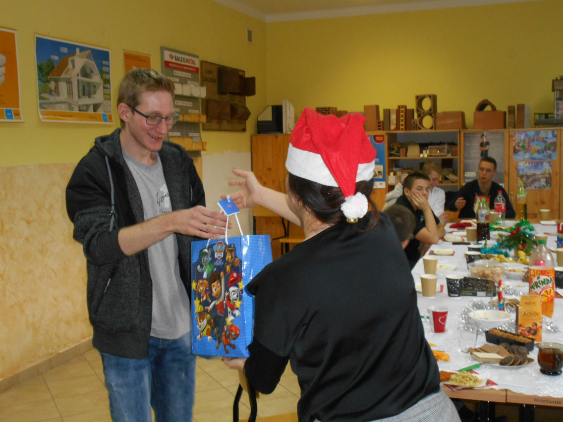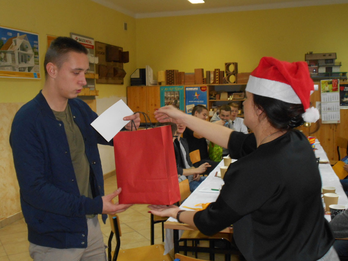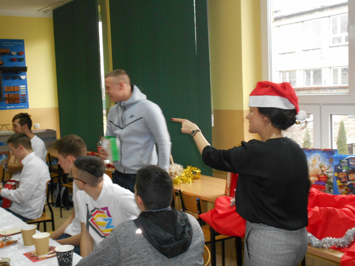 Były kolędy, dzielenie się opłatkiem, prezenty, życzenia i zaproszeni goście – pani dyrektor i nauczyciele przedmiotów zawodowych. A na stole różne smakołyki. Może nie do końca wigilijne ale bardzo smaczne – przebojem stała się sałatka przygotowana przez Daniela. I oczywiście zdjęcie z choinką!