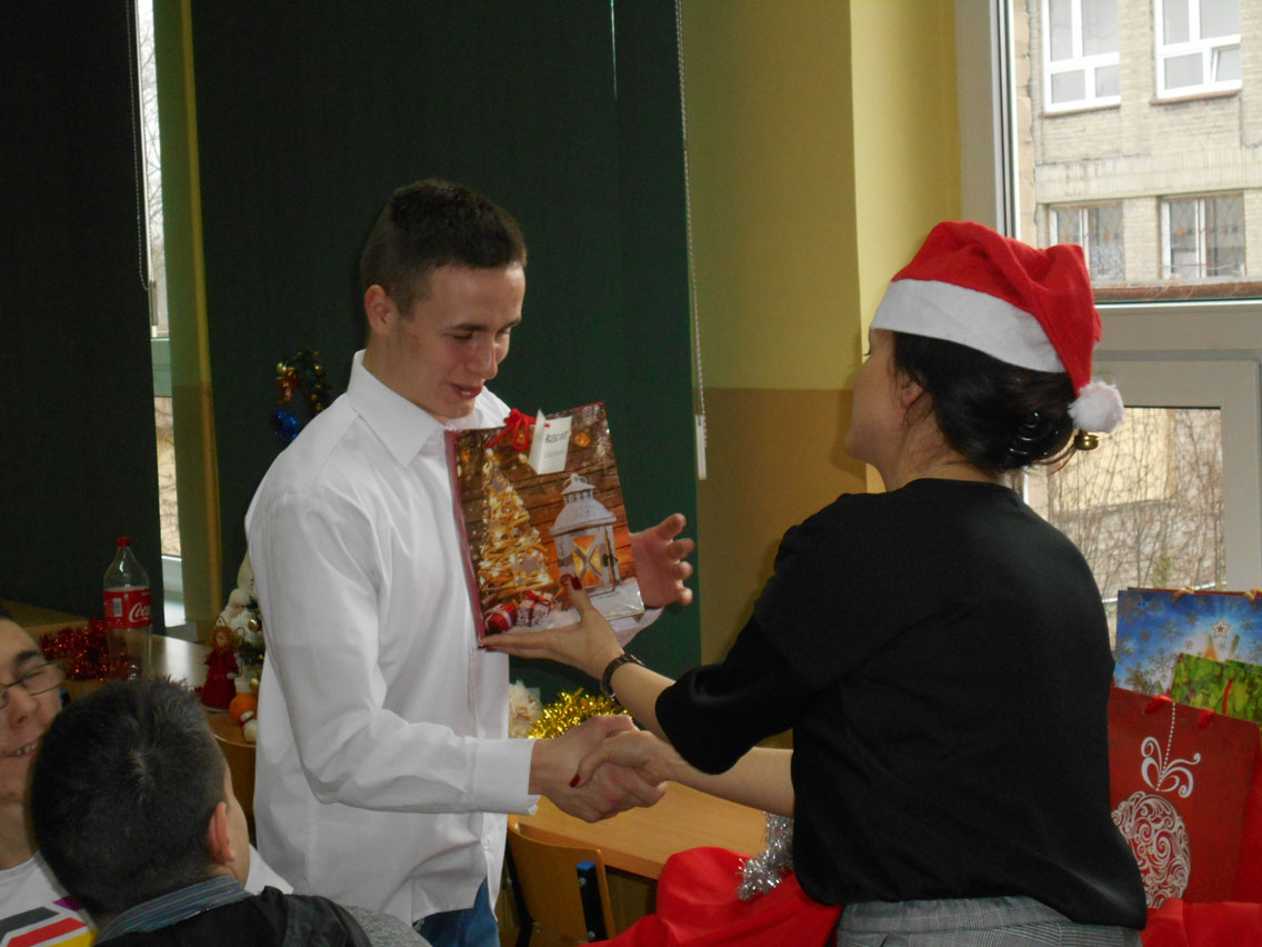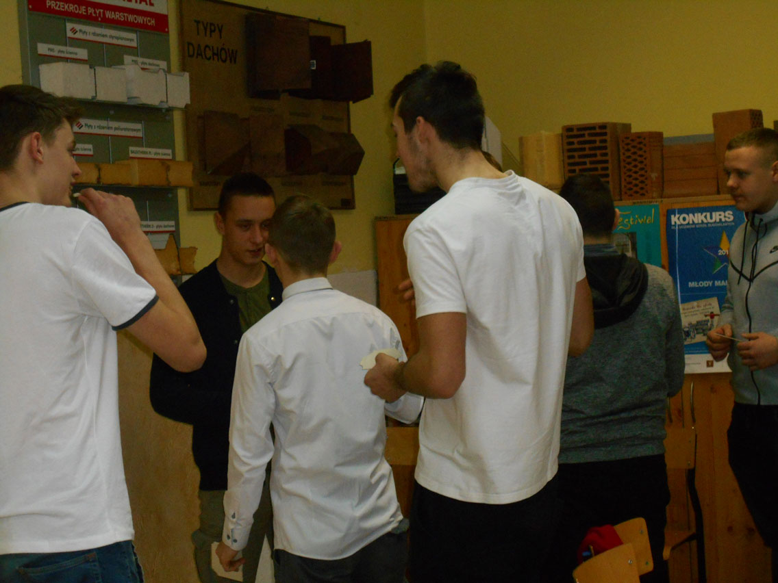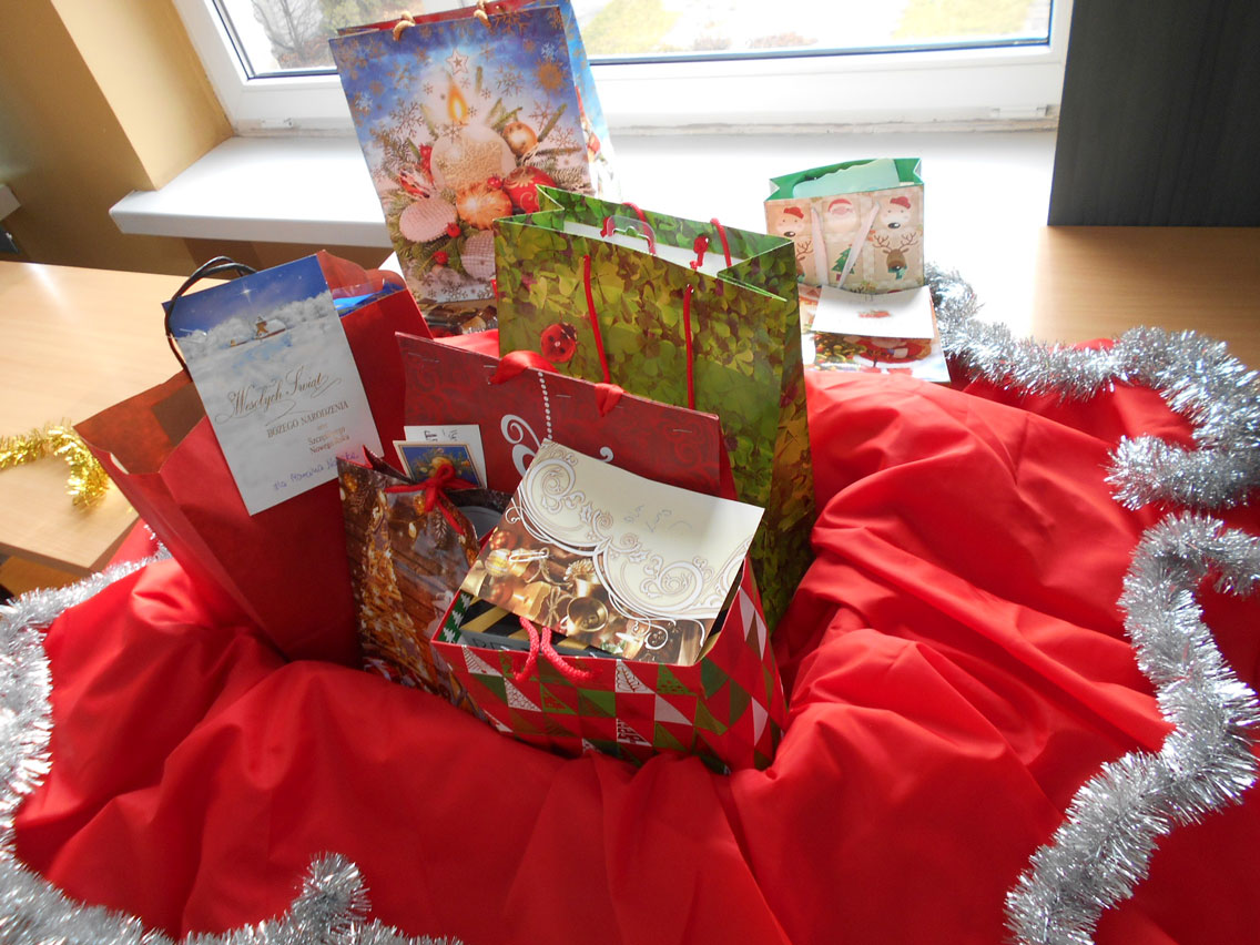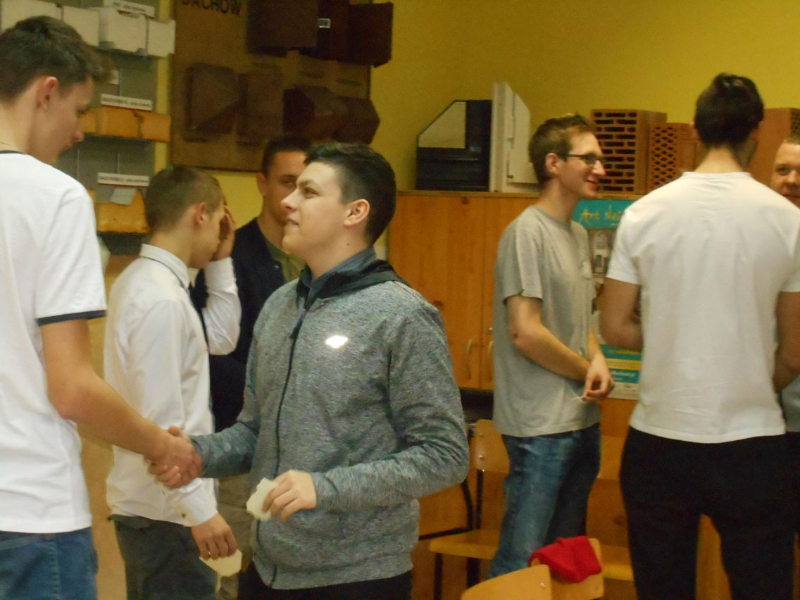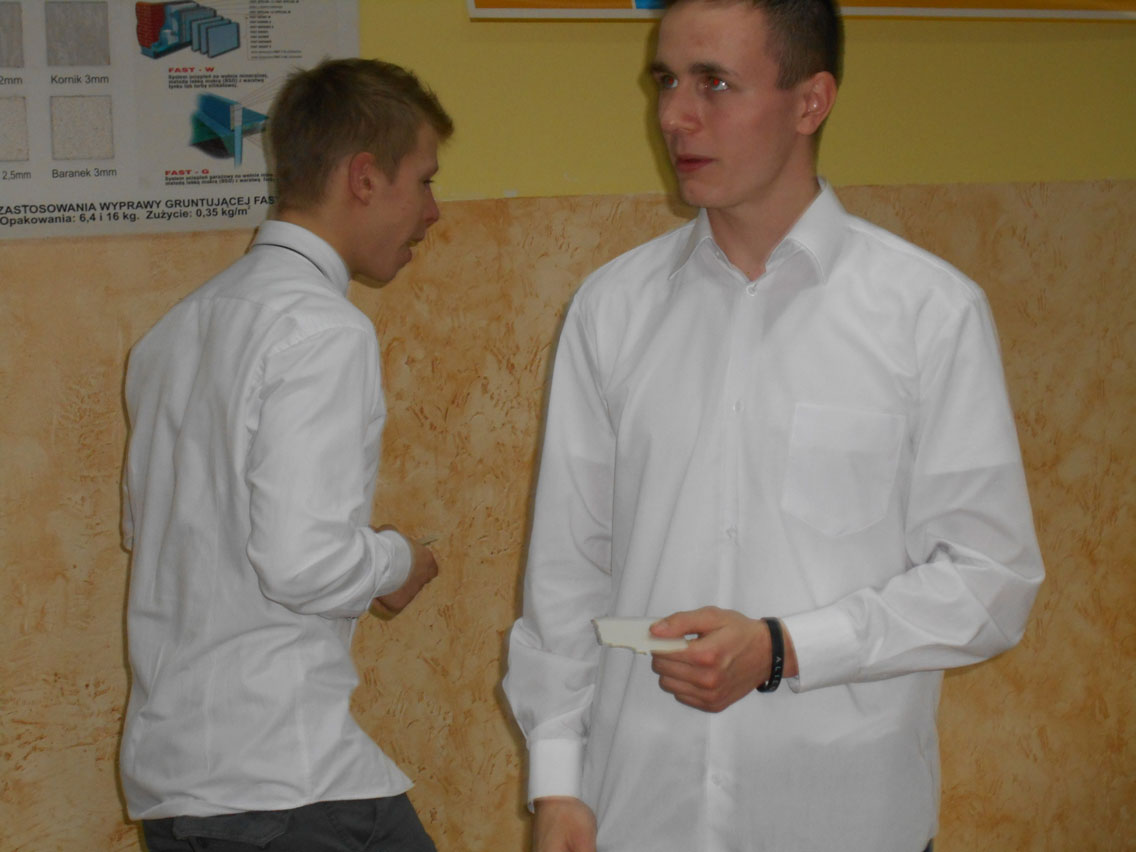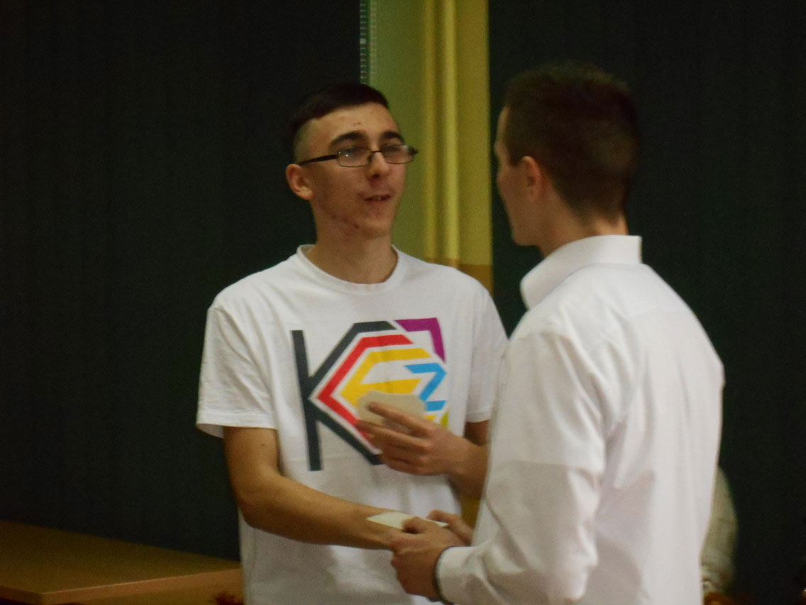 Były kolędy, dzielenie się opłatkiem, prezenty, życzenia i zaproszeni goście – pani dyrektor i nauczyciele przedmiotów zawodowych. A na stole różne smakołyki. Może nie do końca wigilijne ale bardzo smaczne – przebojem stała się sałatka przygotowana przez Daniela. I oczywiście zdjęcie z choinką!