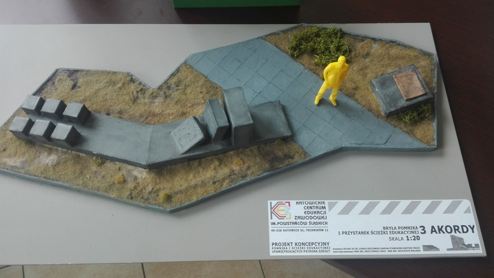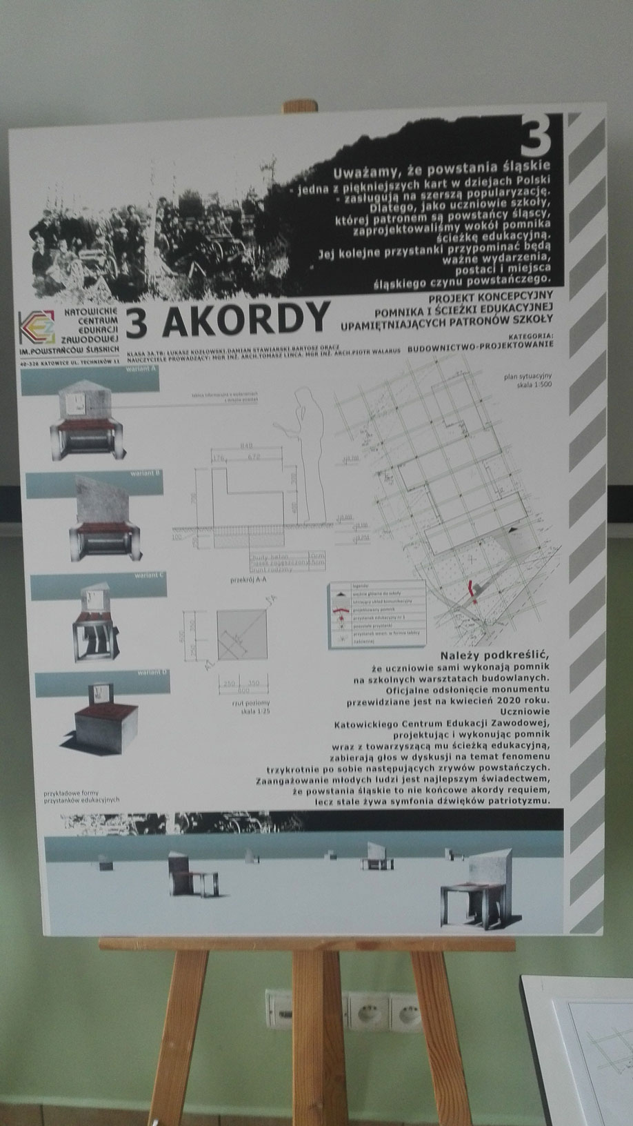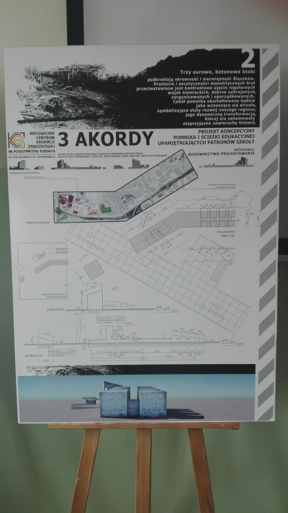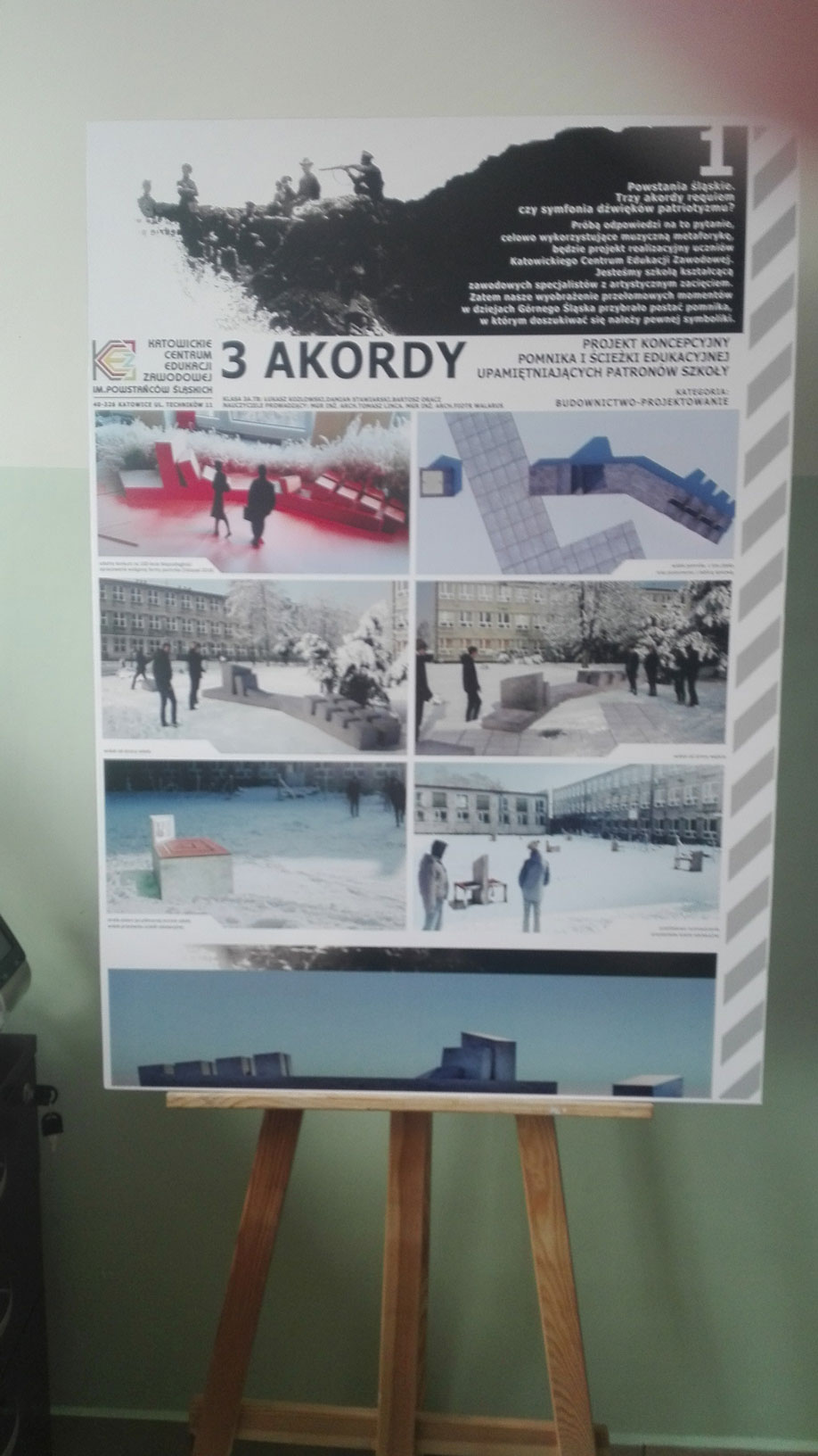 Uczniowie kl. 3 A TB : Łukasz K., Damian S. oraz Bartosz O. pod kierunkiem nauczycieli: pana Tomasza L. oraz Piotra W. wykonali projekt koncepcyjny Pomnika Powstań Śląskich oraz ścieżki edukacyjnej.