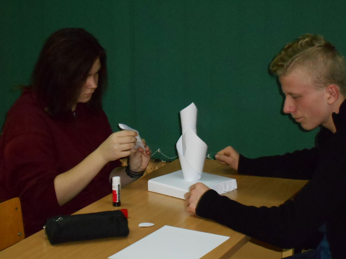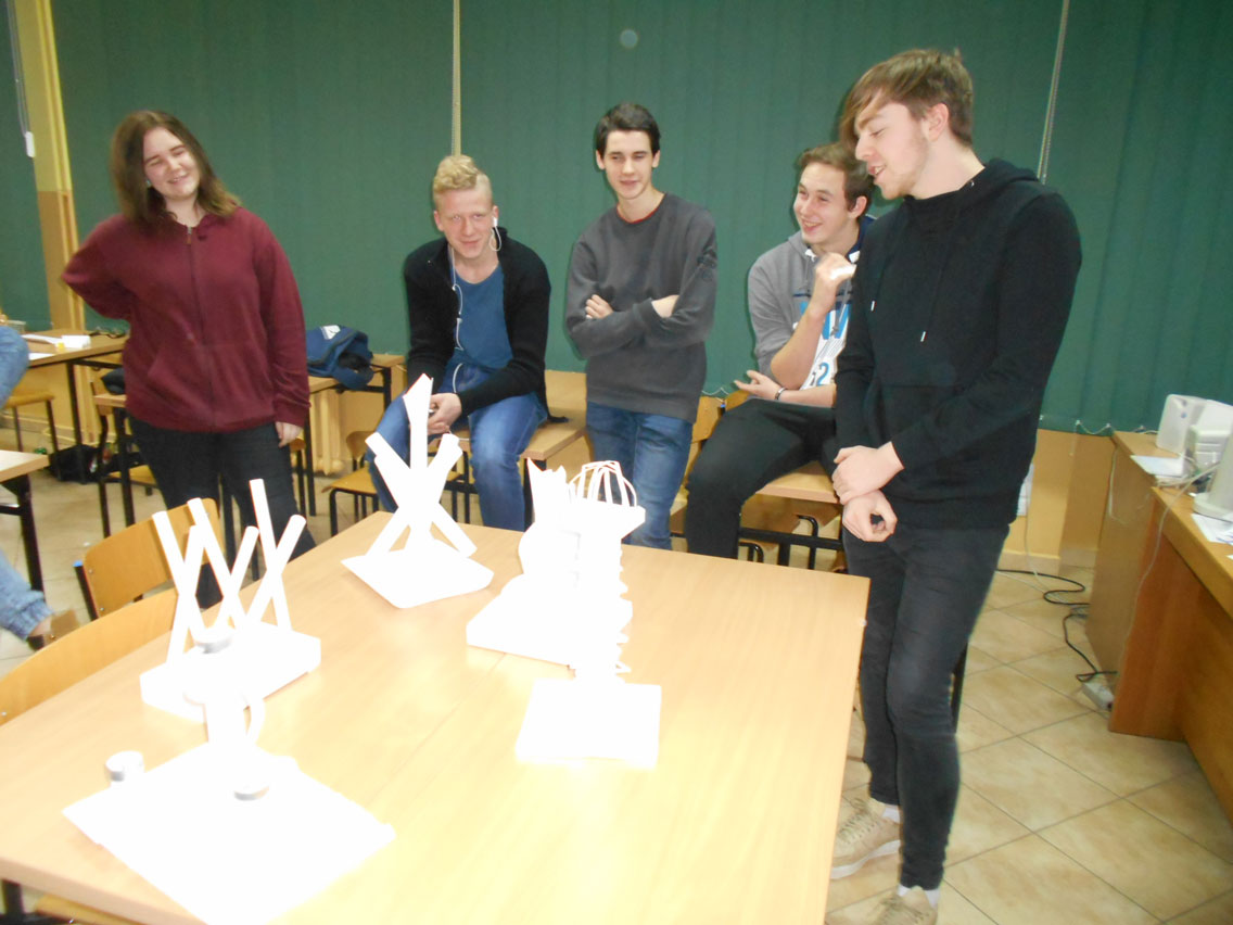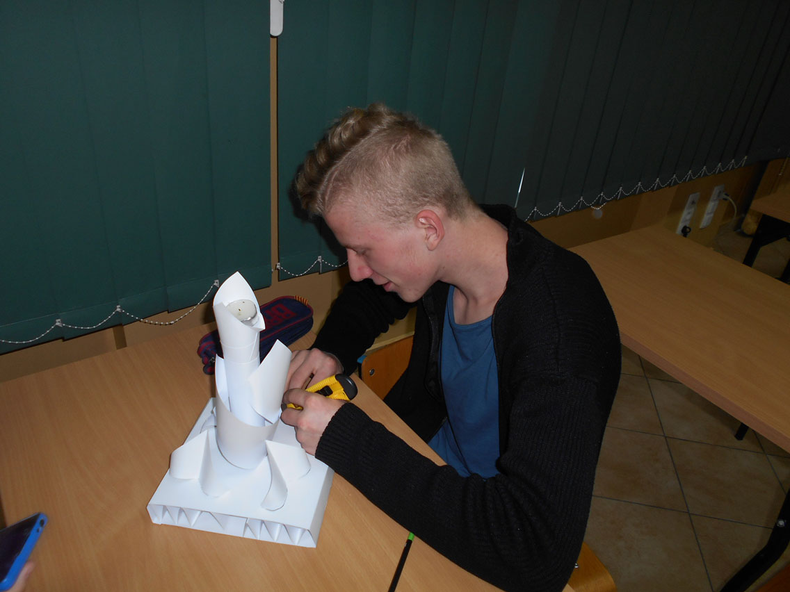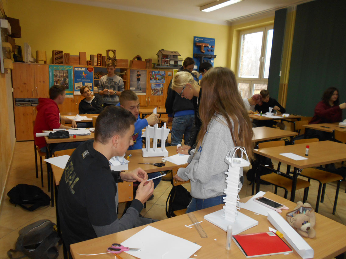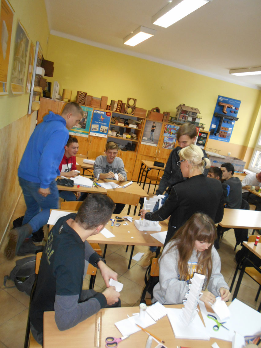 Zazwyczaj materiał konstrukcyjny kojarzy się nam z kamieniem, drewnem czy betonem. Tym razem w ramach warsztatów prowadzonych przez wykładowcę Wyższej Szkoły Technicznej 4 grudnia 2017 r uczniowie klasy 1 A mieli możliwość przekonania się, że papier też może być materiałem konstrukcyjnym.