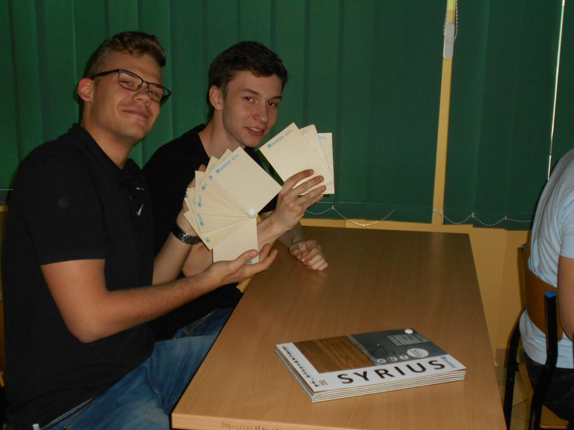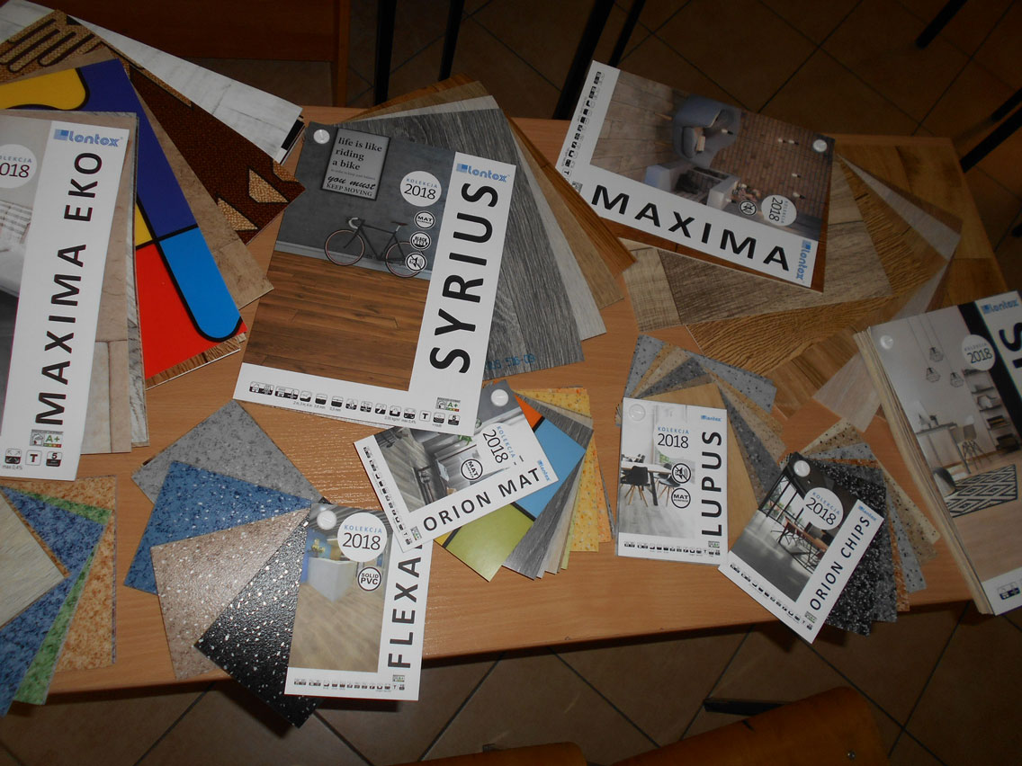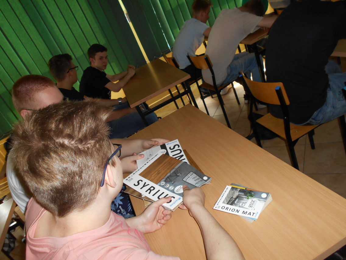 Prelegent omówił asortyment firmy wzbogacając swoją wypowiedź ciekawostkami i informacjami wynikającymi bezpośrednio z pracy w terenie. Liczne próbniki wykładzin pozwoliły młodzieży na lepsze zapoznanie się z bogatą ofertą wykładzin mieszkaniowych i obiektowych, a przedstawione filmiki przybliżyły firmę i zobrazowały sposób wykonania podłóg z wykorzystaniem wykładzin z PVC. Na zakończenie prelekcji były upominki – firmowe długopisy i notatniki.