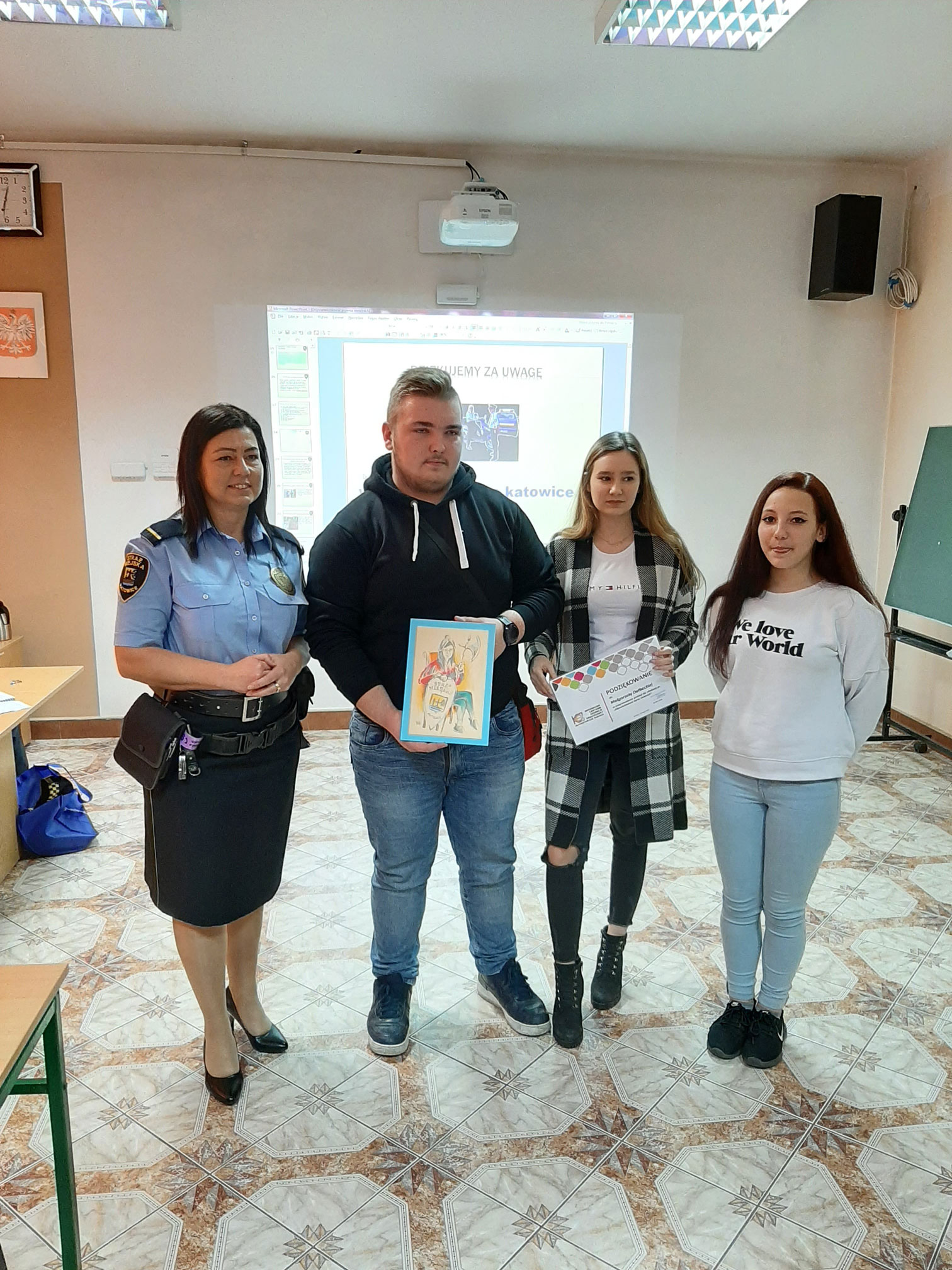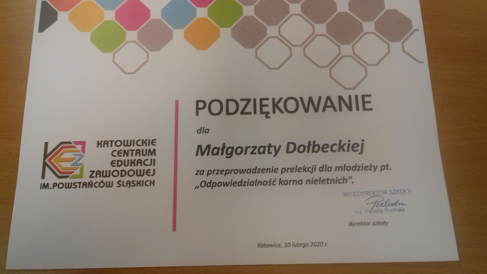 Głównym celem wykładu było zapoznanie młodzieży z obowiązującymi przepisami dotyczącymi odpowiedzialności prawnej nieletnich. Uczniowie mieli okazję porozmawiać na temat możliwych konsekwencji prawnych dla osób w ich wieku, za czyny wskazujące na demoralizację, wykroczenia oraz czyny karalne. W ramach podziękowania za współpracę oraz ciekawie przeprowadzone wykłady, uczniowie KCEZ uhonorowali panią Małgorzatę Dołbecką pamiątkowym portretem „Straż Katowic” wykonanym przez