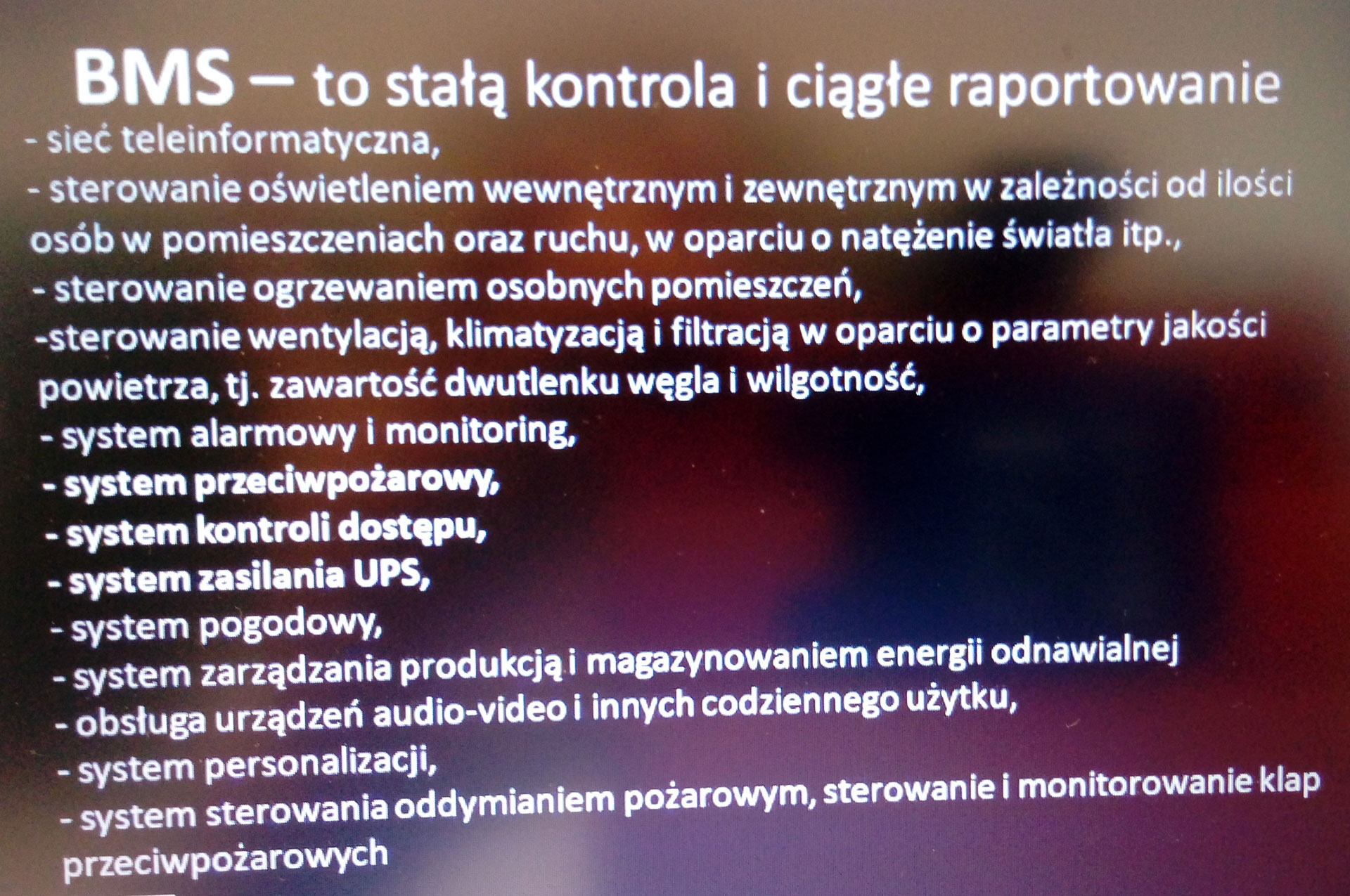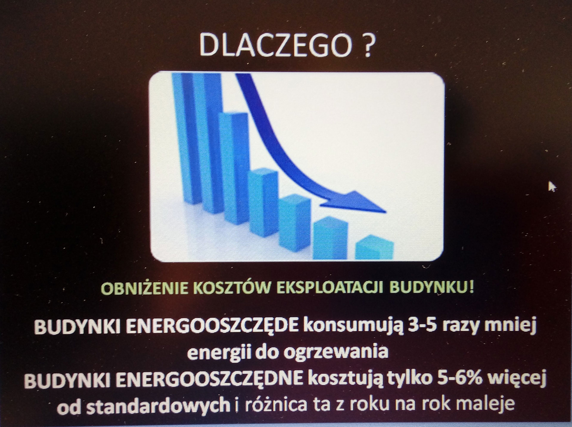 Przedstawione zostały także założenia domów energooszczędnych, niskoenergetycznych, pasywnych czy też domów zeroenergetycznych i o dodatnim bilansie energetycznym z konkretnymi przykładami, również z naszego regionu. Na kolejnych omawianych slajdach – przykładach można było zobaczyć jakimi drogami „cieka” ciepło z budynku i jak można tego uniknąć, np. zmieniając bryłę budynku pod względem architektonicznym. Część miejsca na wykładzie została poświęcona systemowi BMS i budynkowi „inteligentnemu”.