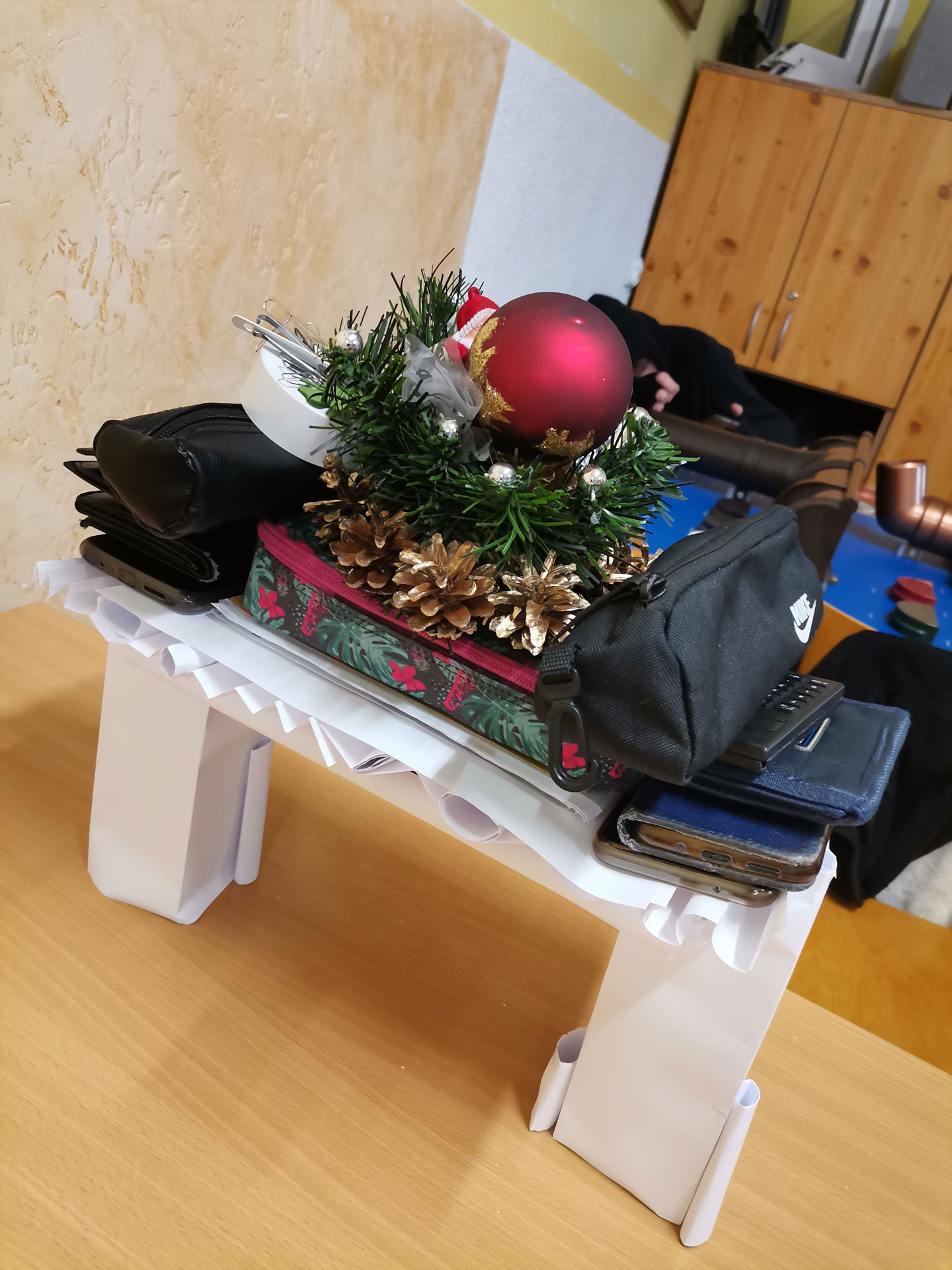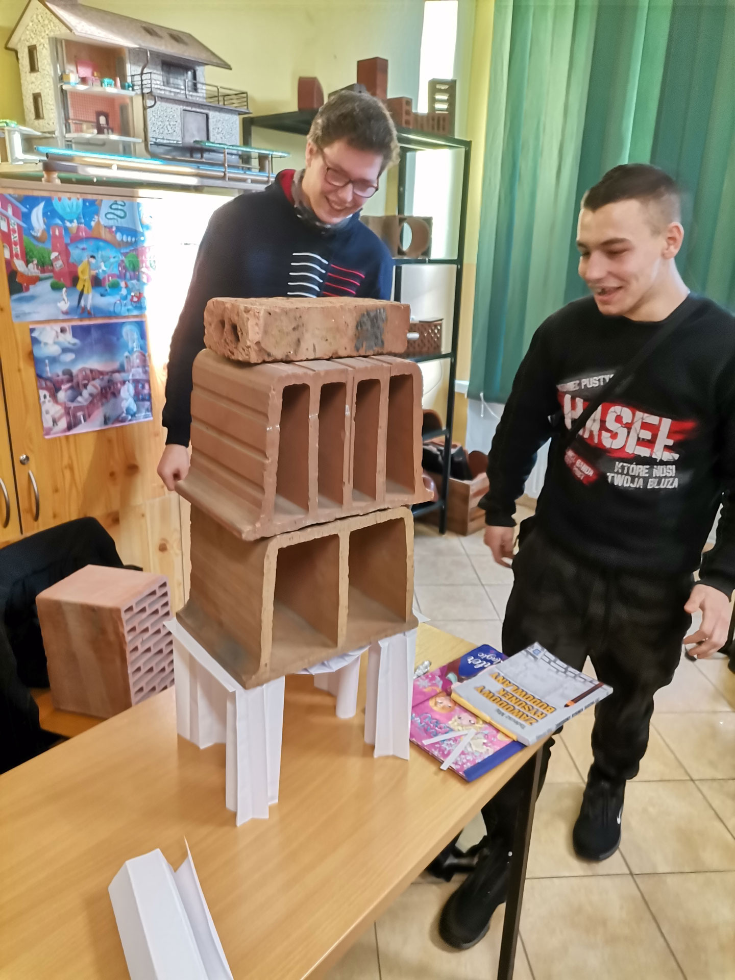 Niewątpliwie najwięcej radości i najbardziej zaangażowana była grupa z klasy branżowej, którzy sprawdzali nośność swoich mostów nie tylko pilotem, ale również pustakami i cegłami ceramicznymi czy też wykorzystując wszystkie dostępne piórniki, telefony komórkowe ze zwieńczeniem świątecznym stroikiem.