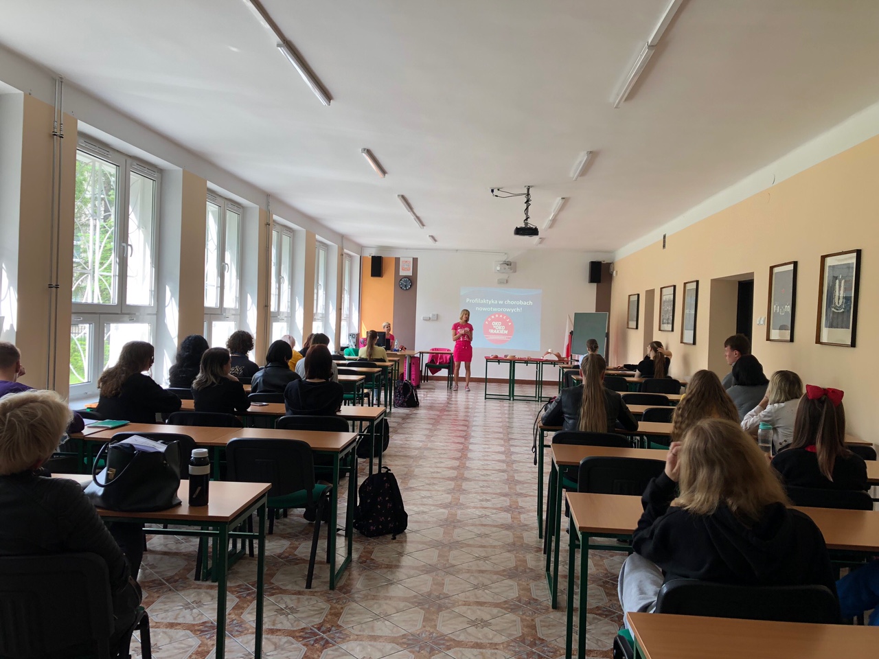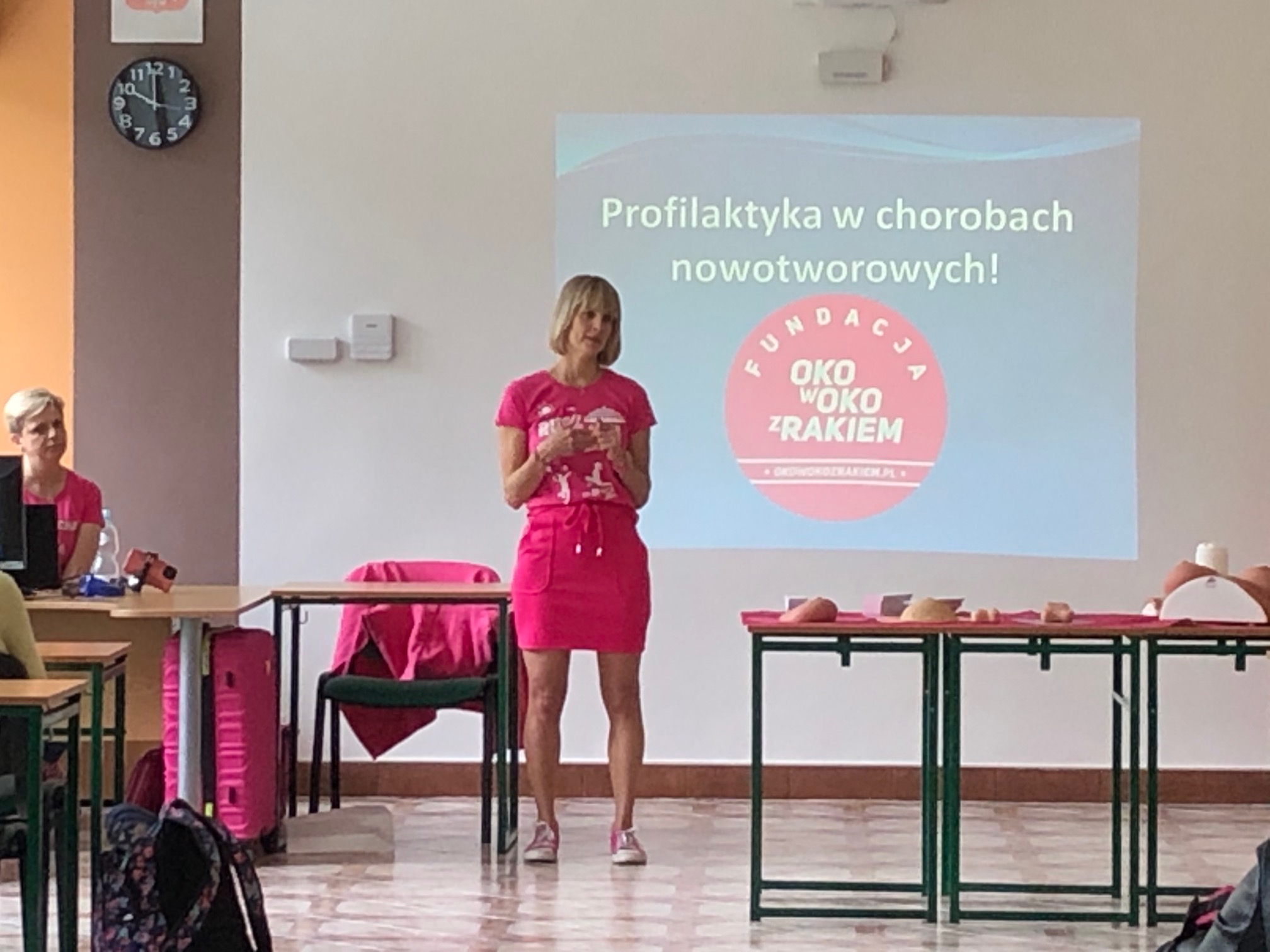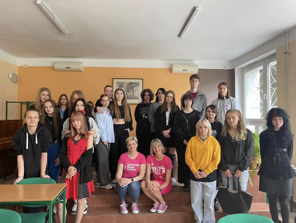 2 czerwca 2022 r. uczniowie naszej szkoły spotkali się z panią Justyną Dec oraz panią Anną Grabarczyk, przedstawicielkami Fundacji Oko w Oko z Rakiem. Młodzież z ogromnym zainteresowaniem wysłuchała wykładu na temat profilaktyki raka, a następnie przy pomocy fantomów uczyła się, jak badać piersi i jądra. To było bardzo wartościowe spotkanie.