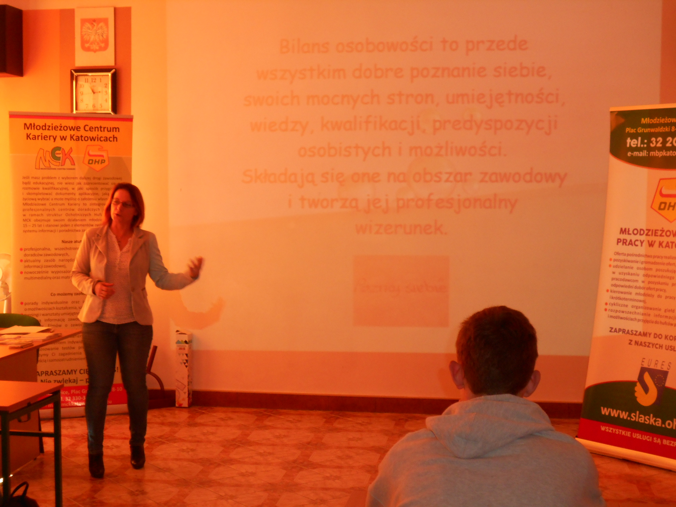 W czasie prelekcji młodzież dowiedziała się : jak poszukiwać pracy, na co zwraca uwagę pracodawca, jakich oczekuje kompetencji od przyszłego pracownika, jak dokonać bilansu swoich umiejętności i kwalifikacji. Wśród udostępnionych materiałów znalazły się m.in. testy: Kluczowe kompetencje i Umiejętności, które warto rozwijać dla lepszego funkcjonowania we współczesnym świecie a także ćwiczenia dotyczące kompetencji zawodowych i charakteru.