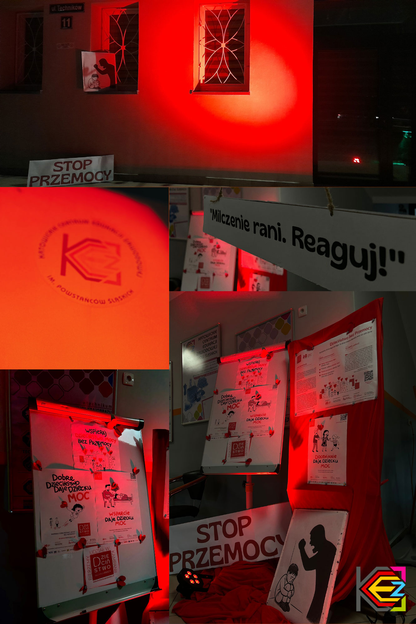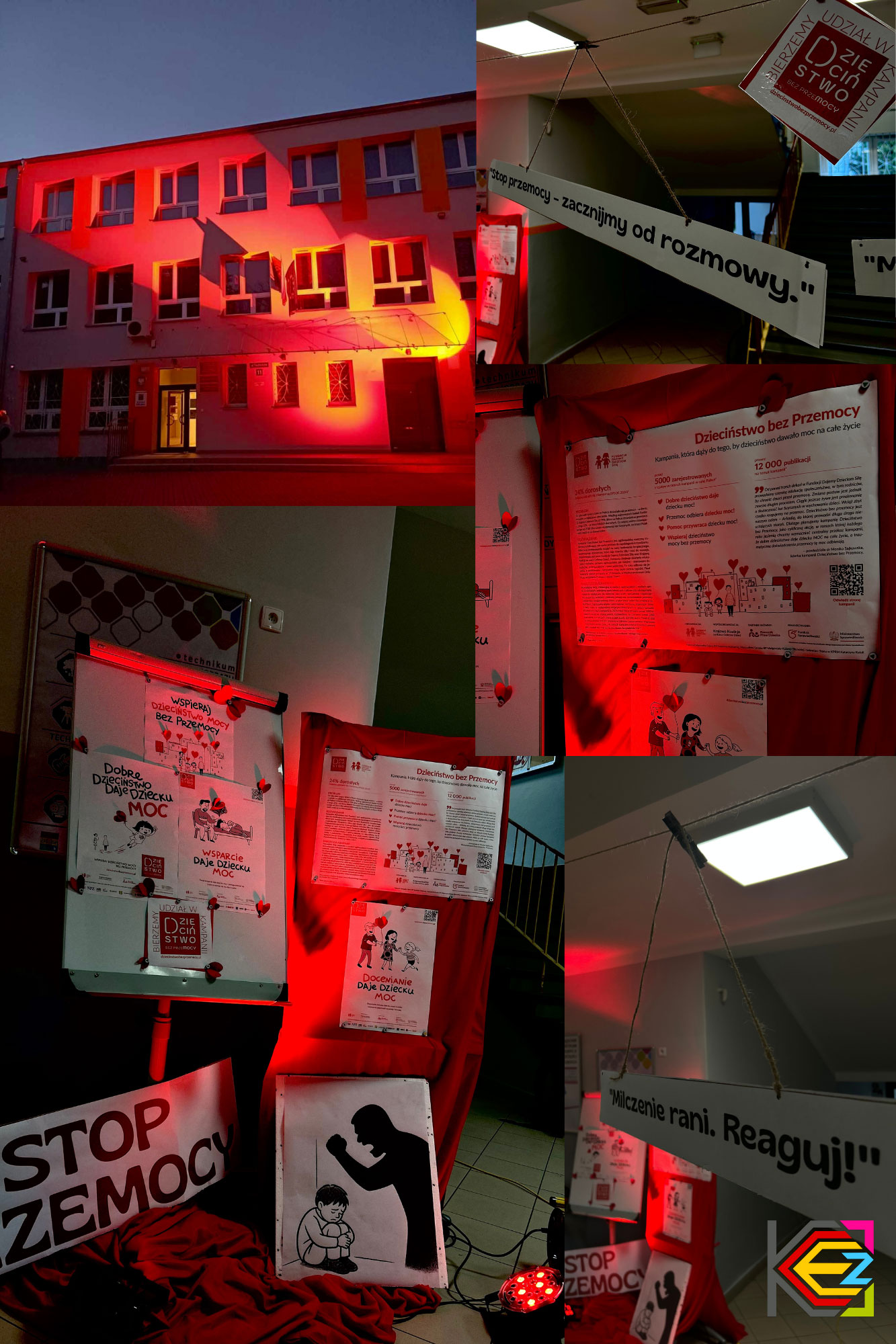 Dodatkowo w szkole podejmowane były działania edukacyjne i profilaktyczne uwrażliwiające społeczność szkolną na problem przemocy wobec dzieci. Zaangażowana w działania młodzież przygotowała gazetkę profilaktyczną, którą umieszczono na szkolnym holu. Szczególnym momentem kampanii był dzień 19 listopada – Międzynarodowy Dzień Przeciwdziałania Przemocy wobec Dzieci, kiedy to budynek naszej szkoły został podświetlony na czerwono, symbolicznie podkreślając solidarność z dziećmi doświadczającymi przemocy.