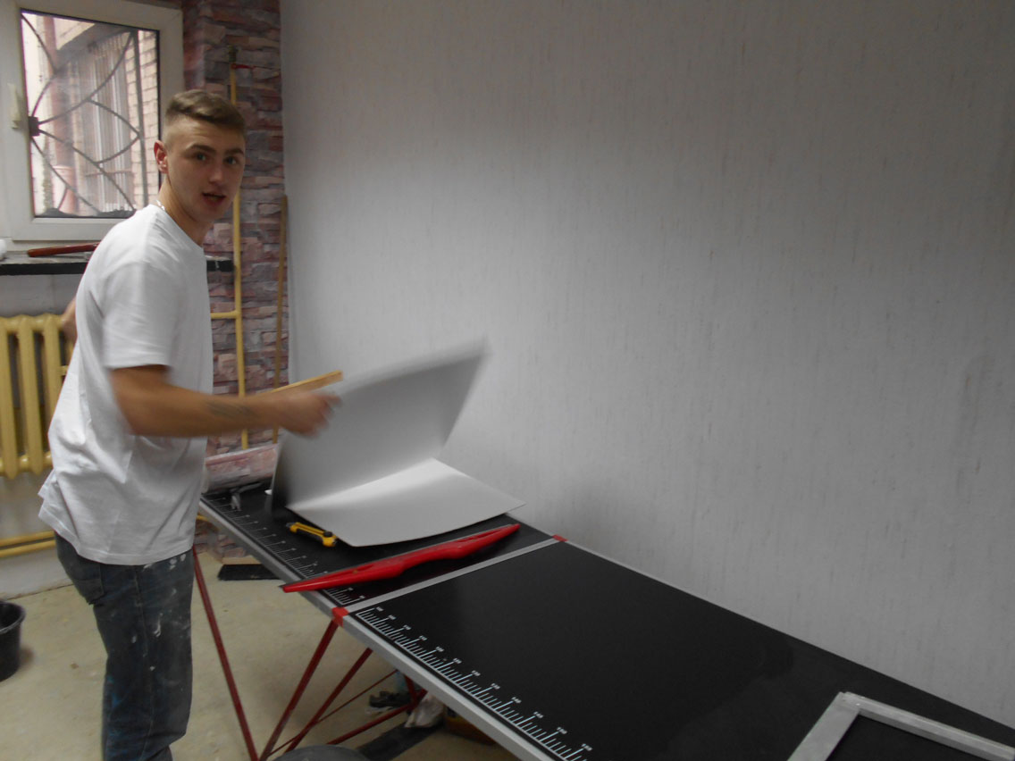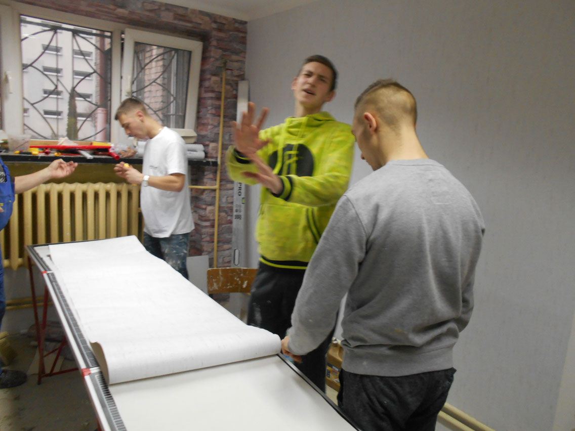 Inna grupa uczniów w sali, gdzie odbywają się budowlane zajęcia praktyczne (i już wkrótce przystąpią do egzaminu praktycznego B.06) zmagała się z tapetami z raportem, tzn. musieli odpowiednio dociąć bryty tapet, aby uzyskać zgodność wzoru.