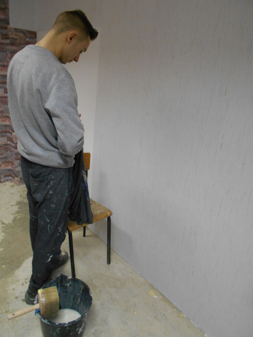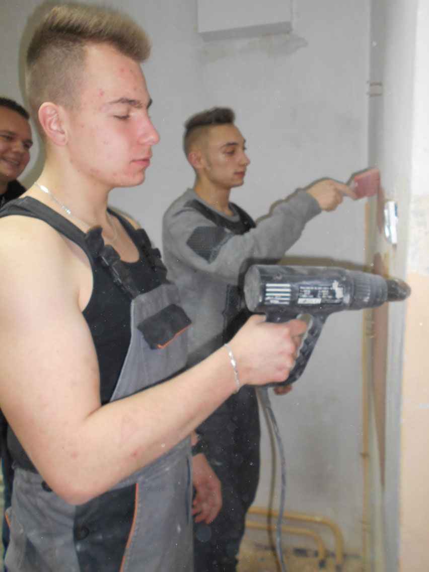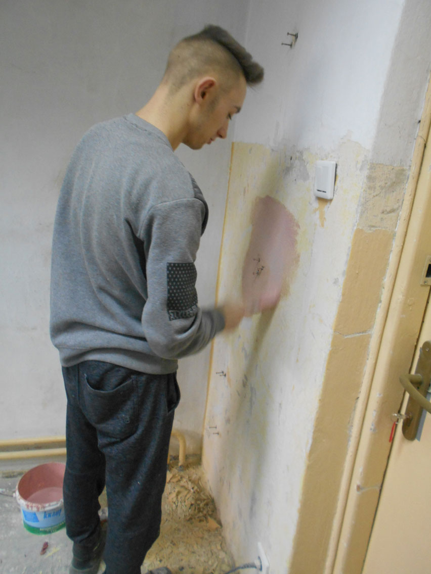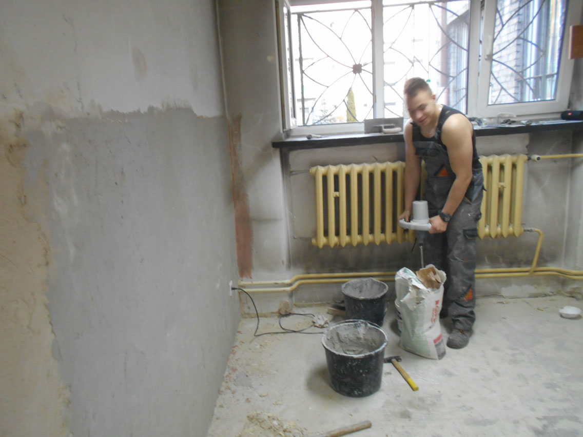 Uczniowie zajęli się oczyszczeniem ścian z dawnych wymalowań, uzupełnili ubytki i wyrównali ściany oraz sufit.