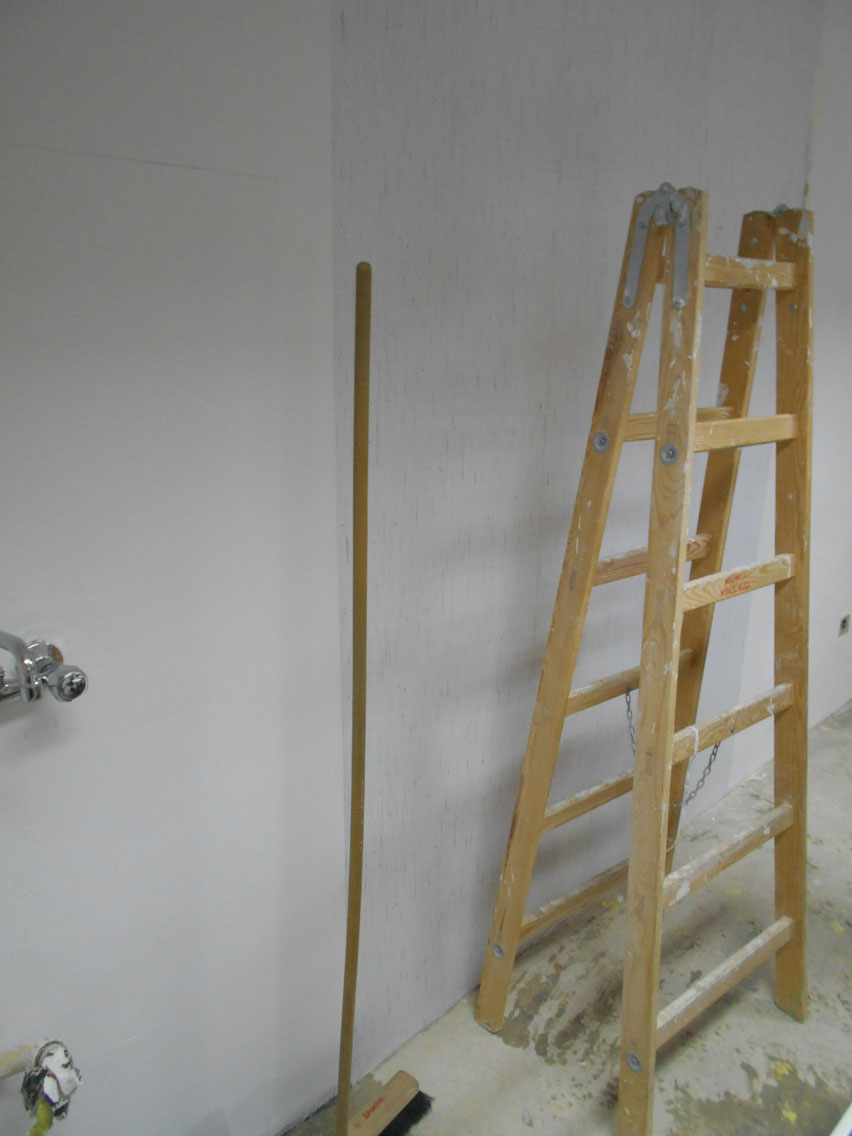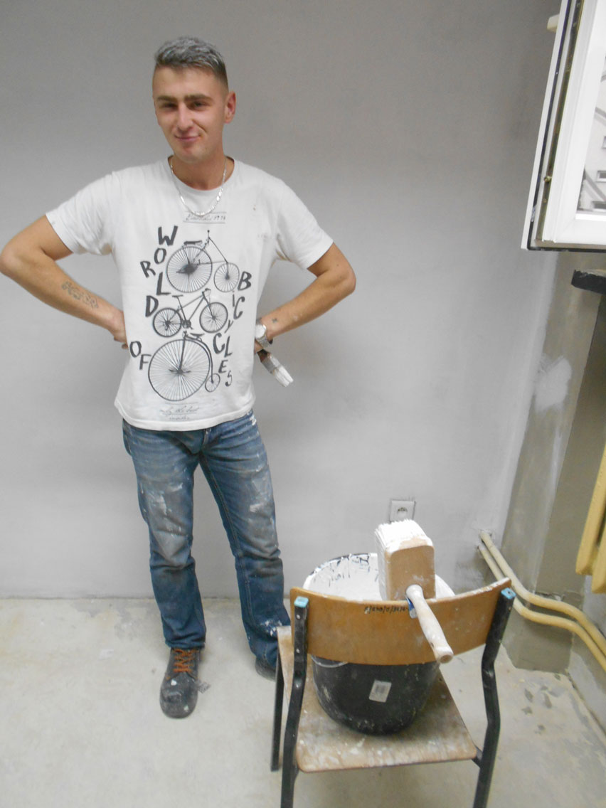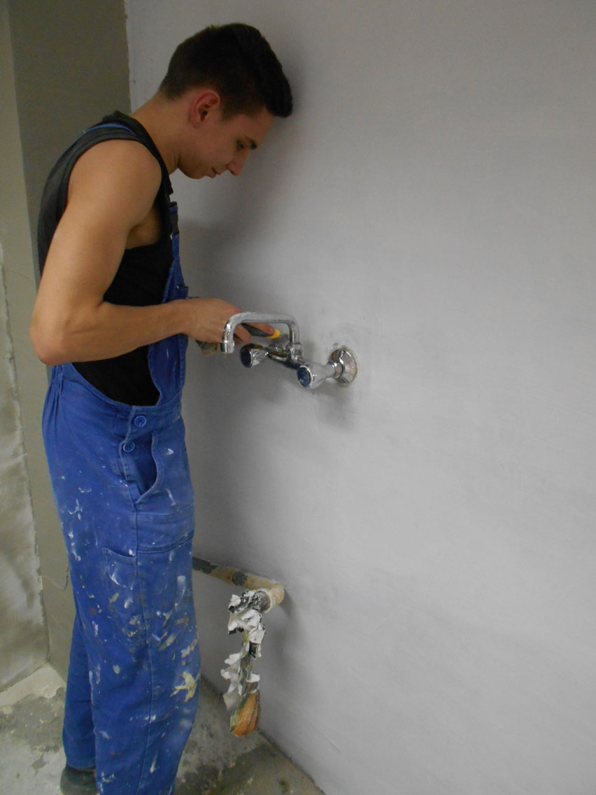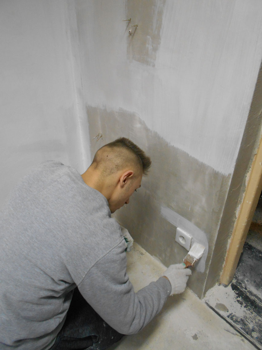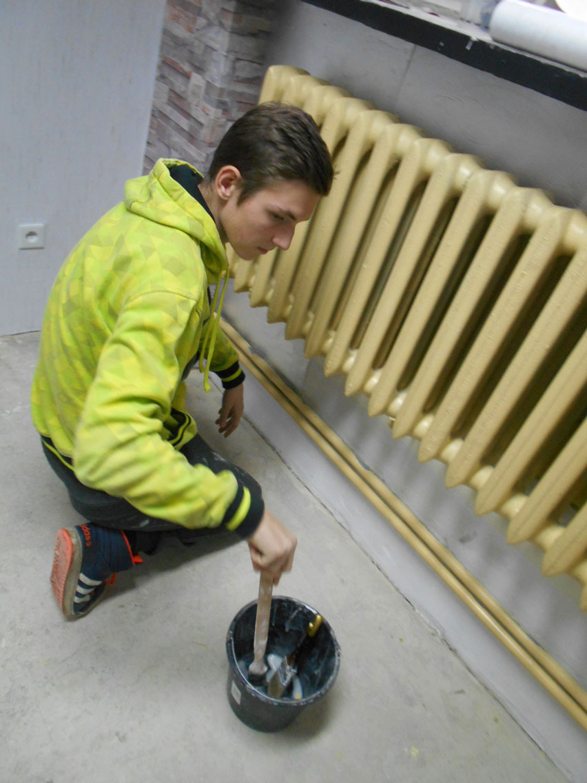 Uczniowie zajęli się oczyszczeniem ścian z dawnych wymalowań, uzupełnili ubytki i wyrównali ściany oraz sufit.