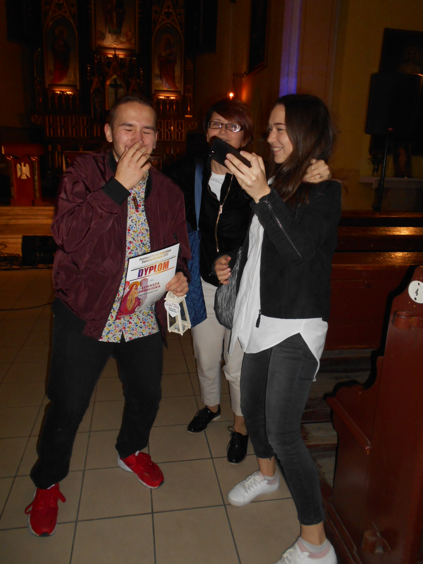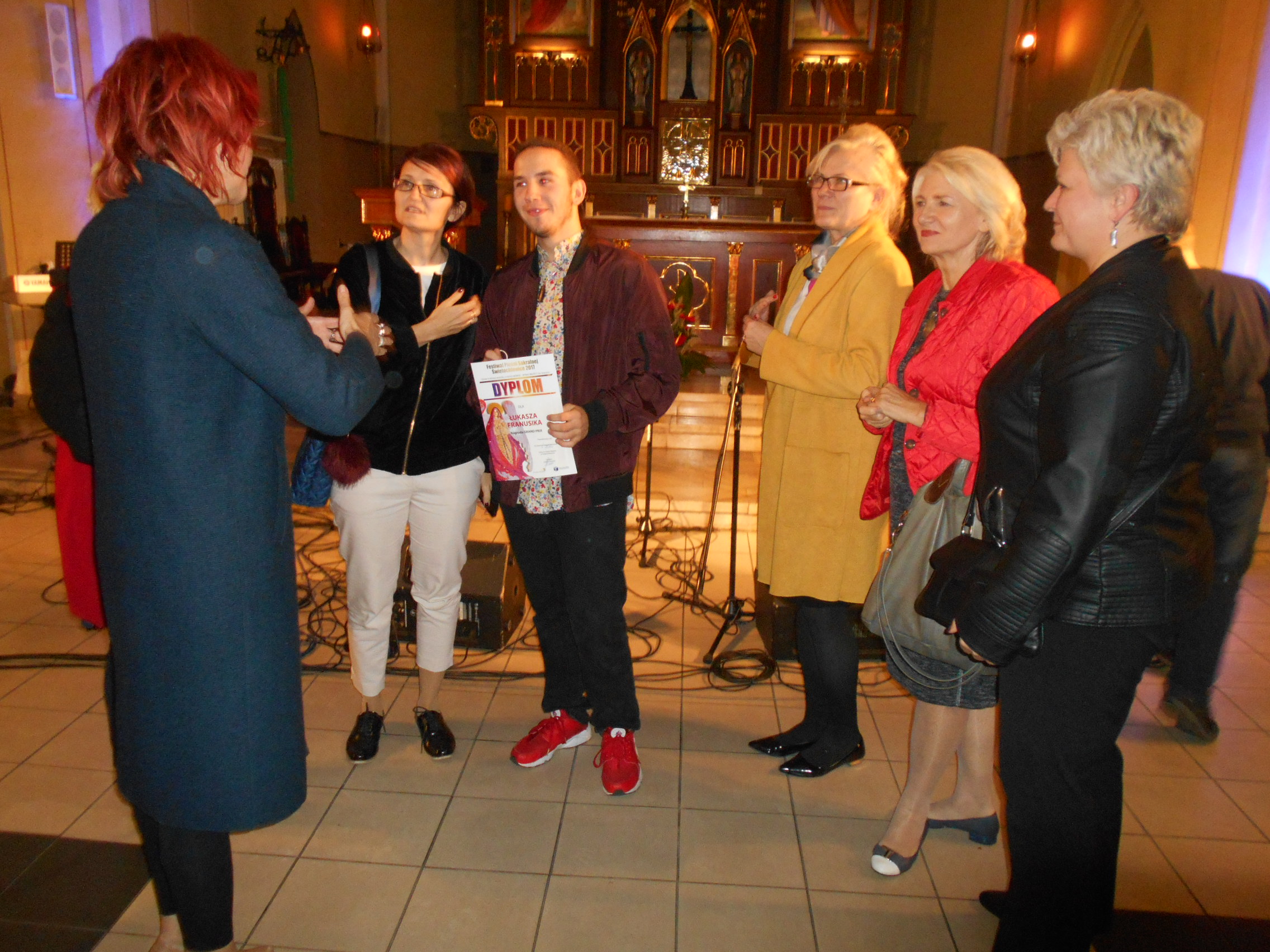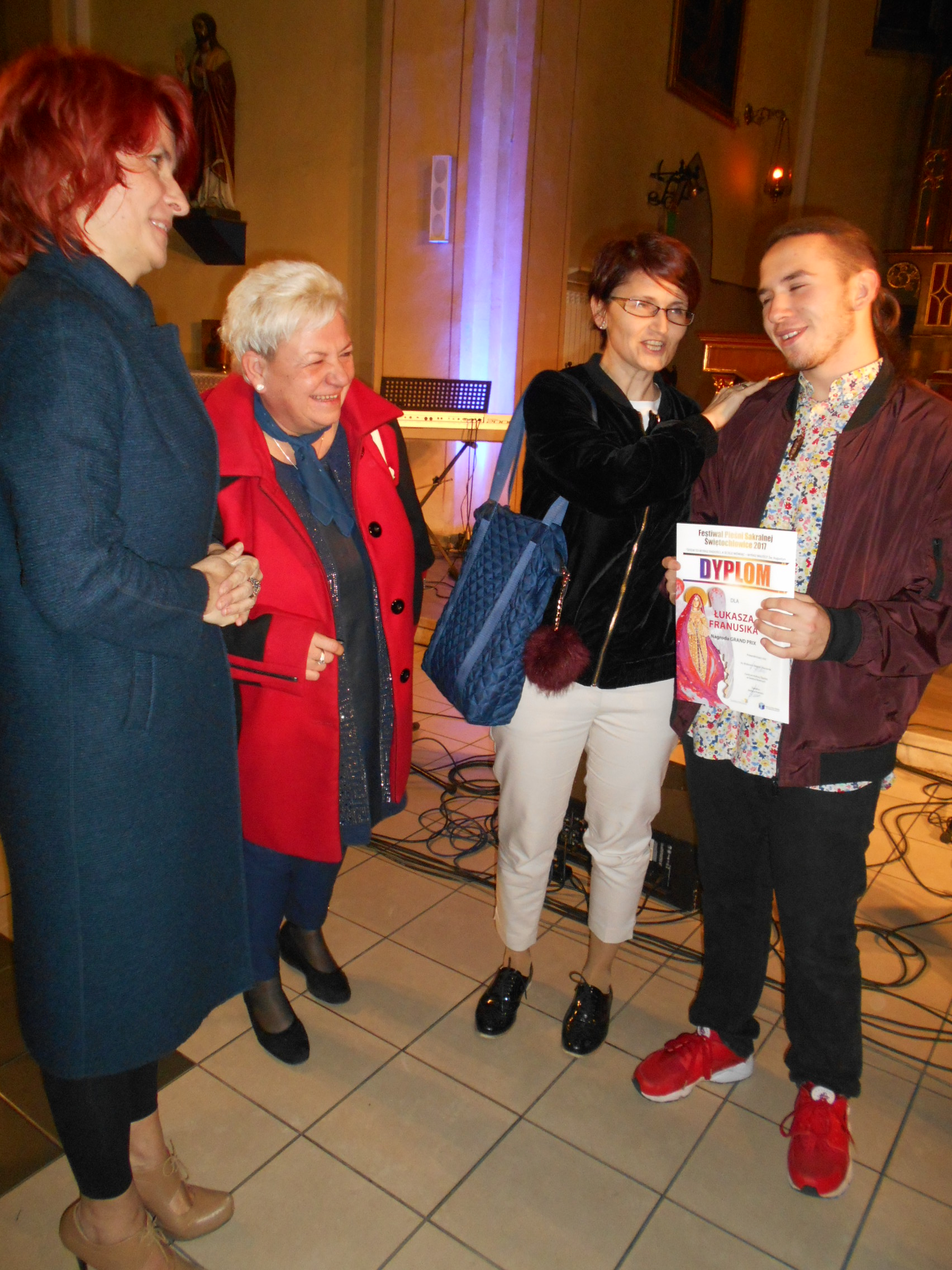 Laureaci konkursu 15.10.2017 r. w Kościele pw. św. Augustyna w Świętochłowicach-Lipinach zaprezentowali po jednej piosence – pieśni w kategoriach: chór, schola, zespół, soliści oraz otrzymali nagrody ufundowane przez CKS w Świętochłowicach i proboszcza parafii św. Augustyna. „Rozmowa z Bogiem” zaprezentowana przez Łukasza w rytmie rapu zdobyła uznanie zarówno jury, jak i zgromadzonej publiczności. Niekonwencjonalne podejście do tematyki religijnej zaprezentowane przez Łukasza zwróciło uwagę organizatorów kolejnych imprez muzycznych więc należy oczekiwać, że będziemy mogli go oklaskiwać już niedługo i pewnie nie raz. Gratulacje odbierał nie tylko od mamy i promotorki – p. A. Koniarek, ale również od reprezentacji Grona Pedagogicznego na czele z p. V- wicedyrektor – V. Puchała, wychowawczynią – p. A. Sarną oraz p. H. Chlebowską i U. Strugała. Życzymy Łukaszowi kolejnych nagród oraz powiększającej się rzeszy fanek i fanów.