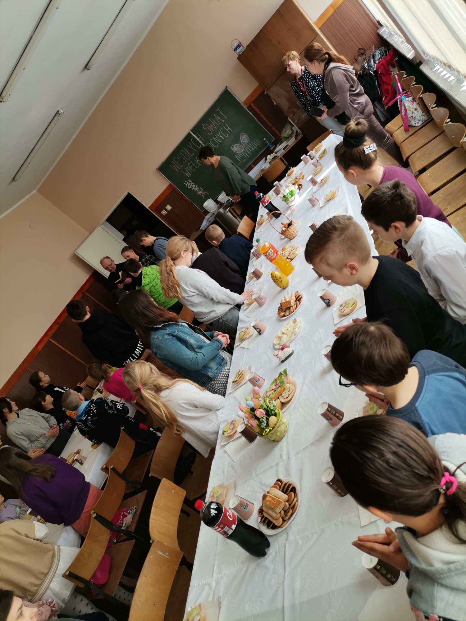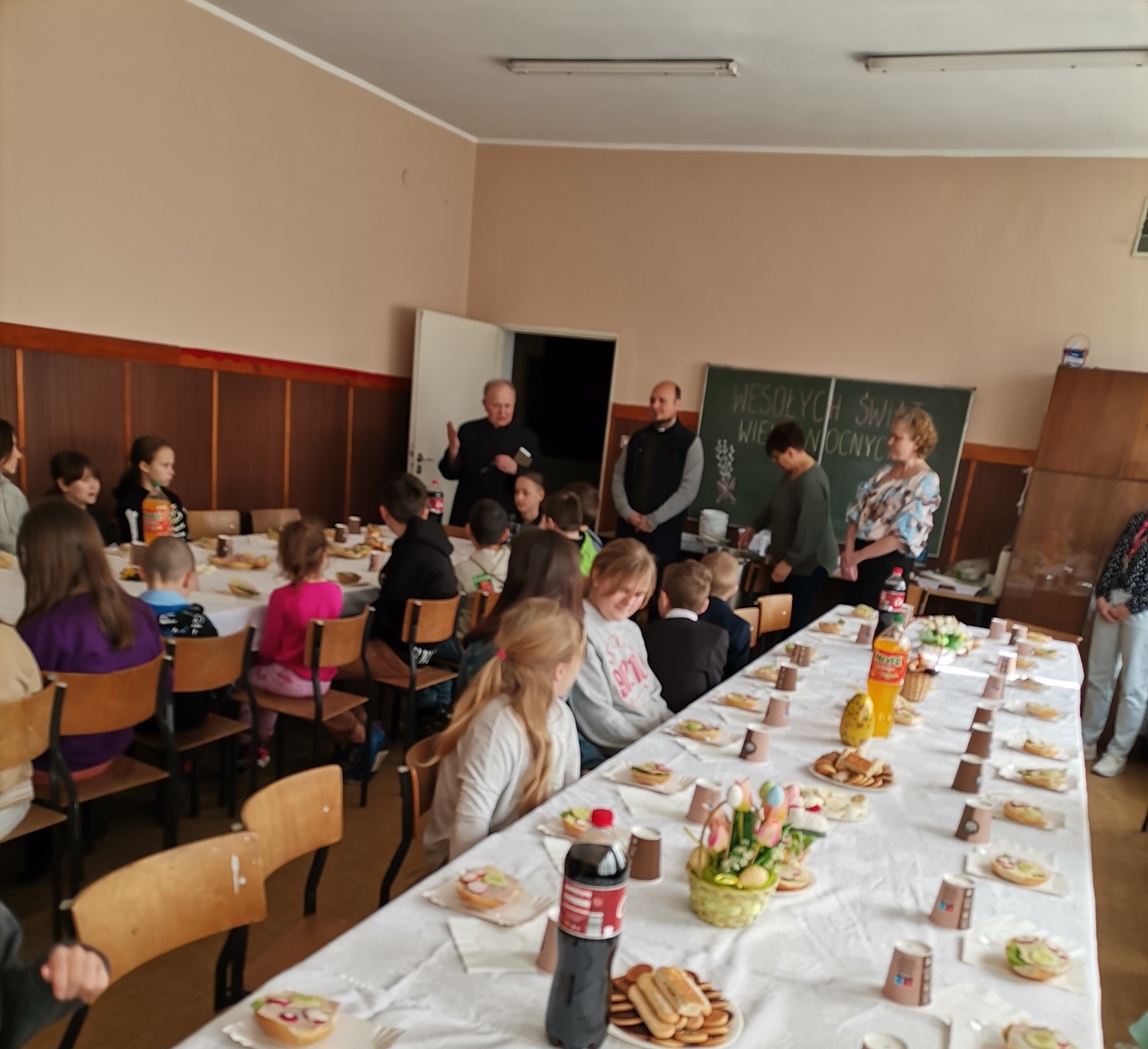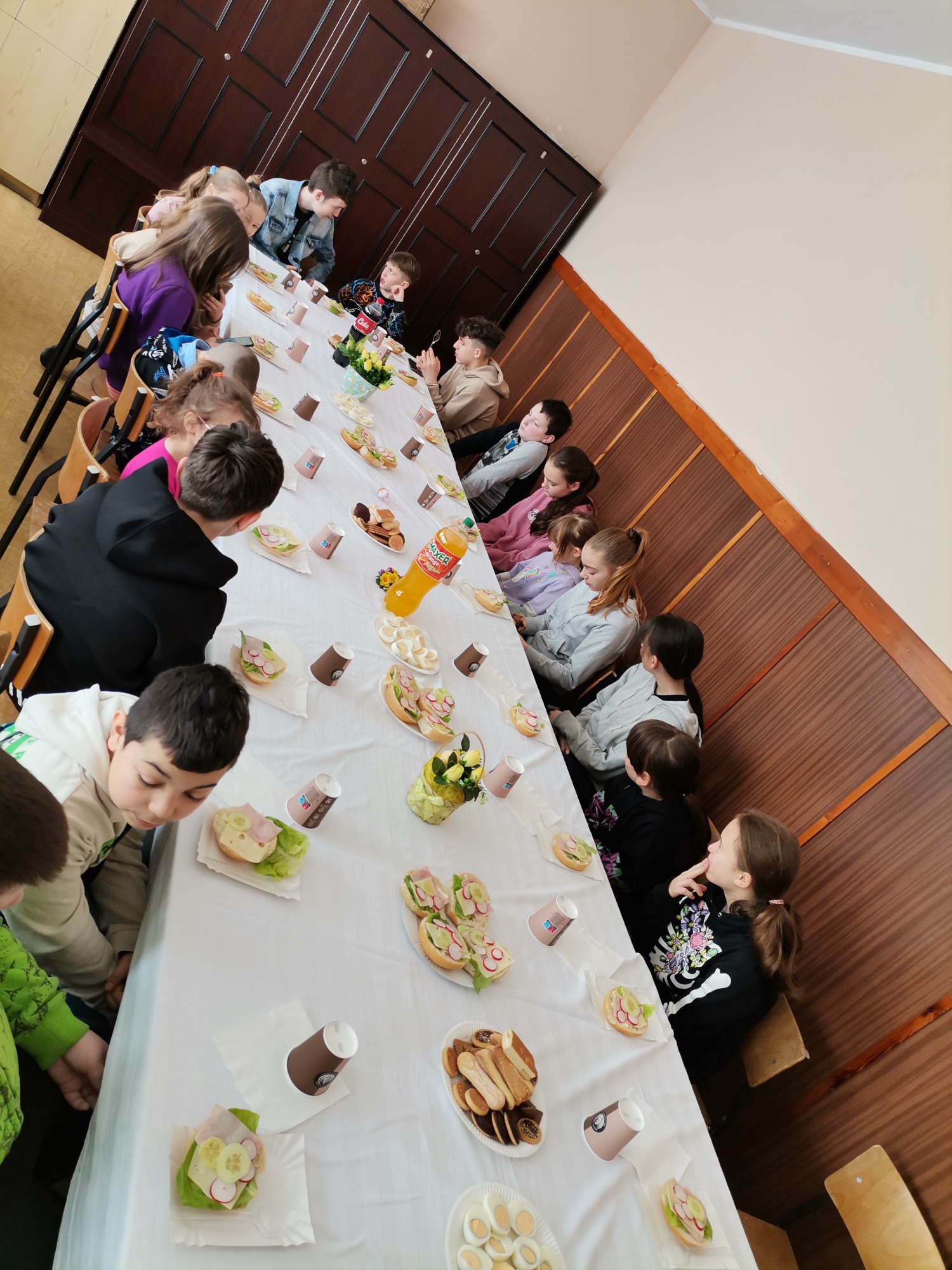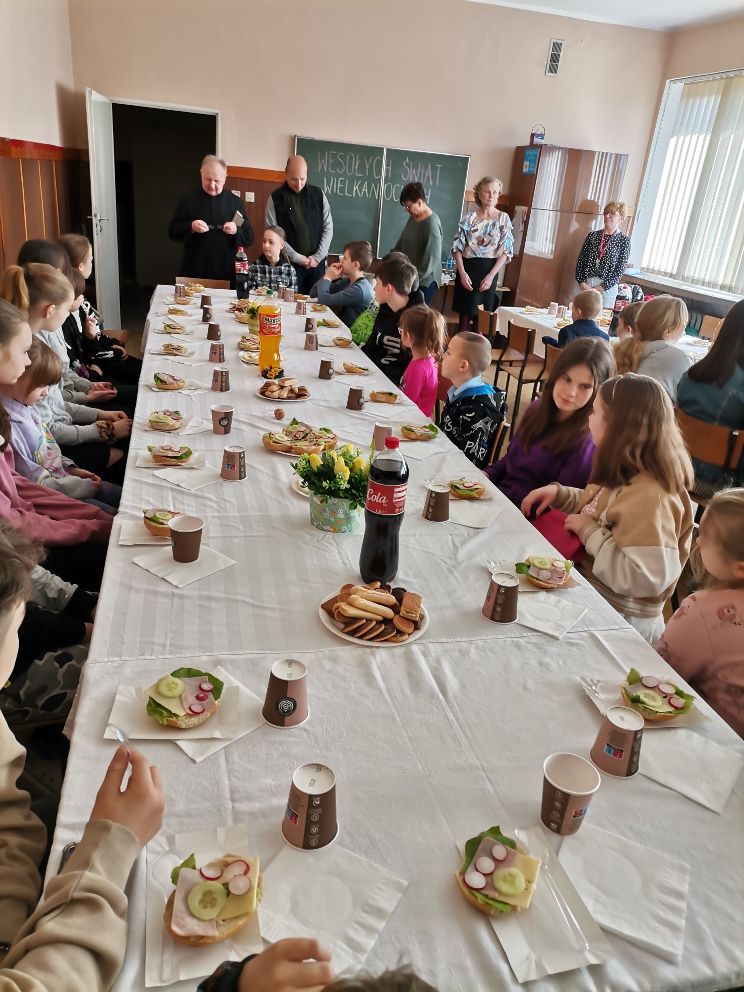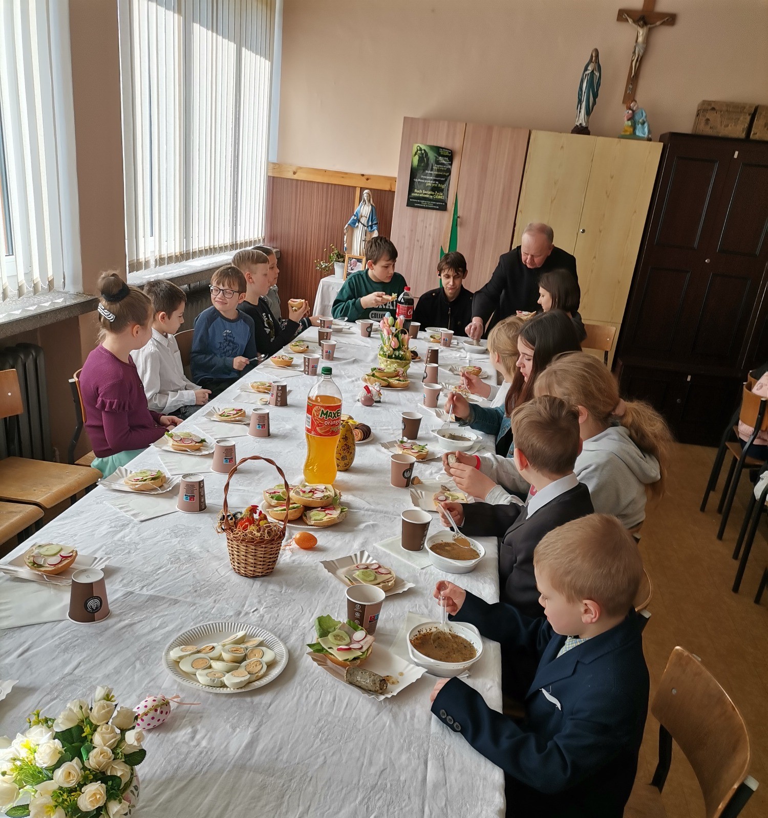 W sobotę 23 marca 2024 r. odbyło się Wielkanocne Śniadanko dla dzieci z parafii św. Antoniego w Dąbrówce Małej. Jak co roku młodzież z naszej szkoły, tym razem z klasy 4 Bp wzięła udział w przygotowaniach do tego wydarzenia przygotowując do śniadanka salkę w Domu Parafialnym. Wydarzenie poprowadził proboszcz parafii św. Antoniego – ks. A. Noras wraz z wikariuszami. Po modlitwie i podzieleniu się jajkiem można było zacząć ucztować. Był żurek z jajkiem i kiełbaską, kanapki z szynka, ciasteczka. Na zakończenie dzieci otrzymały paczki ze słodkościami. To był piękny akcent przed rozpoczynającym się świątecznym czasem.