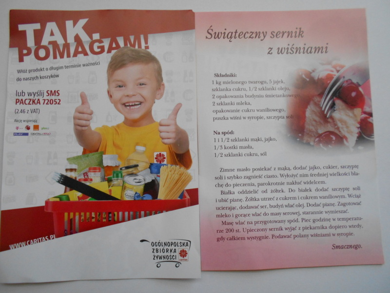 Uczniowie zachęcali do dzielenia się produktami żywnościowymi klientów Carrefoura wręczając ulotki informacyjne o akcji wraz z przepisami na świąteczne ciasto. Z zebranych produktów parafialne koła Caritas przygotują świąteczne paczki dla rodzin i osób potrzebujących.
