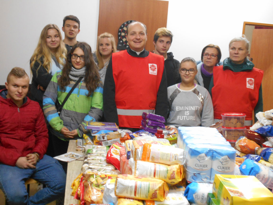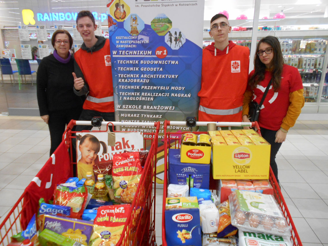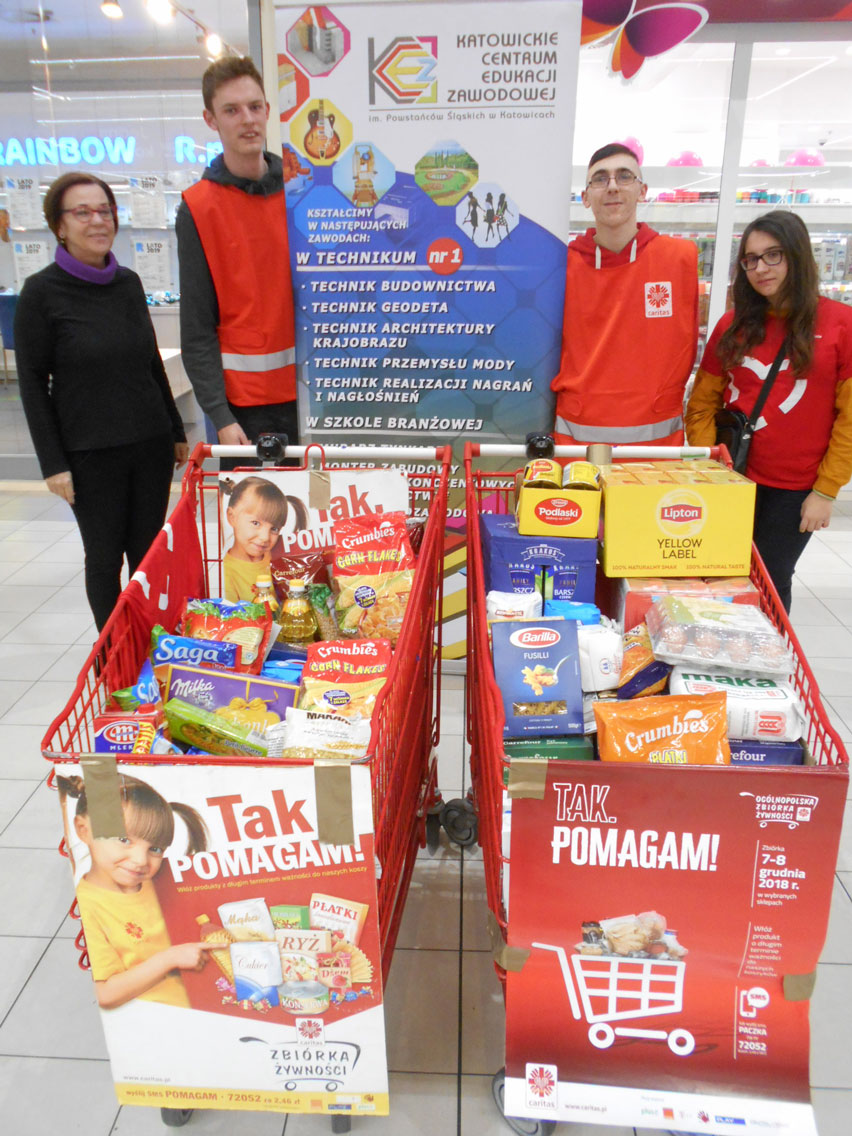 W piątek 7.12.2018 r i sobotę 8.12.2018 r młodzież z KCEZ i ubiegłoroczni absolwenci oraz nauczyciele zachęcali kupujących do włączenia się w akcję poprzez włożenie do koszyków produktów z długim terminem ważności takich jak: mąka, cukier, ryż, kasza, olej, konserwy, herbata, słodycze itp. Z zebranych przez młodzież KCEZ i gimnazjum w Carrefour i 2 Biedronkach produktów (500 kg) zostało przygotowanych 200 paczek dla najuboższych, chorych, samotnych, dzieci i seniorów z parafii św. Antoniego w Dąbrówce Małej. Dziękujemy!