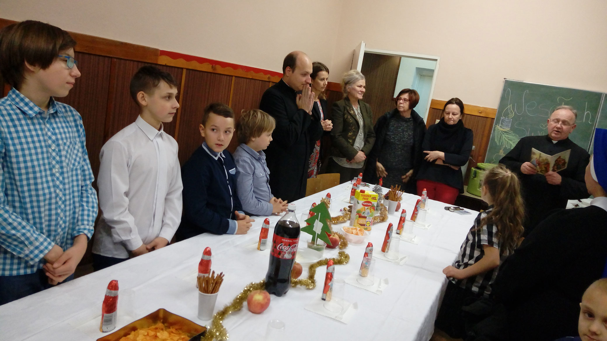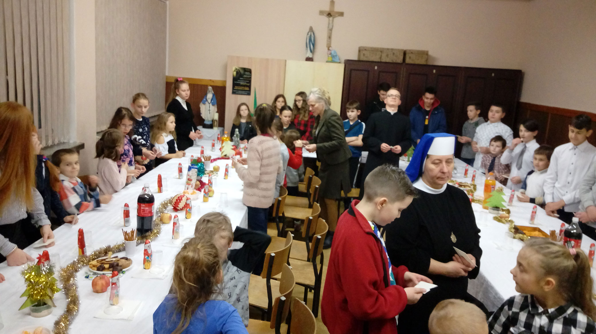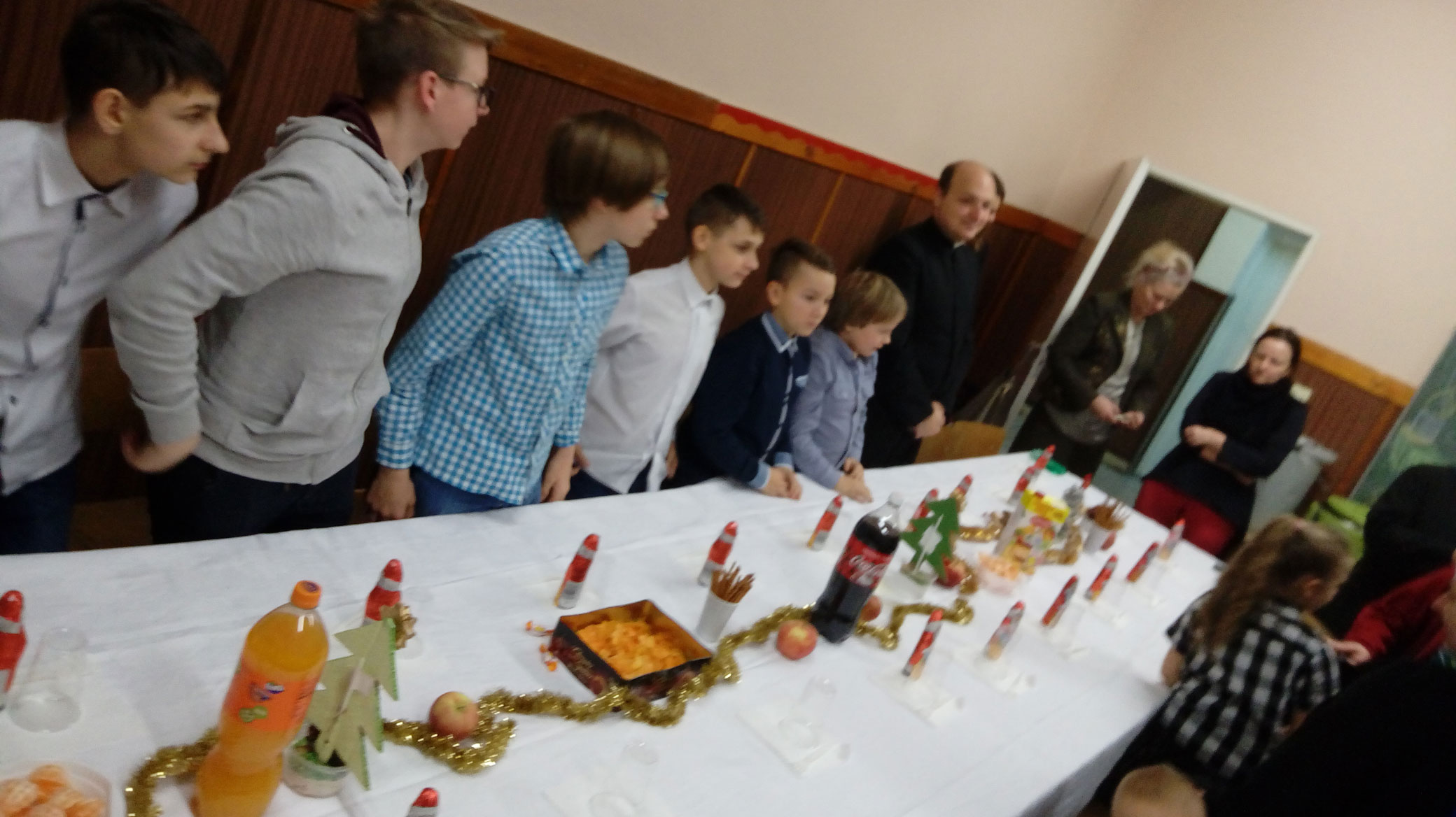 Wigilijnej Wieczerzy przewodniczył ks. Proboszcz A. Noras wraz z ks. wikariuszami: Łukaszem i Szymonem. Obecne także były panie katechetki: Ola K. i Danuta K., siostra M.Fidelis, nasze panie nauczycielki z KCEZ: Aneta K. i Urszula S.oraz pozostali Wolontariusze.
