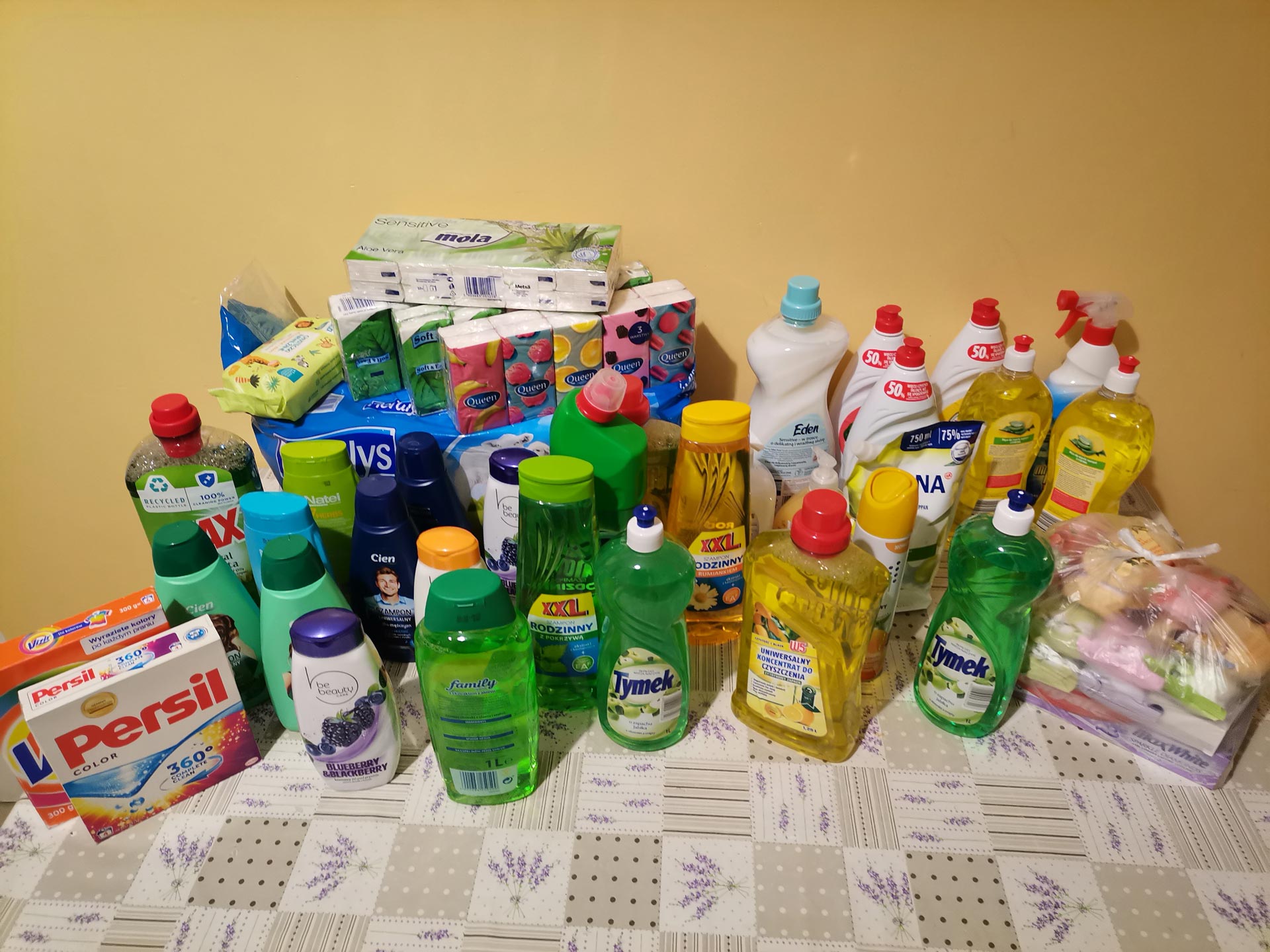 Zbiórka obejmowała środki czystości, m.in.: szampony, mydła, żele pod prysznic, pasty do zębów, chusteczki higieniczne, papier toaletowy, proszki do prania, a także płyny do mycia naczyń, środki do czyszczenia powierzchni, odświeżacz powietrza.
