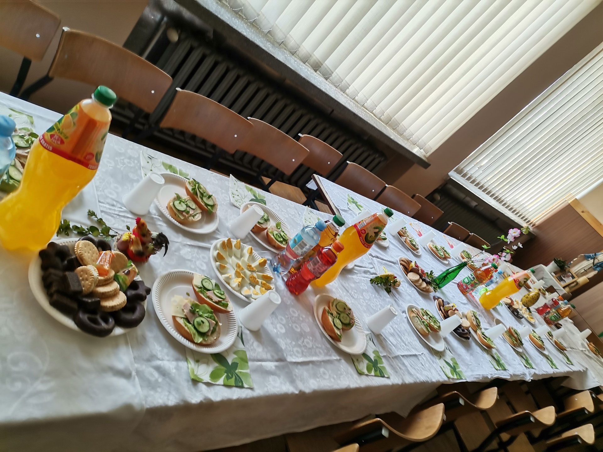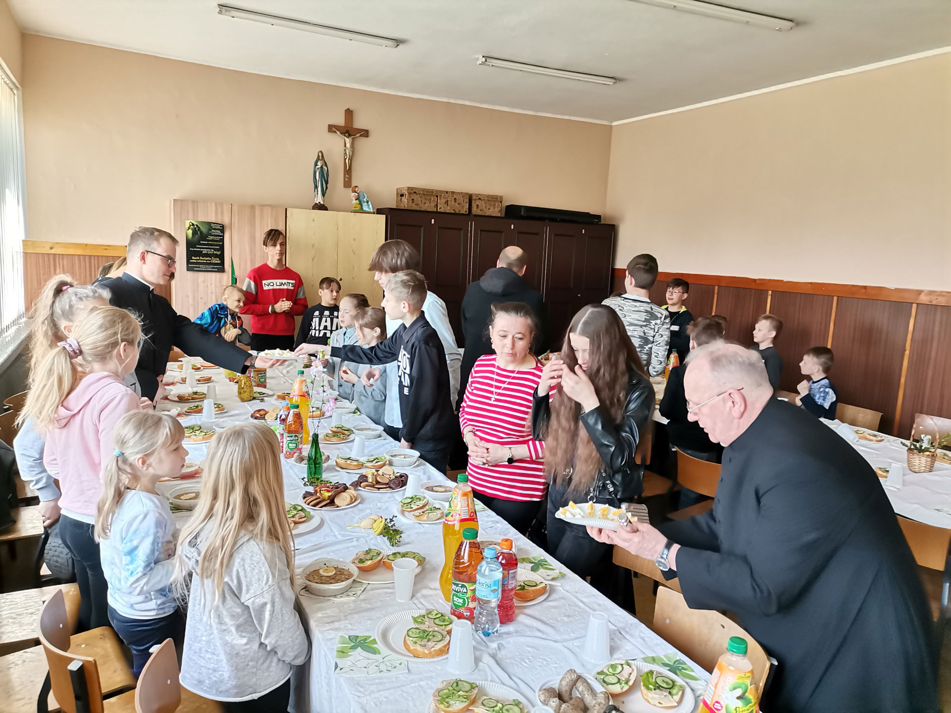 Po dwóch latach przerwy związanej z pandemią w parafii św. Antoniego do Dąbrówki Małej powróciło ,,Śniadanko Wielkanocne". W Wielki Czwartek o godz.9.00 50-cioro dzieci z naszej parafii zasiadło do obfitego śniadanka wielkanocnego. Na początku ks. Proboszcz wraz z księżmi wikariuszami odmówili modlitwę z błogosławieństwem pokarmów, następnie dzieliliśmy się poświęconym jajkiem. Tradycyjnie już był pyszny żurek z jajkiem i białą kiełbaską, który sponsoruje Karczma „Pod Młynem" oraz kanapki przygotowane przez wolontariuszy, no i oczywiście słodycze, napoje. Na koniec każdy uczestnik otrzymał paczkę ze słodyczami.  Pięknie udekorowane stoły to zasługa młodzieży z kl.IV KCEZ: Basi, Dagmary, Bartka i Mateusza oraz dzieci z ZSP nr 3: Nikoli, Angeliki i Szymona wykonane pod czujnym okiem p. Uli i p.Oli.
