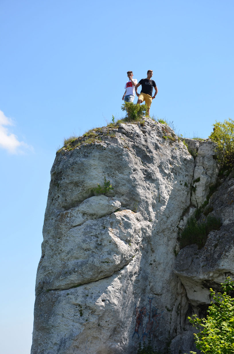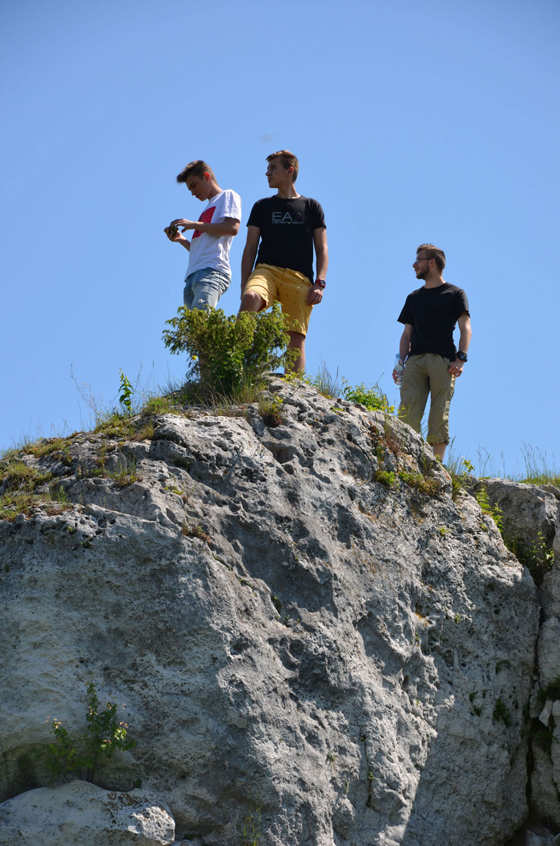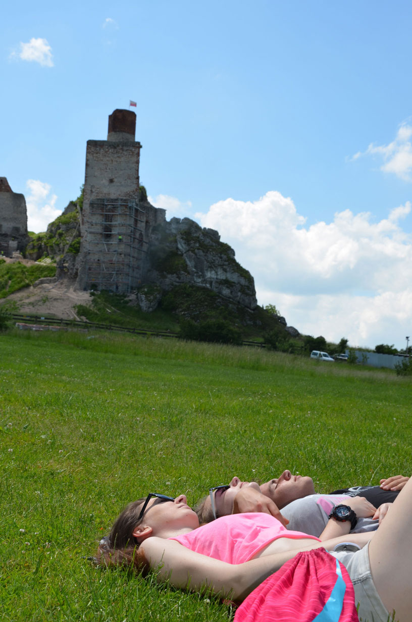 Dotarliśmy tam wędrując między ostańcami Gór Towarnych. Pod zamkiem odbyły się zawody o złotą łatę, w których nasi przyszli geodeci mogli wykazać się w kilku zabawnych konkurencjach takich jak: slalom z łatą, konkurs skeczów, szkicowanie z zamkniętymi oczami, podnoszenie pojemników ze sprzętem geodezyjnym oraz w całkiem poważnych pomiarach. A ponieważ pogoda dopisała, była dobra zabawa, grill, a dla chętnych kąpiele słoneczne z widokiem na zamek.
