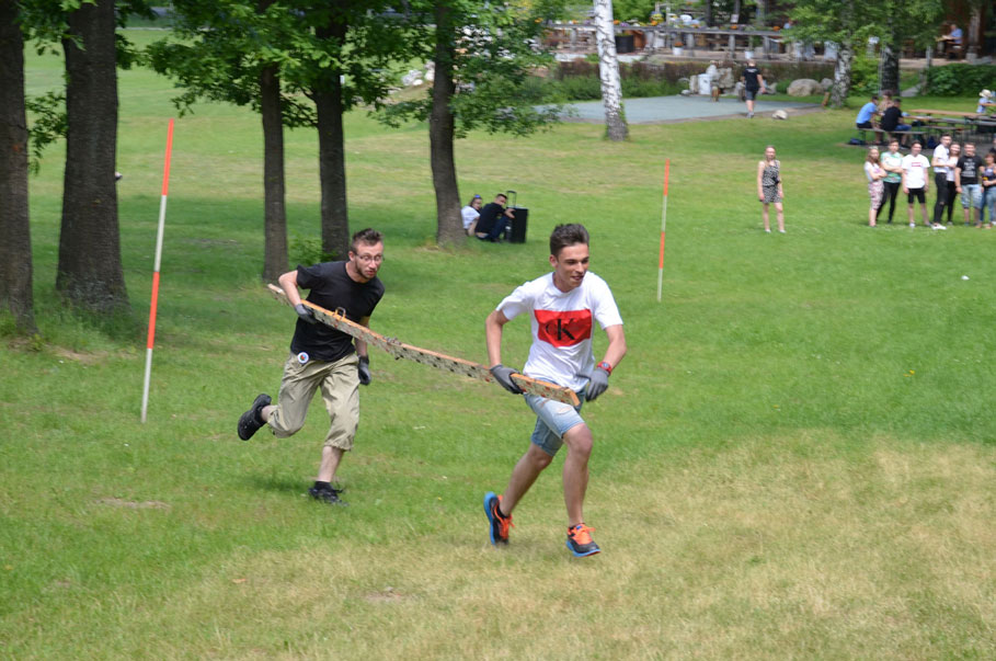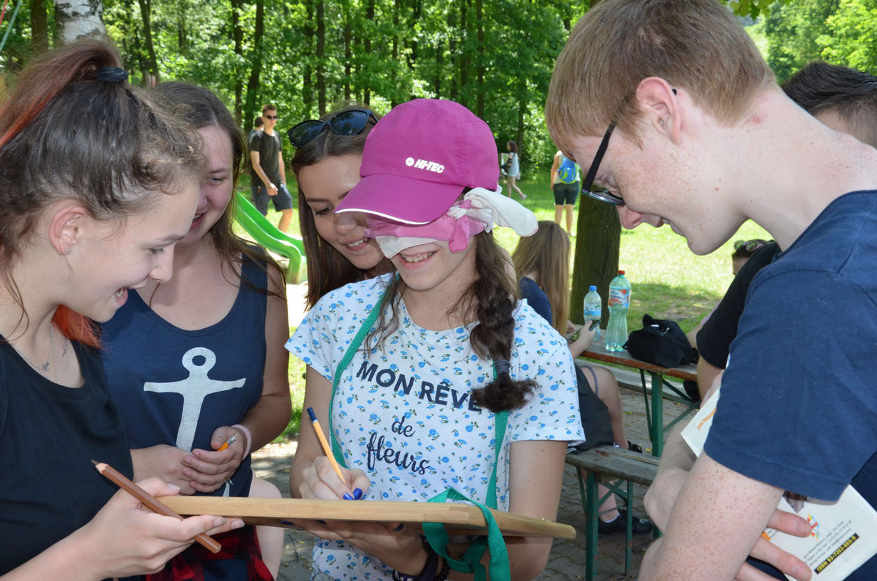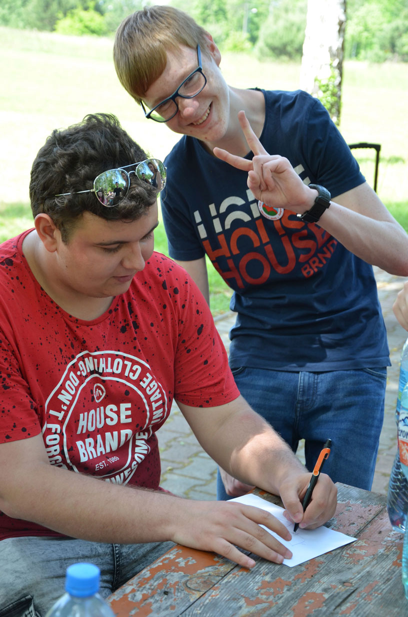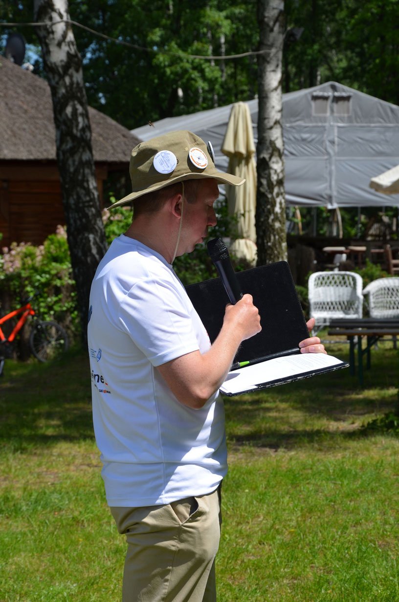 Dotarliśmy tam wędrując między ostańcami Gór Towarnych. Pod zamkiem odbyły się zawody o złotą łatę, w których nasi przyszli geodeci mogli wykazać się w kilku zabawnych konkurencjach takich jak: slalom z łatą, konkurs skeczów, szkicowanie z zamkniętymi oczami, podnoszenie pojemników ze sprzętem geodezyjnym oraz w całkiem poważnych pomiarach. A ponieważ pogoda dopisała, była dobra zabawa, grill, a dla chętnych kąpiele słoneczne z widokiem na zamek.
