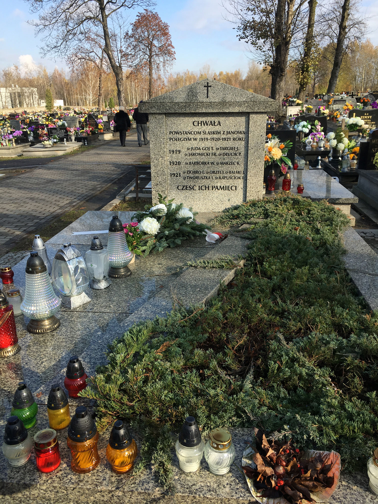 | Katowice | Katowice-Janów, ul.Cmentarna, cmentarz aleja centralna, strona prawa, rząd 11 | Grób zbiorowy wojenny poległych w czasie Powstań Śląskich – nazwiska -pom.nagr. |